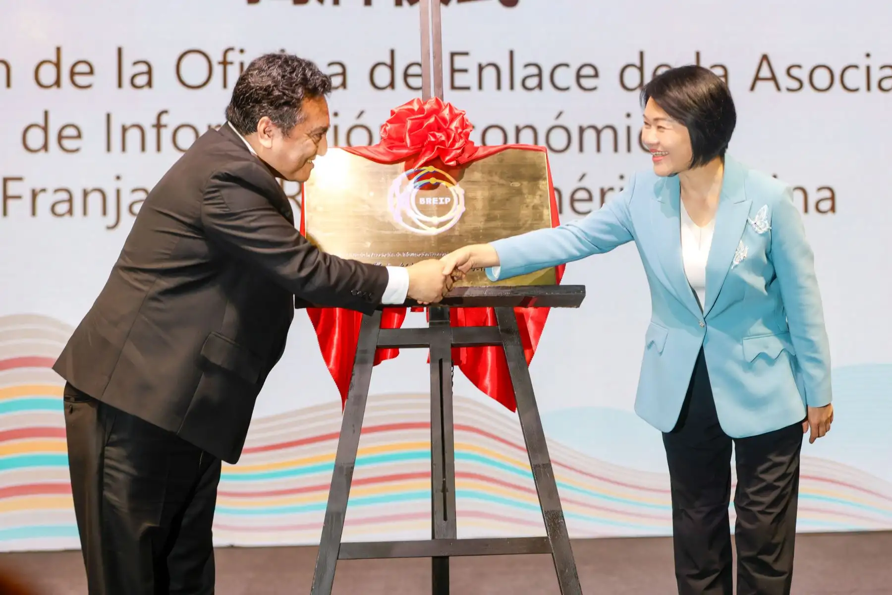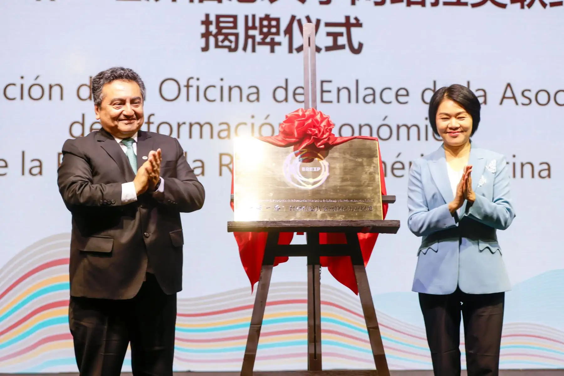 08/11/2024 Reunión Anual sobre la Cooperación Pragmática en el Marco de la Iniciativa de la Franja y la Ruta entre Perú y China. Xu Shanna, Secretaría adjunta de la agencia de noticias Xinhua y Félix Paz, director de la Agencia Andina de Noticias, develan placa recordatoria. Foto: ANDINA/Luis Iparraguirre
