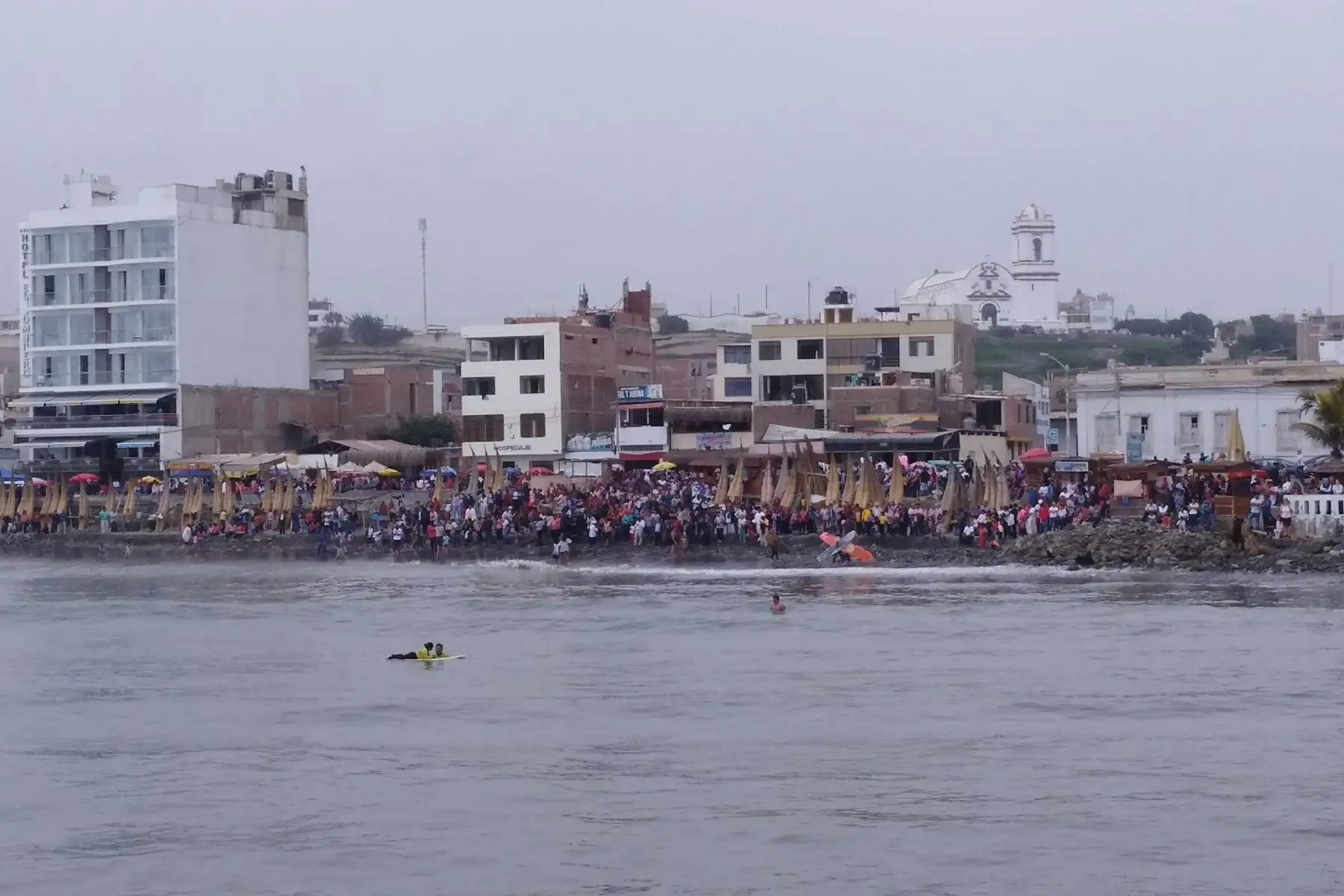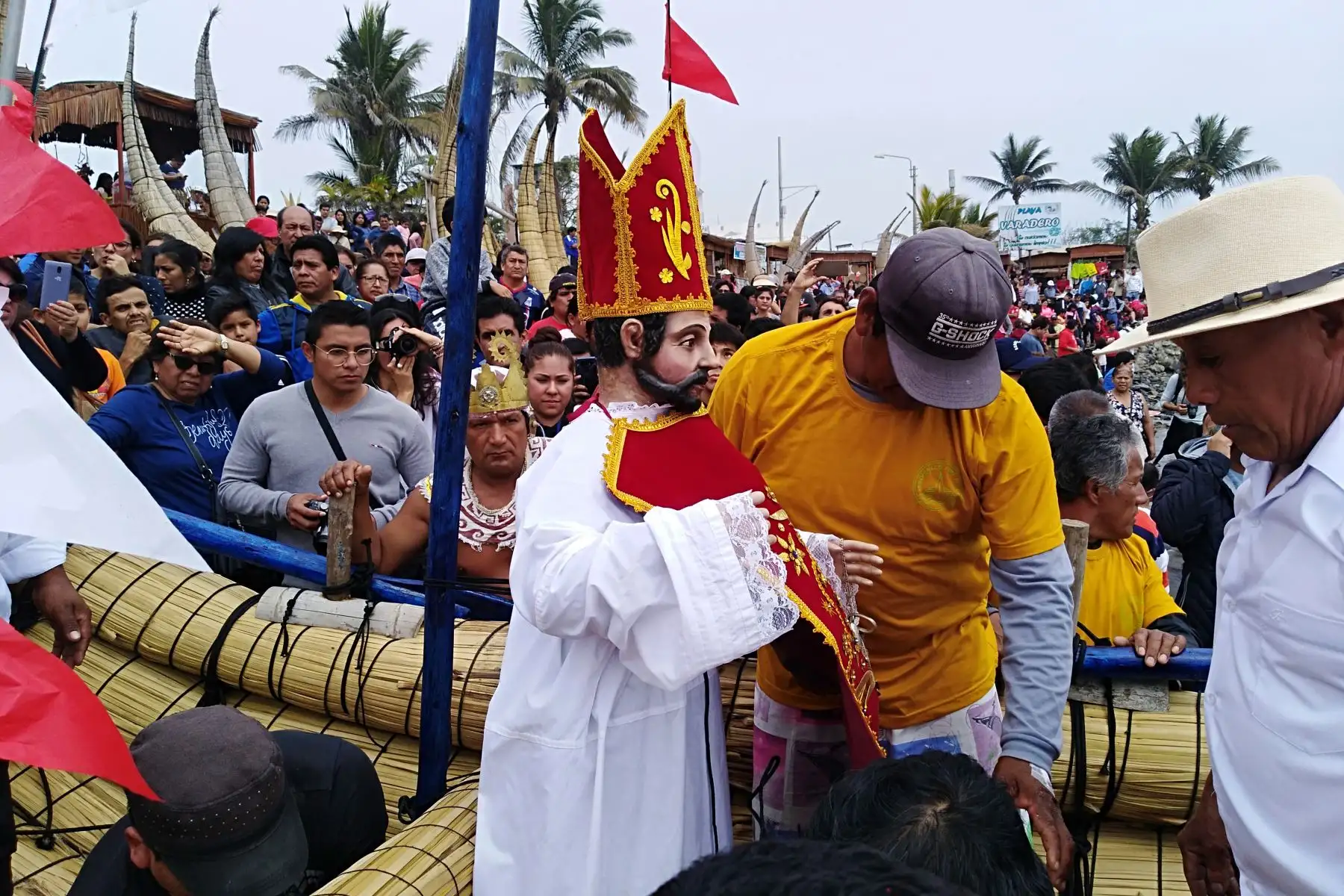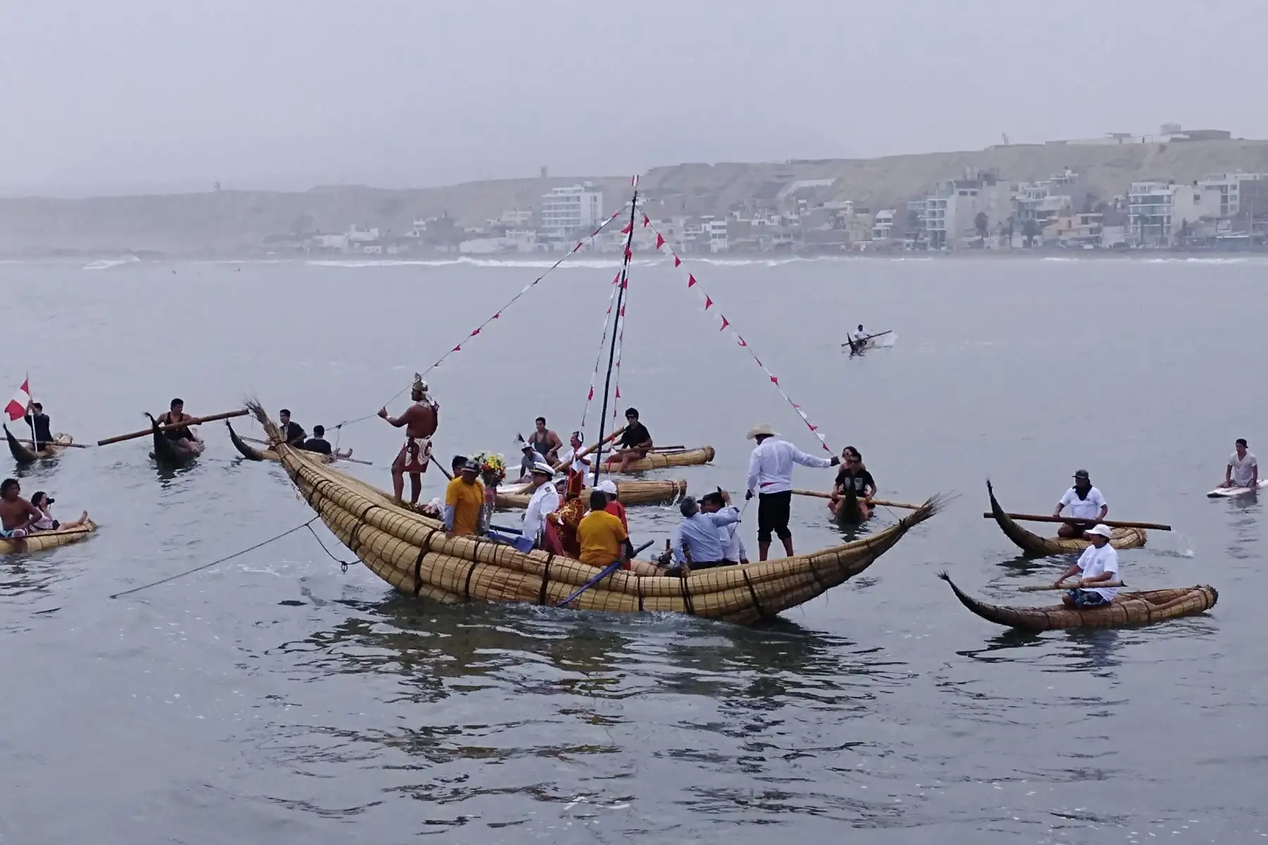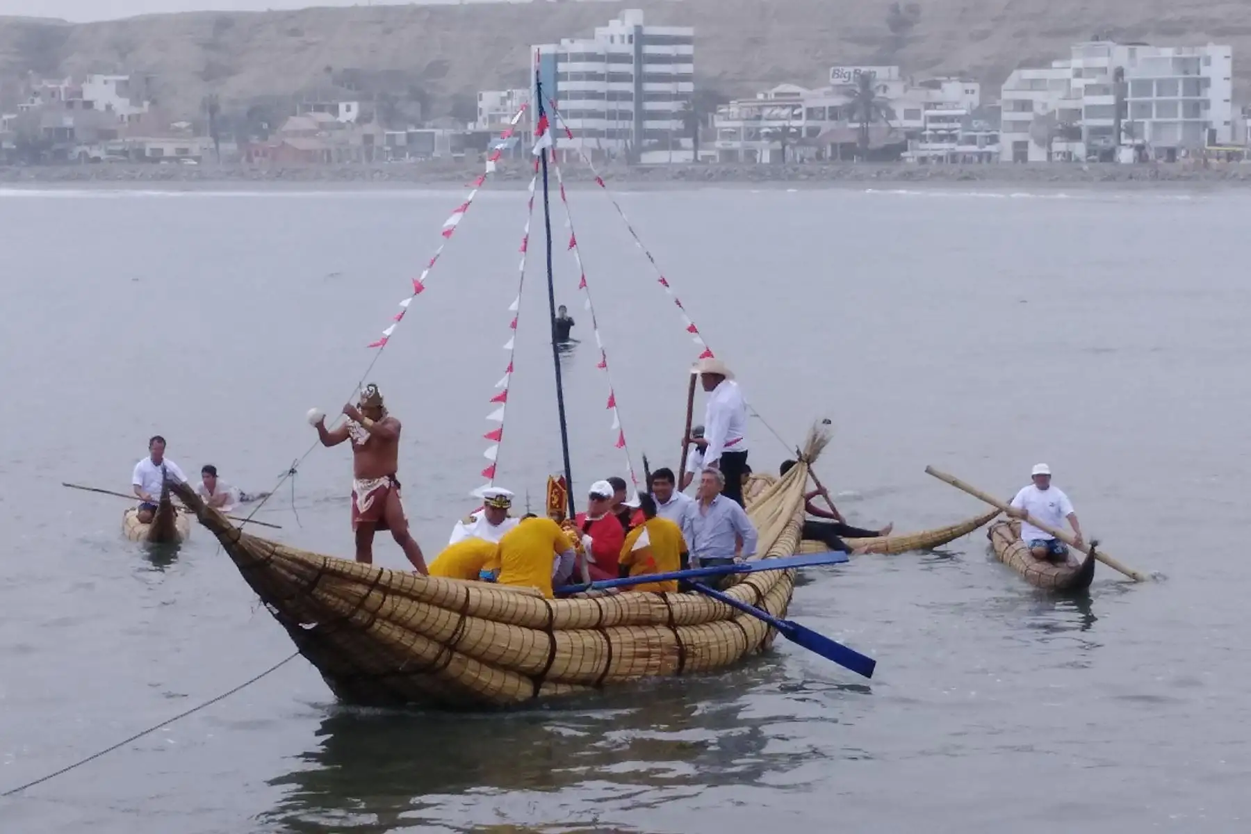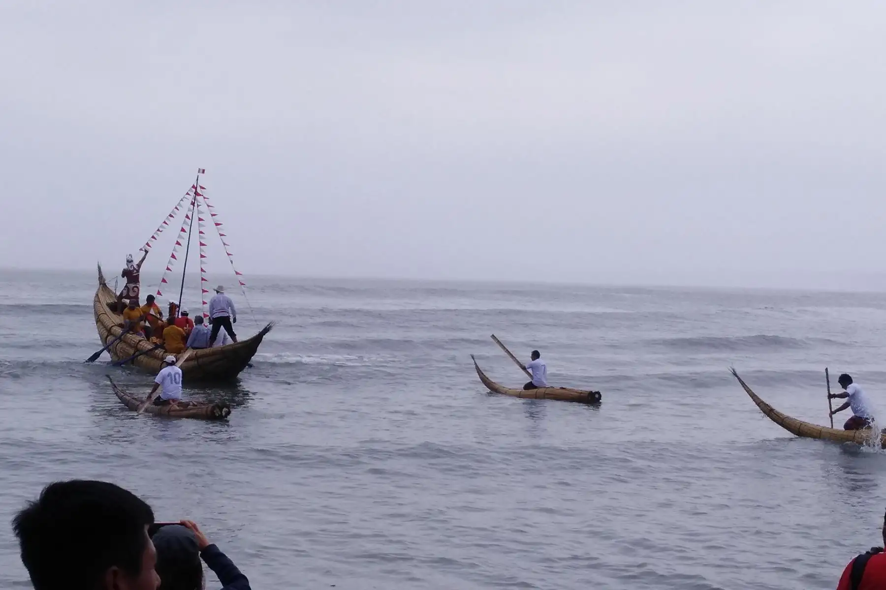 Huanchaco subido en un Patacho o embarcación de totora, donde acompañaron cientos de