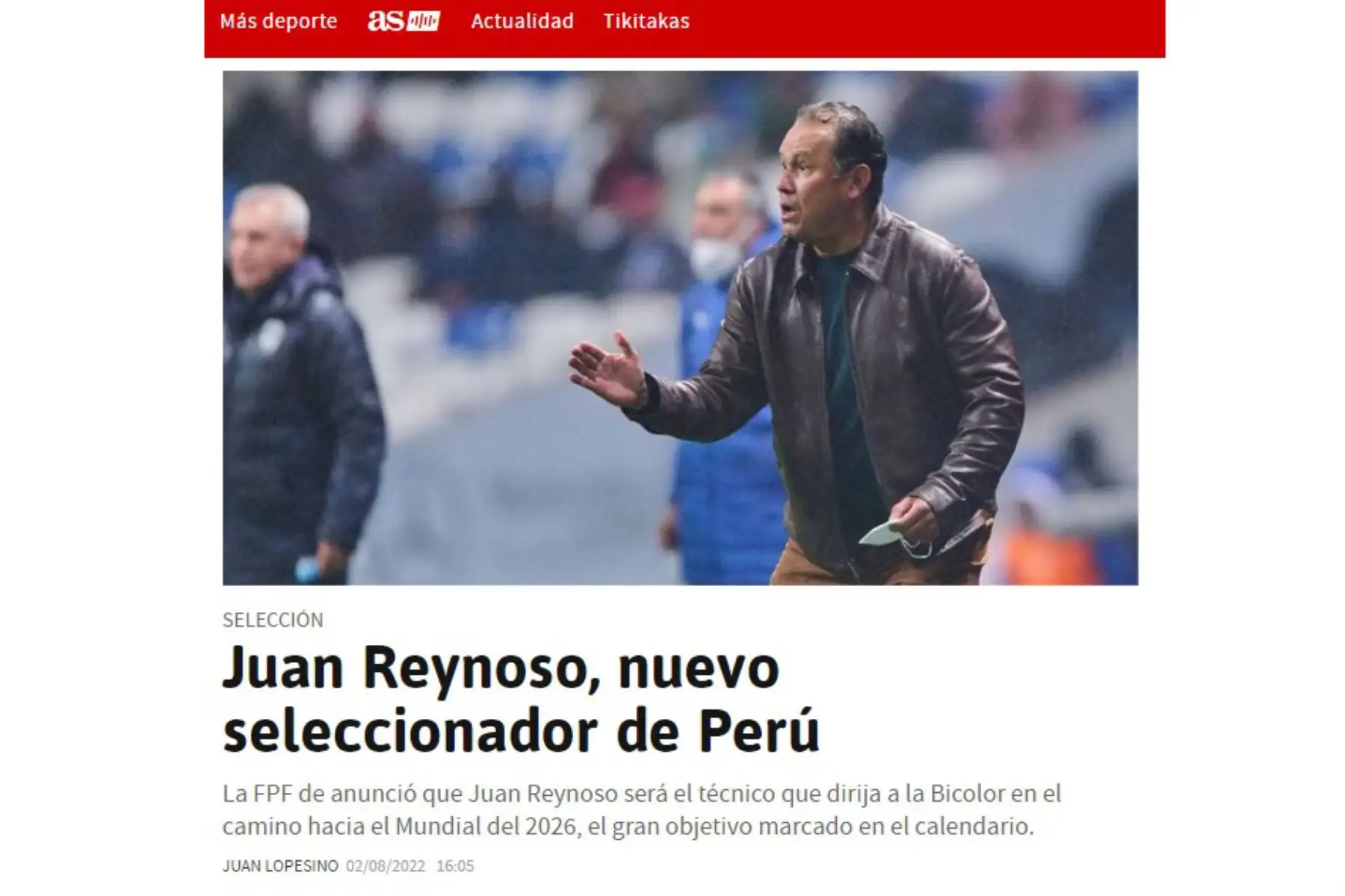 02/08/2022 Así informa la prensa nacional e internacional la oficialización de Juan Reynoso como técnico de la Selección Peruana. En la imagen , portada del diario AS de México.
