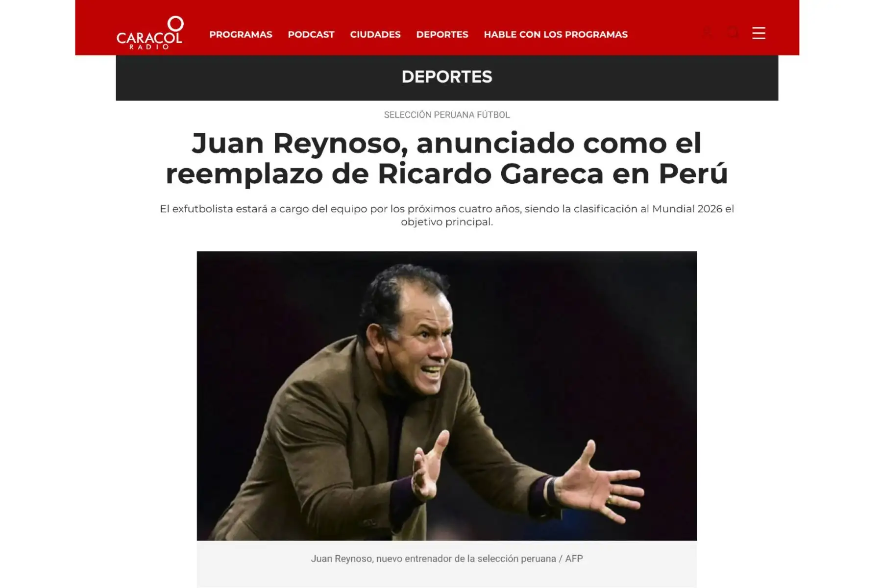 02/08/2022 Así informa la prensa nacional e internacional la oficialización de Juan Reynoso como técnico de la Selección Peruana. En la imagen , portada radio Caracol.