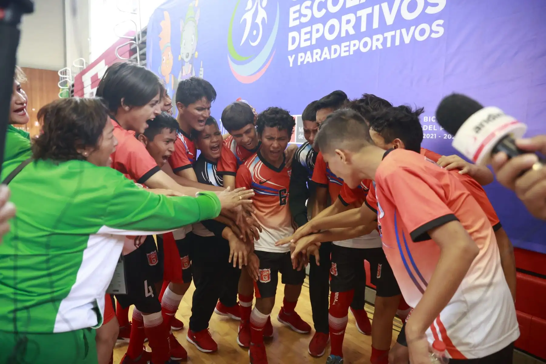 25/10/2022 Un grupo de jóvenes se alienta ante de participar en la competencia de handball durante los Juegos Escolares Deportivos y Paradeportivos 2022 que se desarrolla en la Videna de San Luis. Foto: ANDINA/Melina Mejía