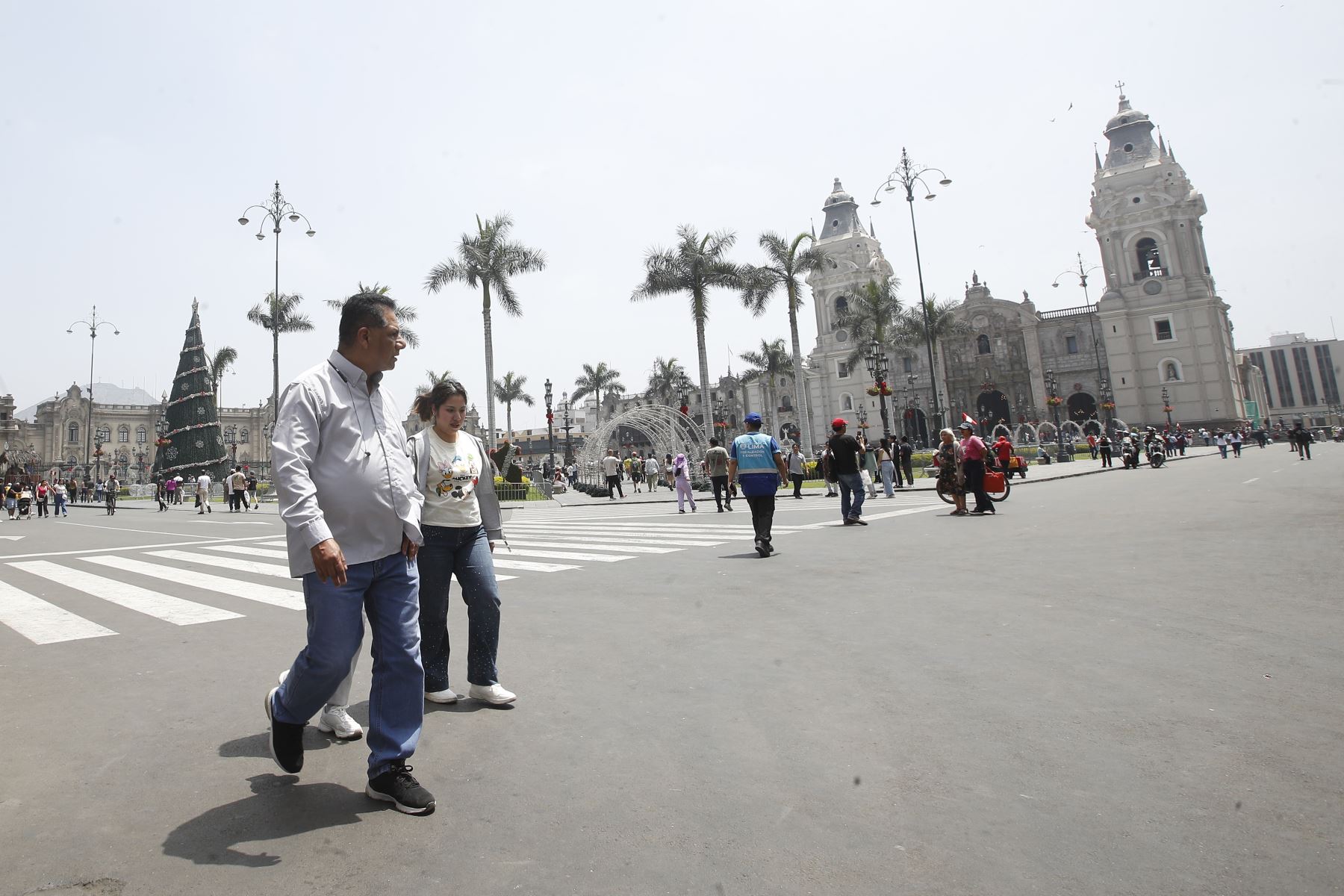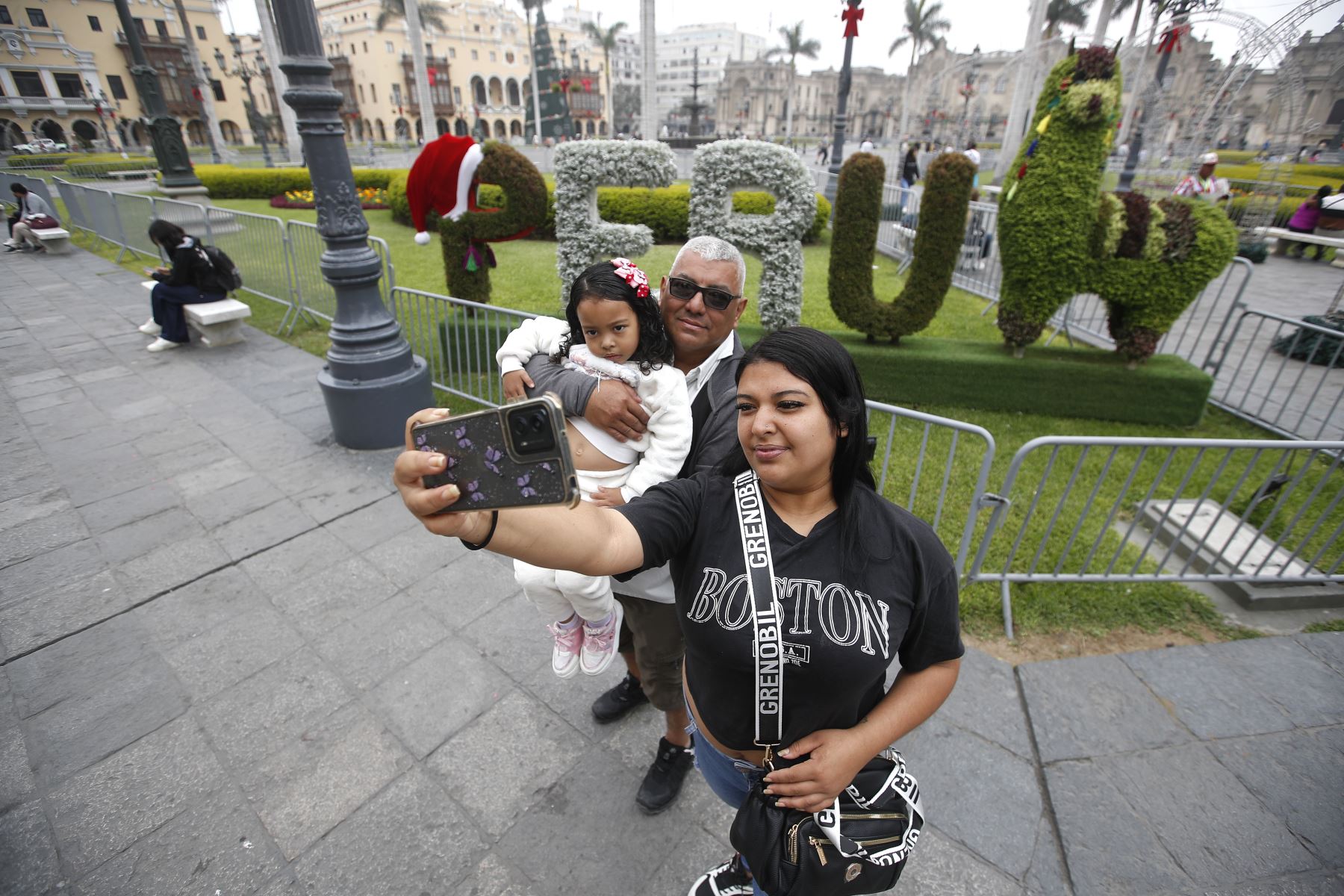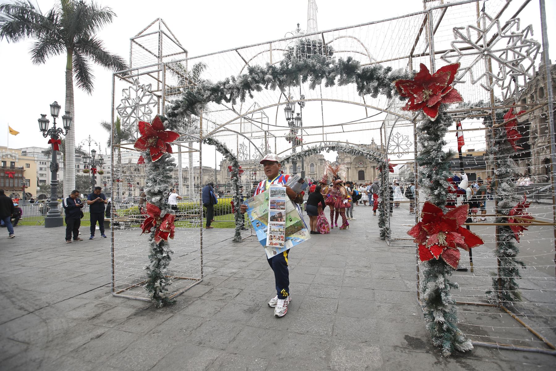 14/12/2025 Familias recorren el Centro Histórico de Lima que luce com adornos, imágenes y colores con motivos navideños.