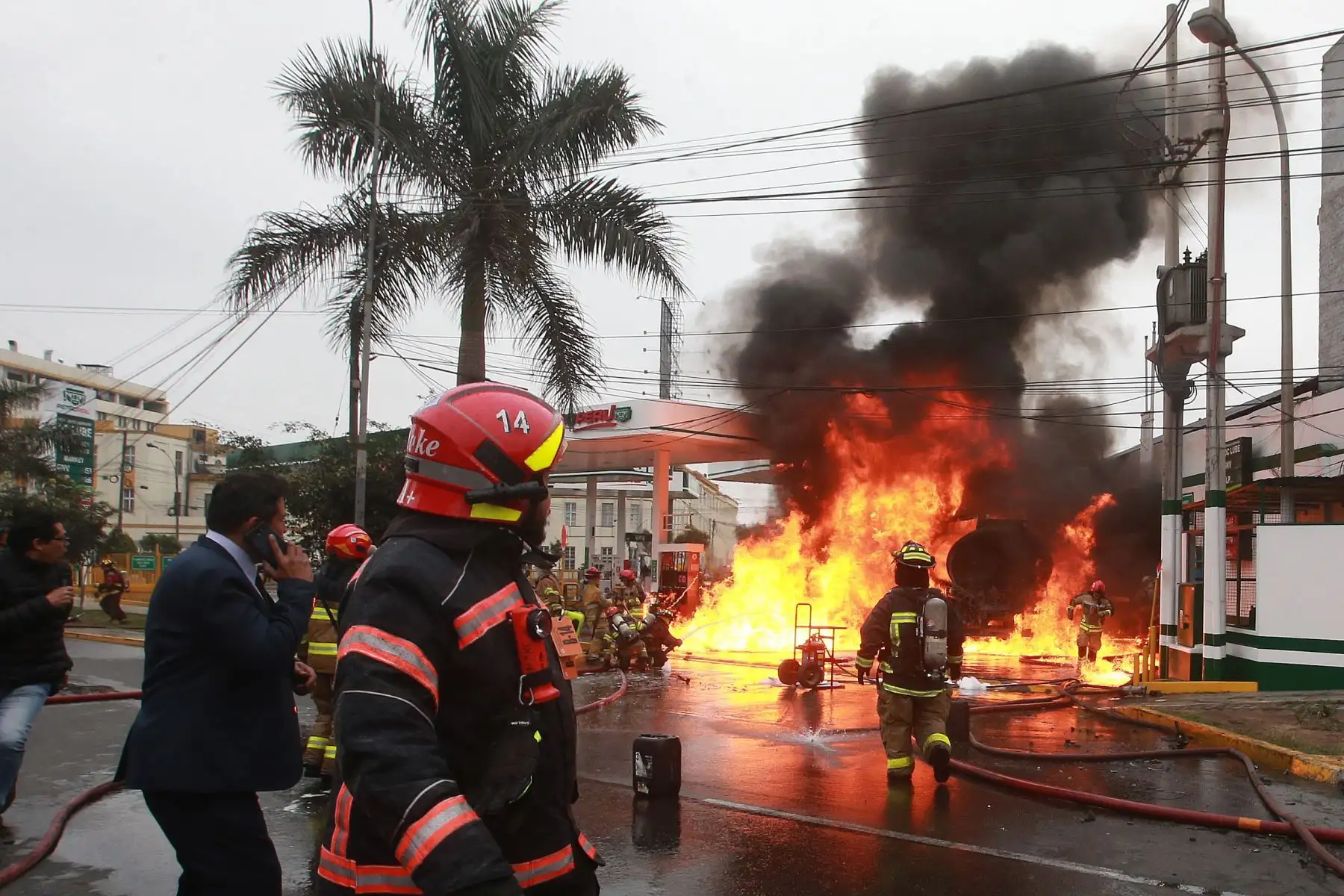 17/08/2018 Un auto y un camión cisterna se incendiaron esta tarde en el grifo Petroperú, ubicado frente al hospital del Niño de Breña, lo que ha obligado a cerrar el tránsito en la avenida Brasil y a evacuar a vecinos y negocios ubicados en los alrededores.Foto: ANDINA/Jhony Laurente