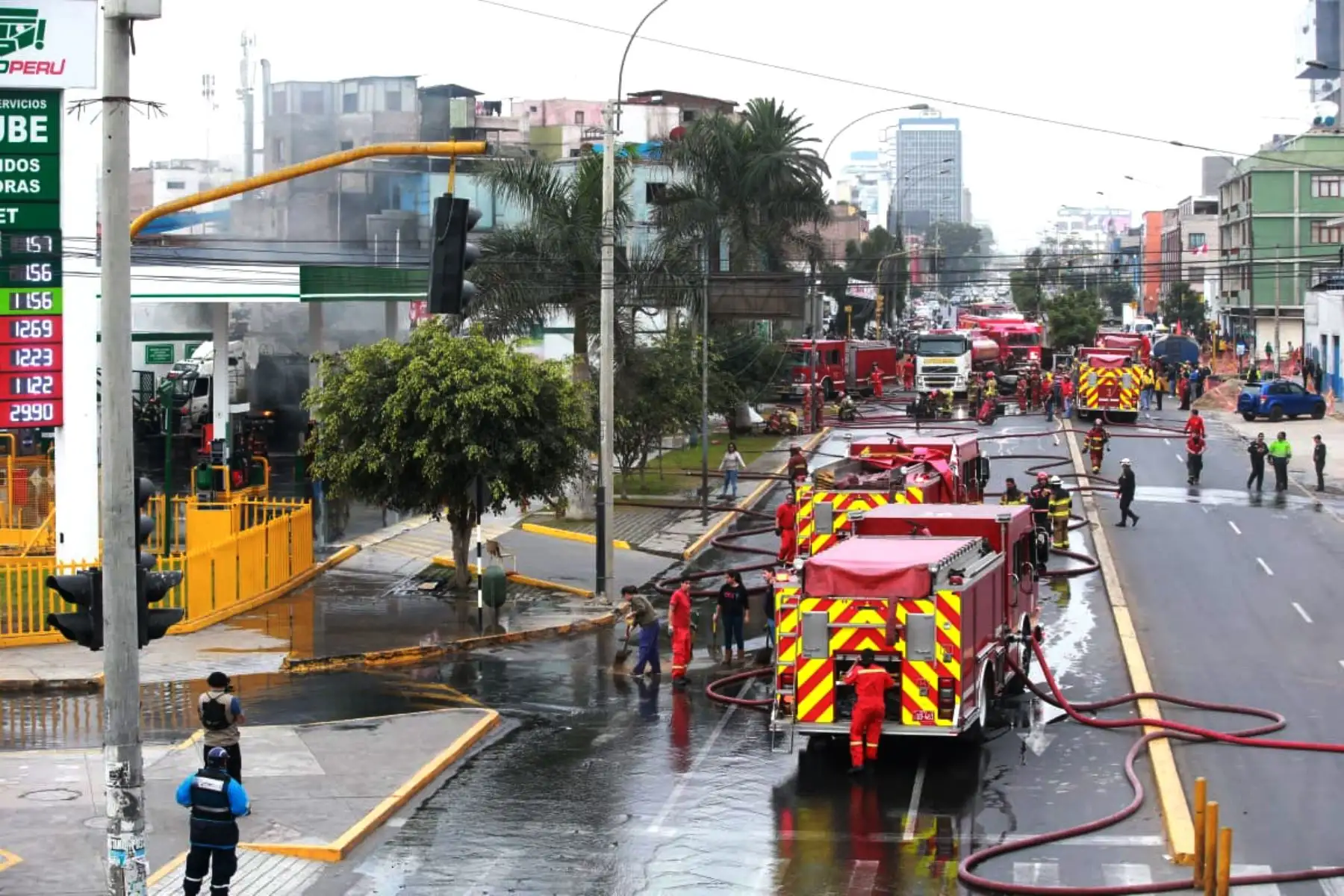 17/08/2018 Un auto y un camión cisterna se incendiaron esta tarde en el grifo Petroperú, ubicado frente al hospital del Niño de Breña, lo que ha obligado a cerrar el tránsito en la avenida Brasil y a evacuar a vecinos y negocios ubicados en los alrededores.Foto: ANDINA/Eddy Ramos