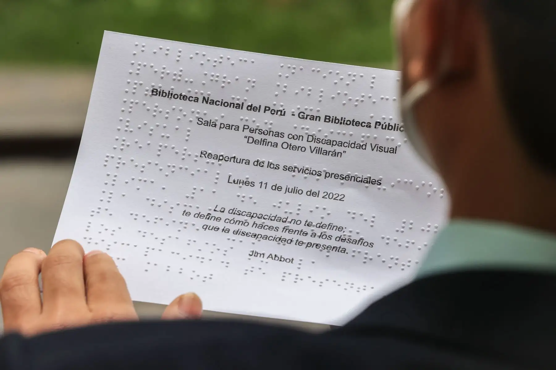 11/07/2022 Luego de 2 años de pandemia la Biblioteca Nacional del Perú reaperturó el servicio presencial de la Sala para Personas con Discapacidad Visual “Delfina Otero Villarán” de la Gran Biblioteca Pública de Lima.De esta manera se pone a disposición del público libros en formatos accesibles, textos en braile, audio libros, tiflotecnología para la lectura de obras impresas y libros digitales.