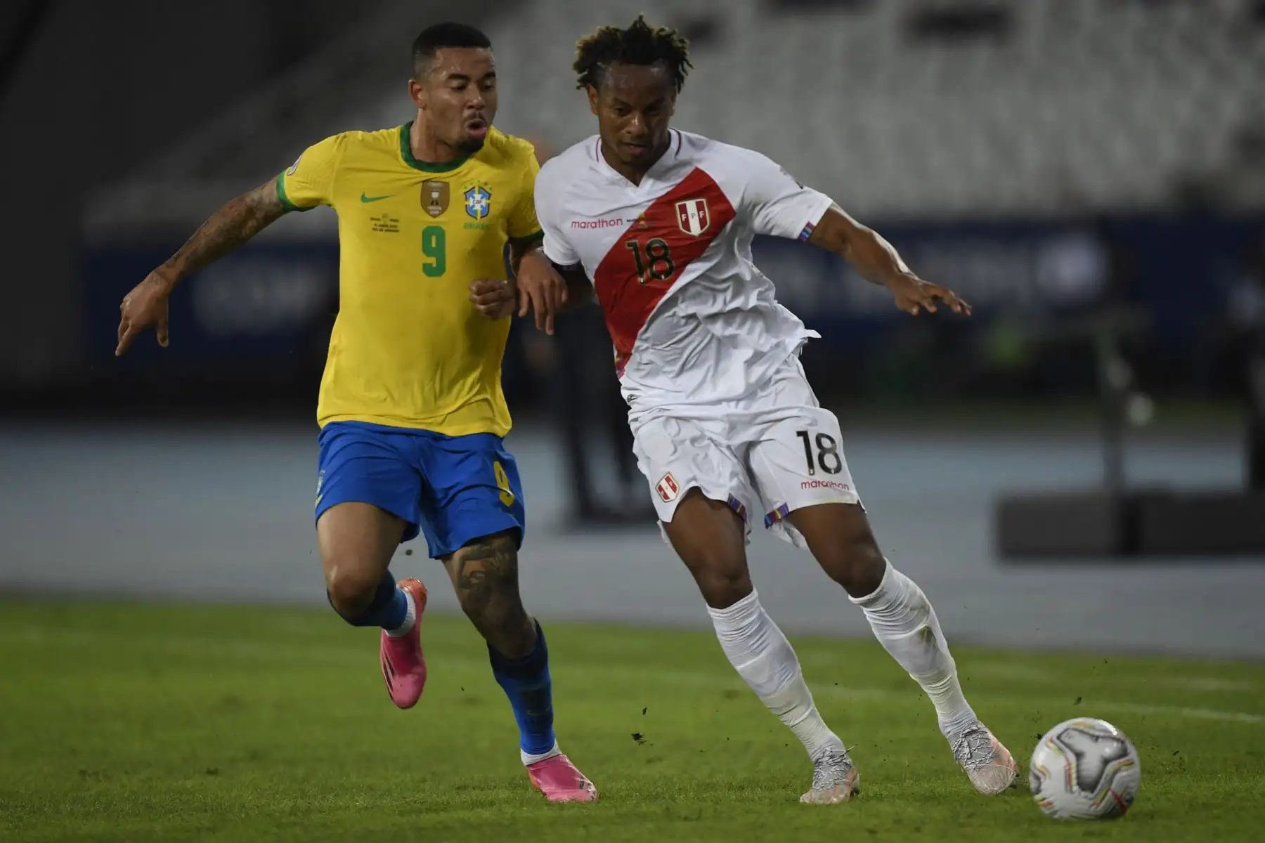 17/06/2021 El brasileño Gabriel Jesús y el peruano Andre Carrillo compiten por el balón durante el partido de la fase de grupos de la Copa América, en el estadio Nilton Santos de Río de Janeiro, Brasil. Foto. AFP