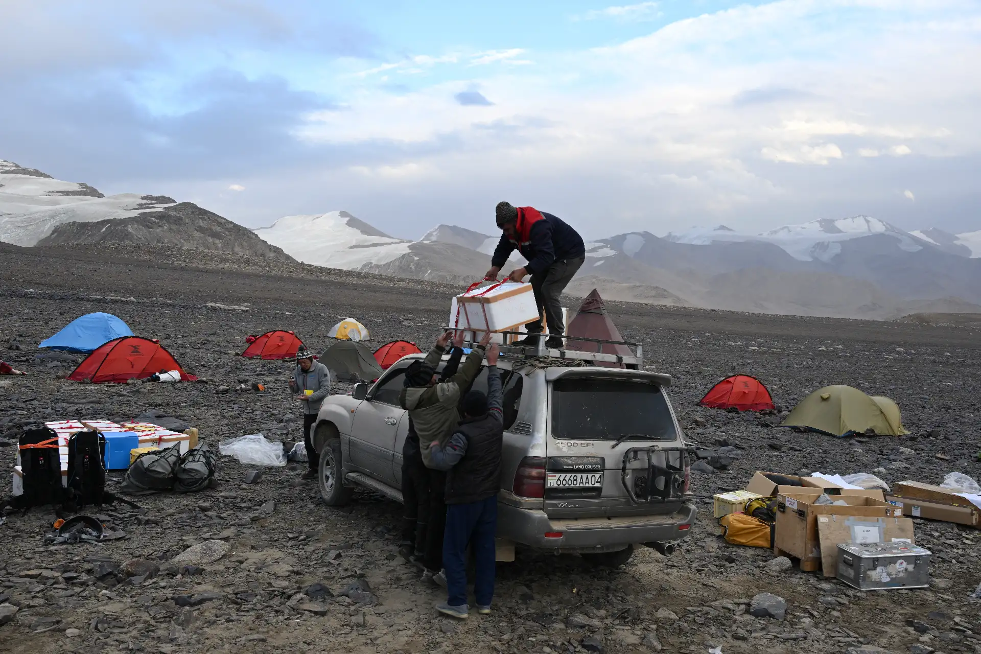07/11/2025 Miembros de la expedición "Memoria del hielo del Pamir" instalaron su equipo al pie del glaciar Pamir en Kon Chukurbashi, al este de Tayikistán, AFP