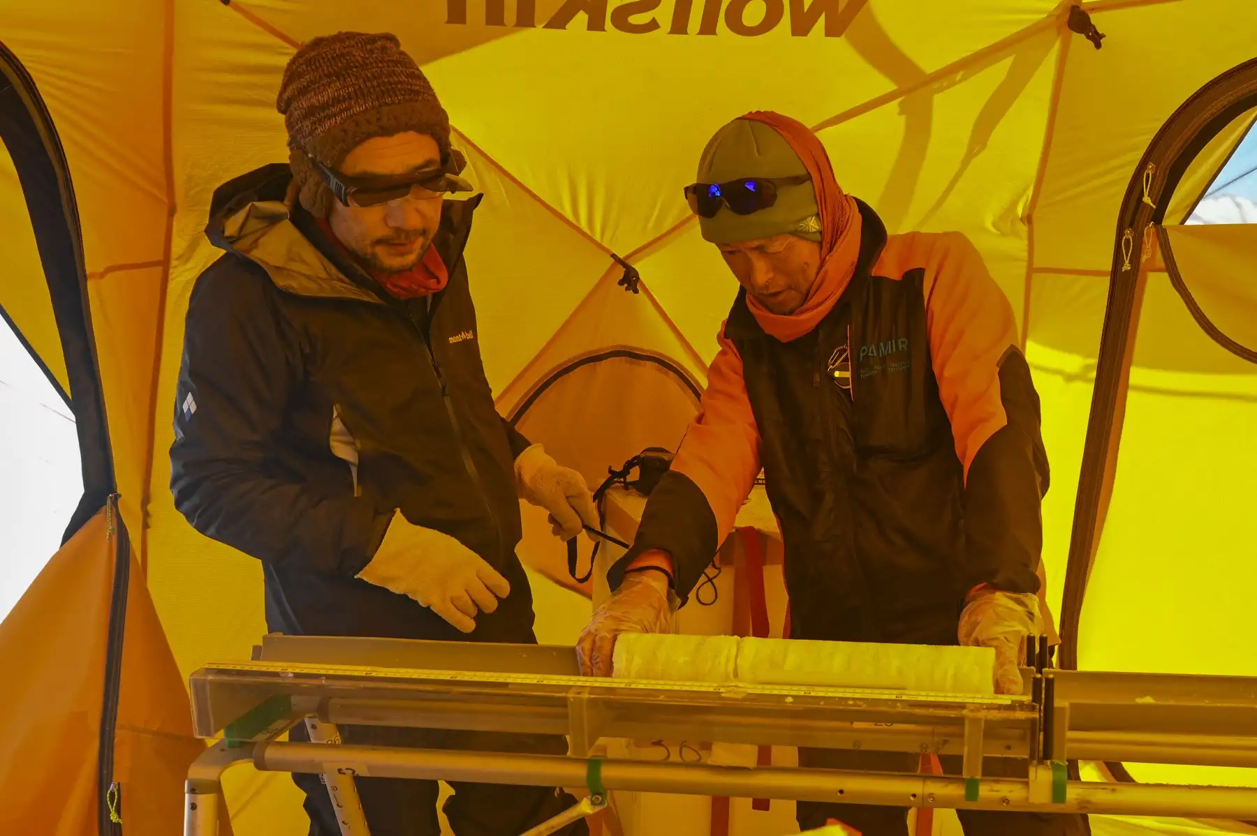 07/11/2025 Esta fotografía muestra a los glaciólogos japoneses Ken Kondo y Koji Fujita, de la Universidad de Nagoya, colocando un bloque de hielo en forma de zanahoria cerca del científico ruso Stas Kutuzov, como parte de la expedición "Pamir-Hielo-Memoria" en el glaciar Pamir, en Kon Chukurbashi, al este de Tayikistán. AFP