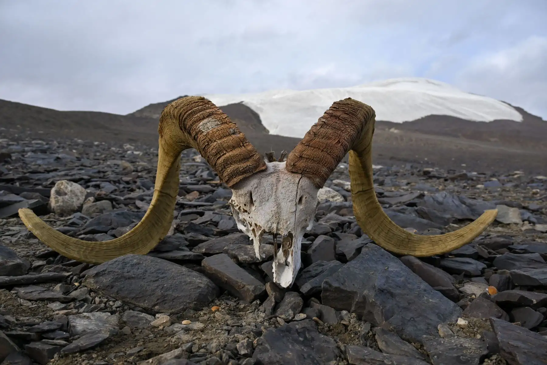07/11/2025 Esta imagen muestra el cráneo de una cabra montés camino al glaciar Pamir durante la expedición "Pamir-Hielo-Memoria" en Kon Chukurbashi, al este de Tayikistán. AFP