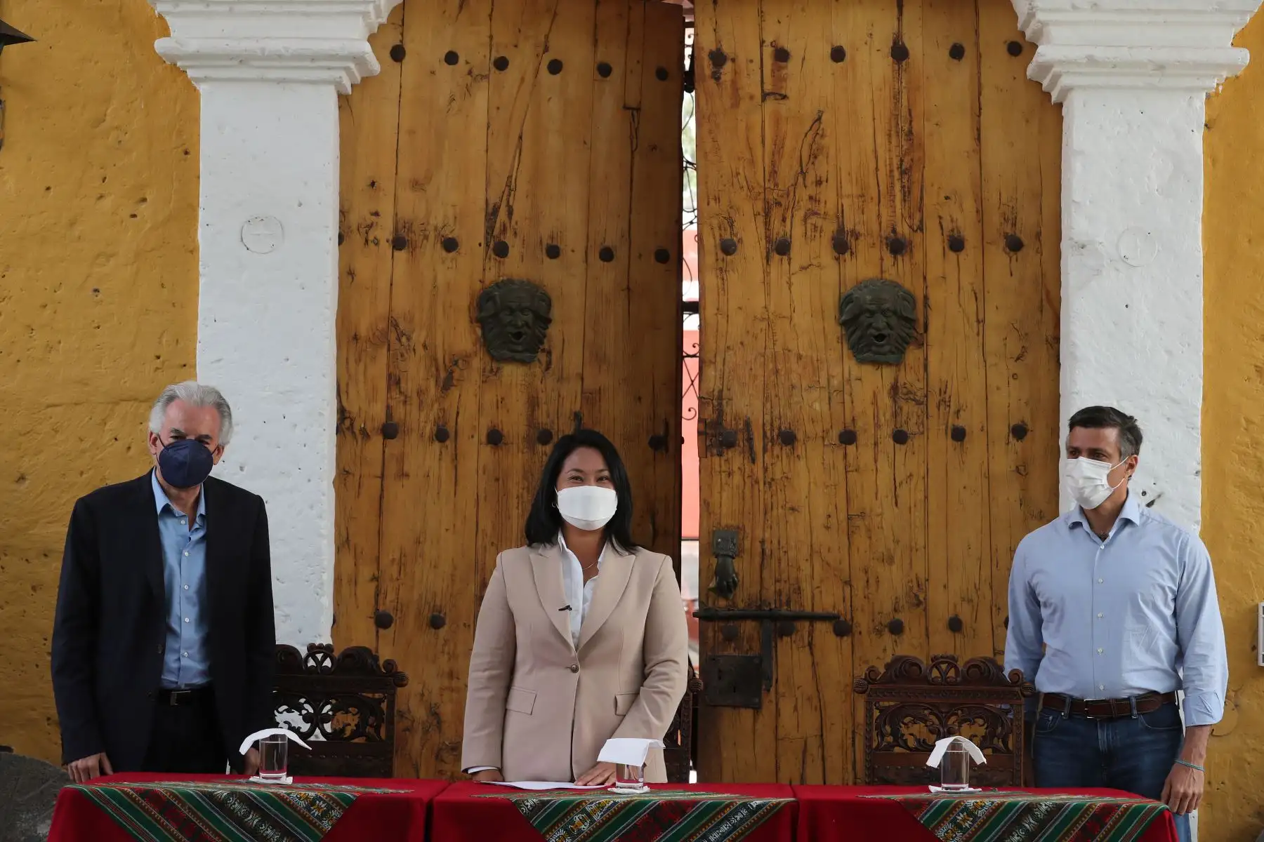 31/05/2021 Keiko Fujimori firma el 'Juramento por la democracia' en compañía de Alvaro Vargas Llosa y el opositor venezolano Leopoldo López, en Arequipa. Foto: ANDINA/Andrés Valle