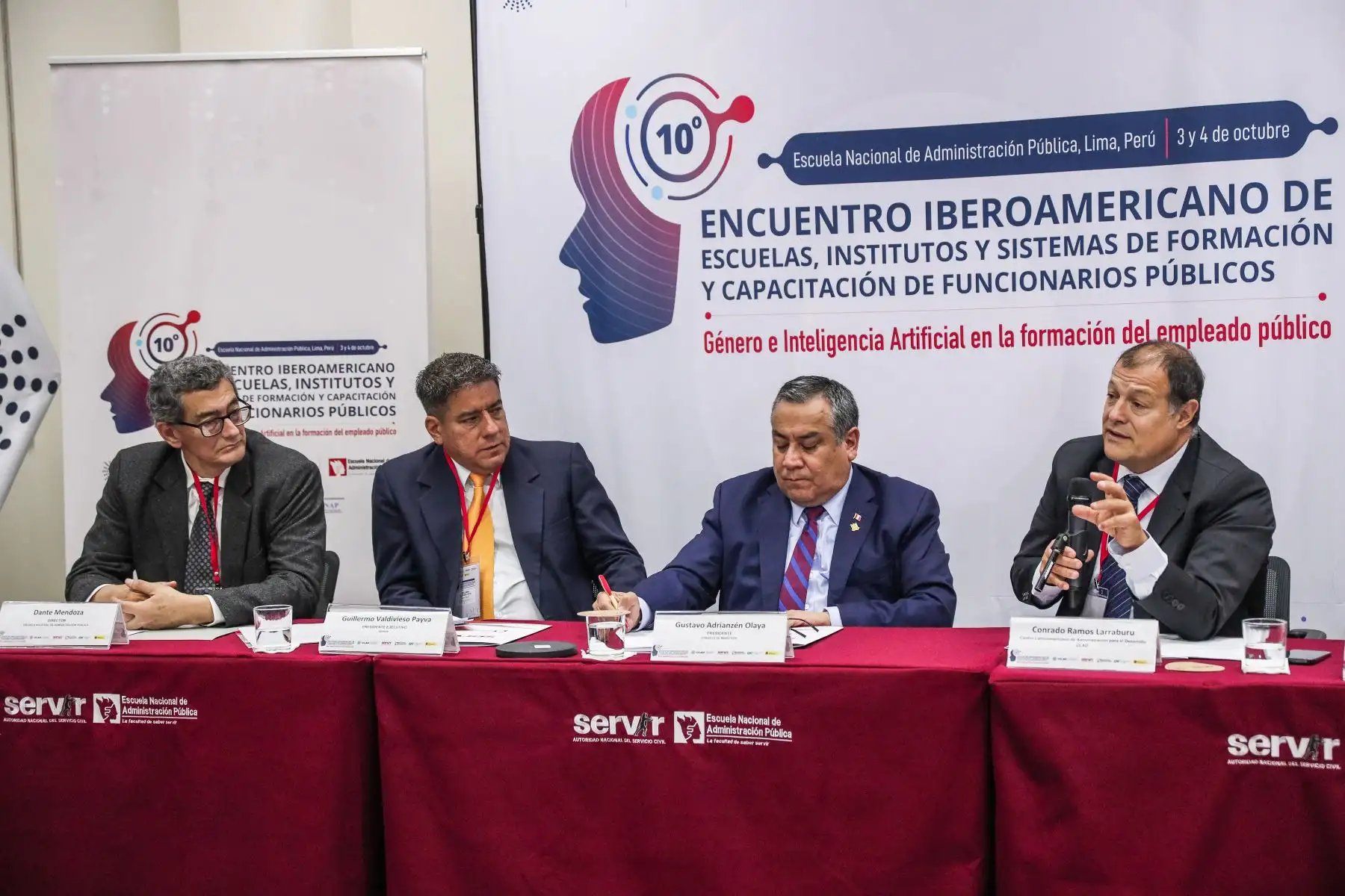 03/10/2024 Dante Mendoza, director de la Escuela Nacional de Administración Pública; Guillermo Valdivieso, presidente ejecutivo de SERVIR; Gustavo Adrianzén, presidente del Consejo de Ministros; y Conrado Ramos, secretario general del Centro Latinoamericano de Administración para el Desarrollo (CLAD), intercambian ideas durante el evento. Foto: ANDINA/ Connie Calderon