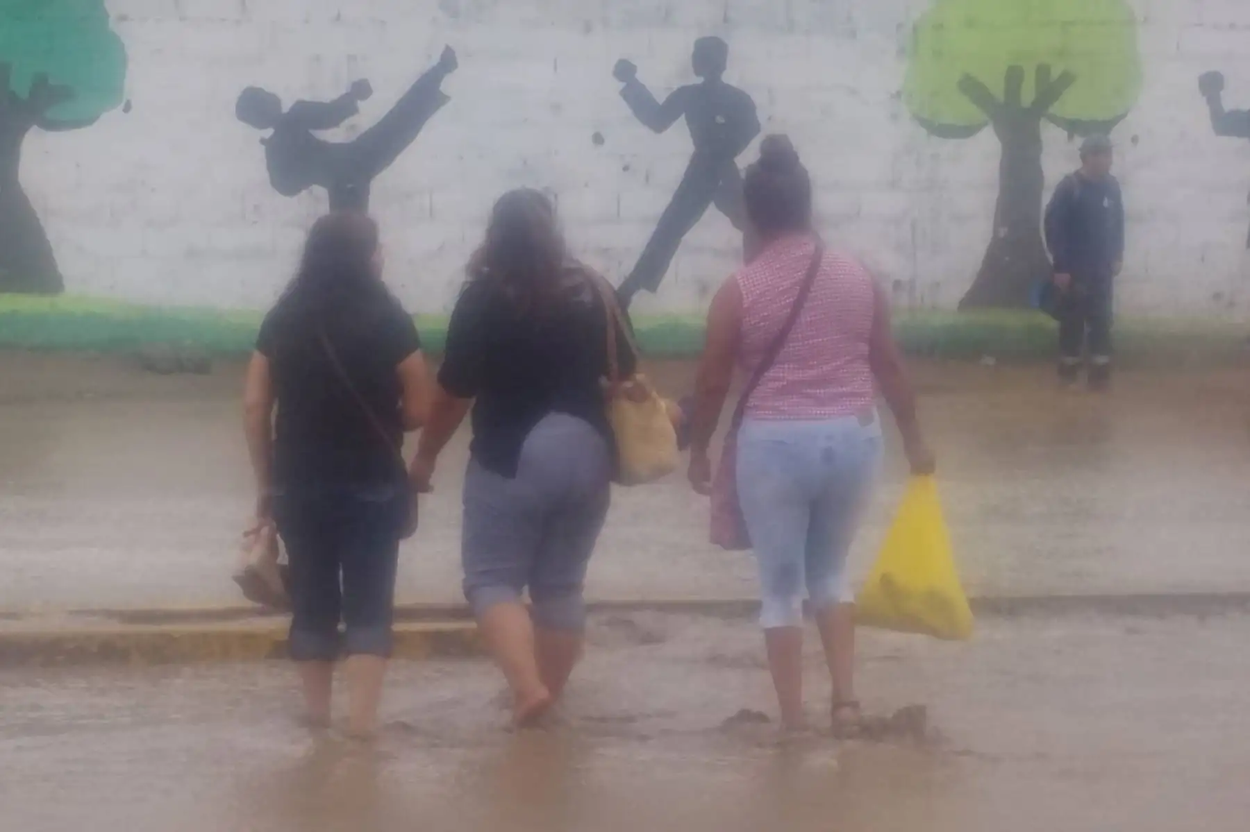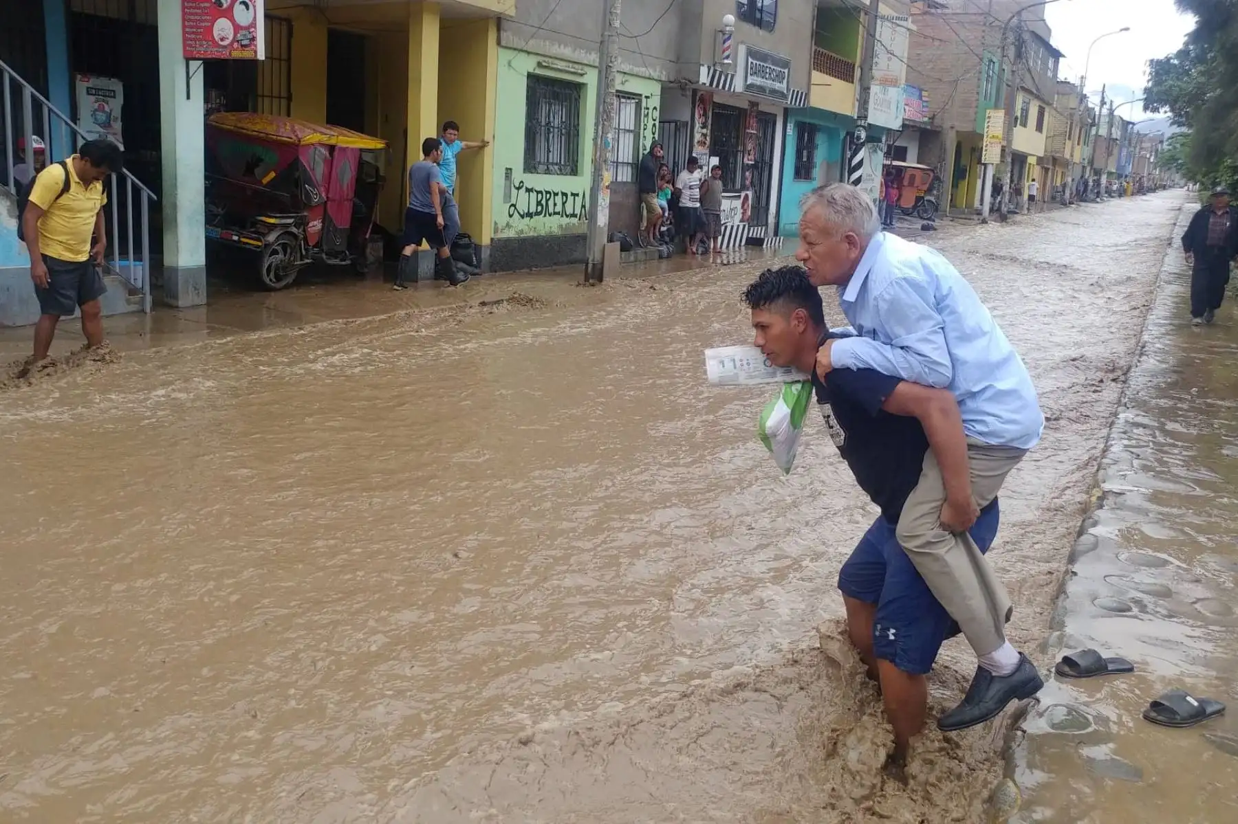 25/02/2019 Un vecino joven ayuda a un adulto mayor a cruzar la pista inundada Foto: ANDINA/Héctor Vinces