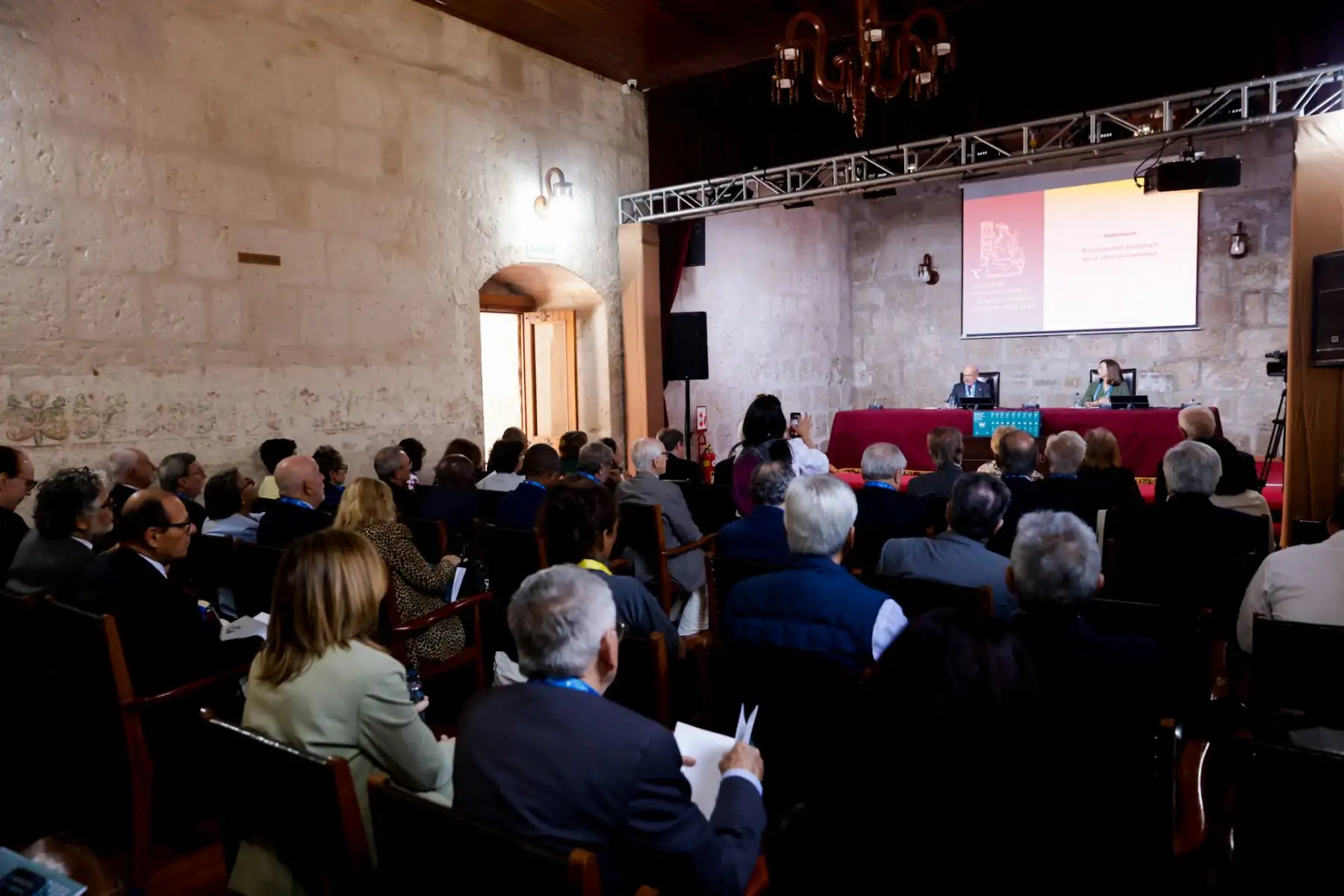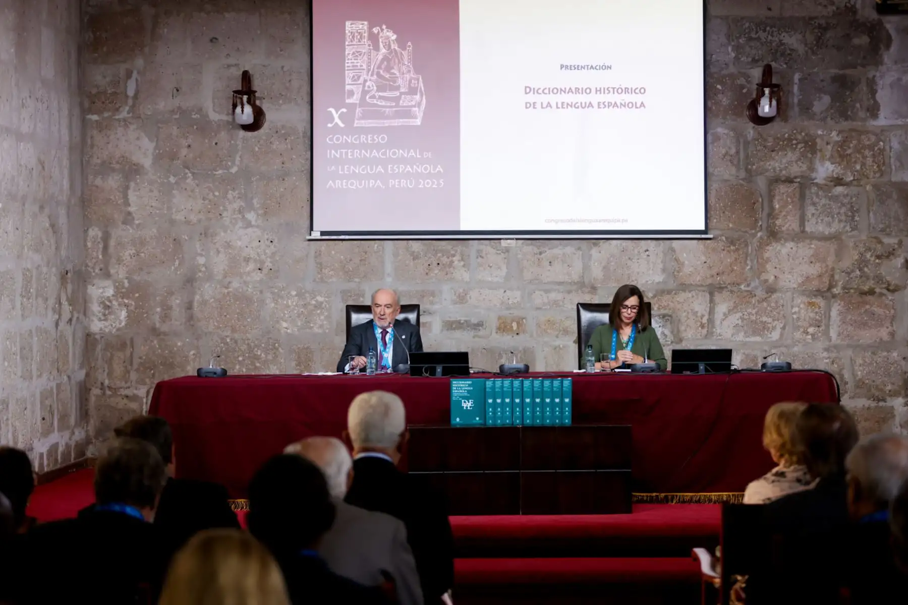 13/10/2025 La Real Academia Española presentó en la sala Mariano Melgar de la Universidad Nacional de San Agustín de Arequipa el Diccionario Histórico de la Lengua Española, en una actividad dirigida a periodistas y académicos. Participaron Santiago Muñoz Machado, director de la RAE, y María José Rincón González, miembro de la Academia Dominicana de la Lengua, quienes presentaron la edición impresa del avance del repertorio léxico del idioma. Foto: ANDINA/Luis Iparraguirre