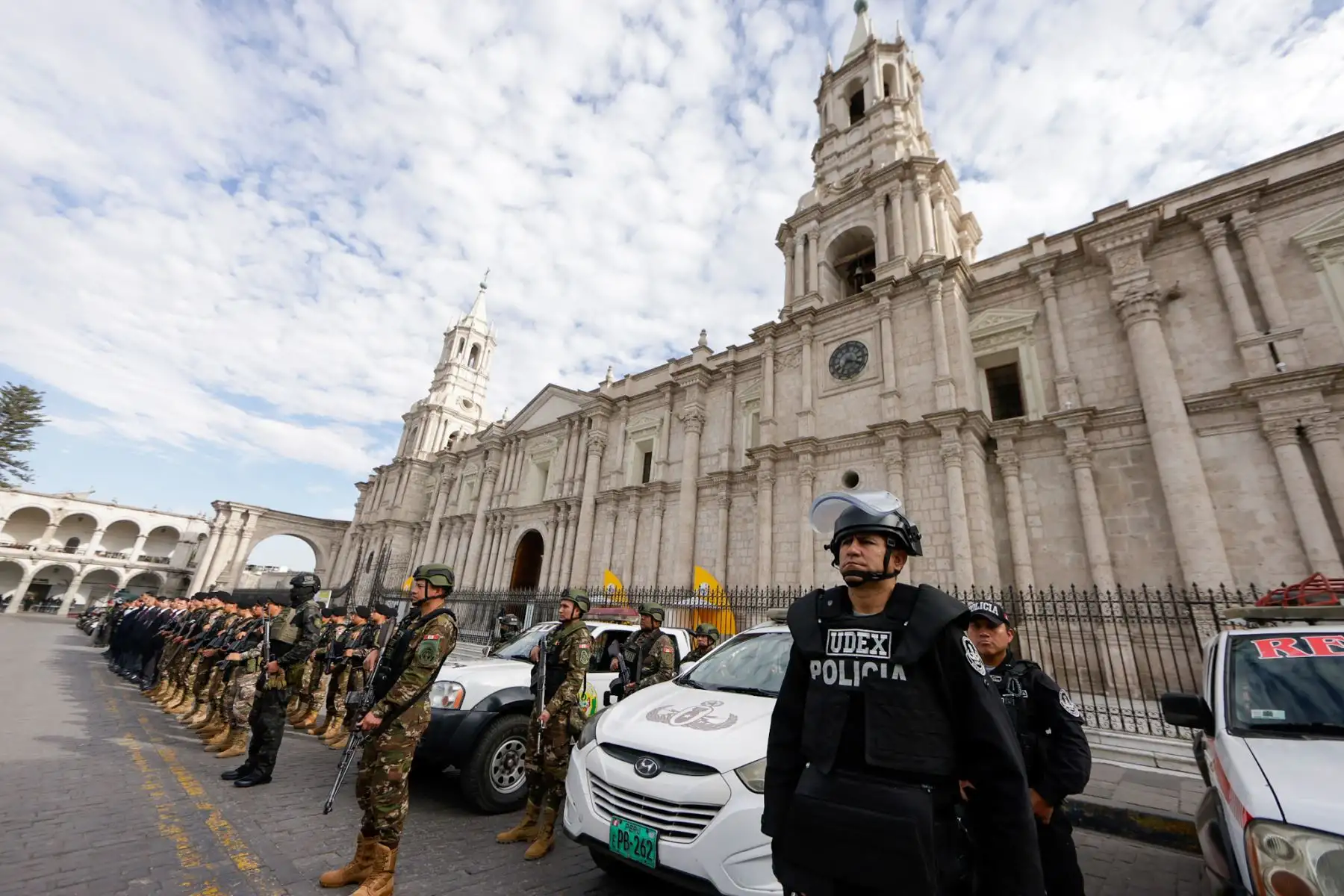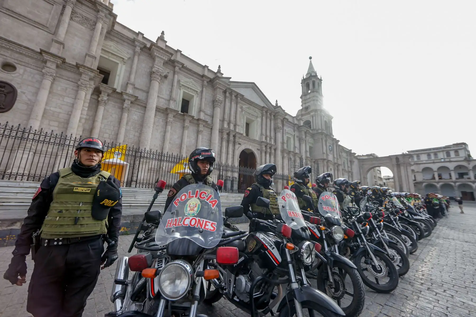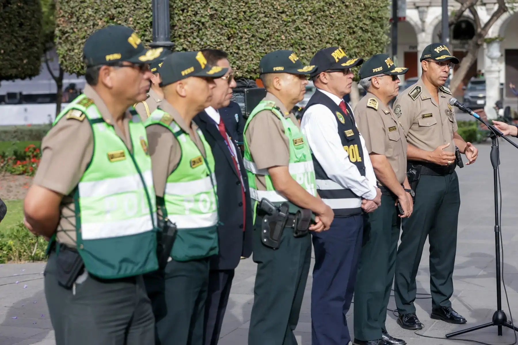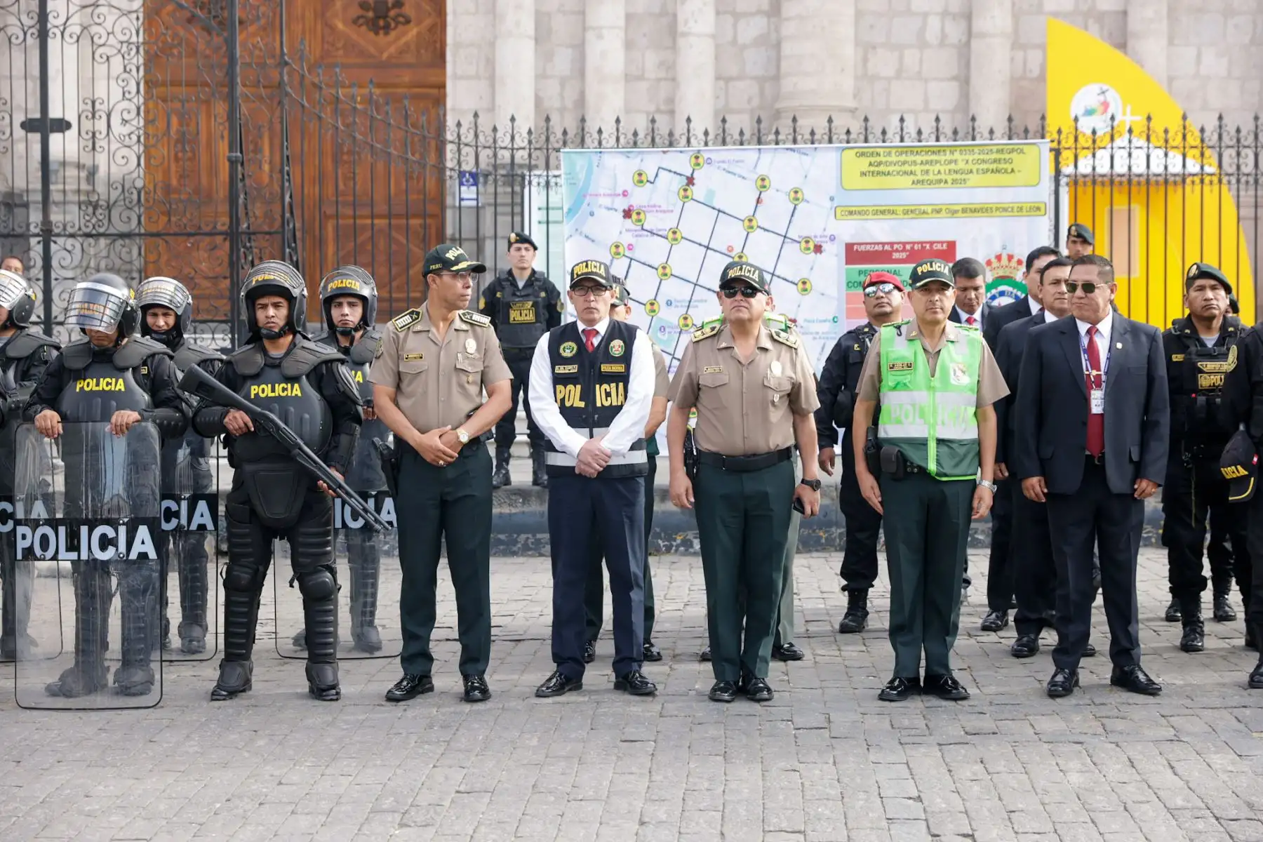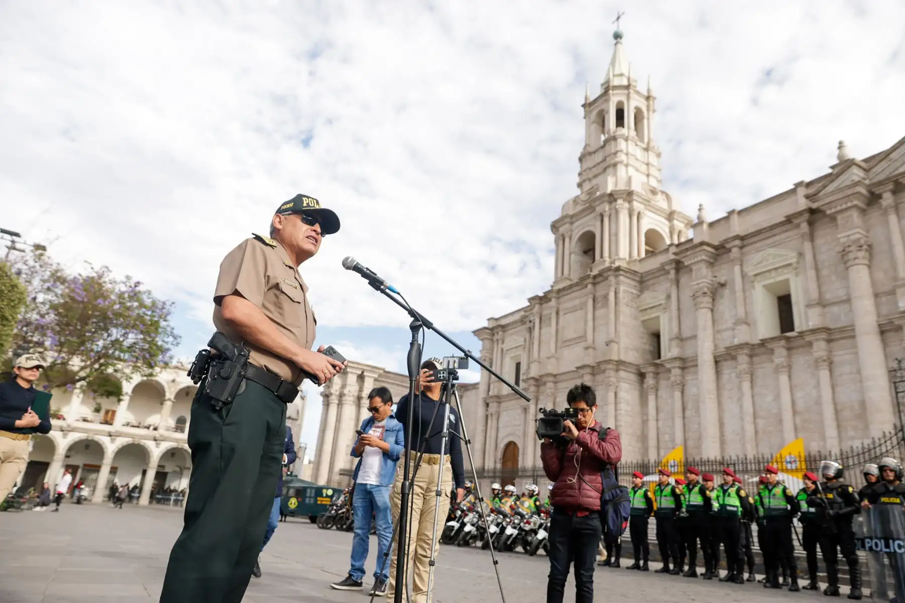14/10/2025 El general Olger Benavides Ponce de León, jefe de la Región Policial Arequipa, presentó el plan de seguridad desplegado con motivo del X Congreso Internacional de la Lengua Española. En una conferencia de prensa realizada frente a la Catedral de Arequipa, explicó que el operativo contempla acciones especiales por la llegada del rey de España, a fin de garantizar el desarrollo normal y seguro de este importante evento cultural y académico. Foto: ANDINA/Luis Iparraguirre