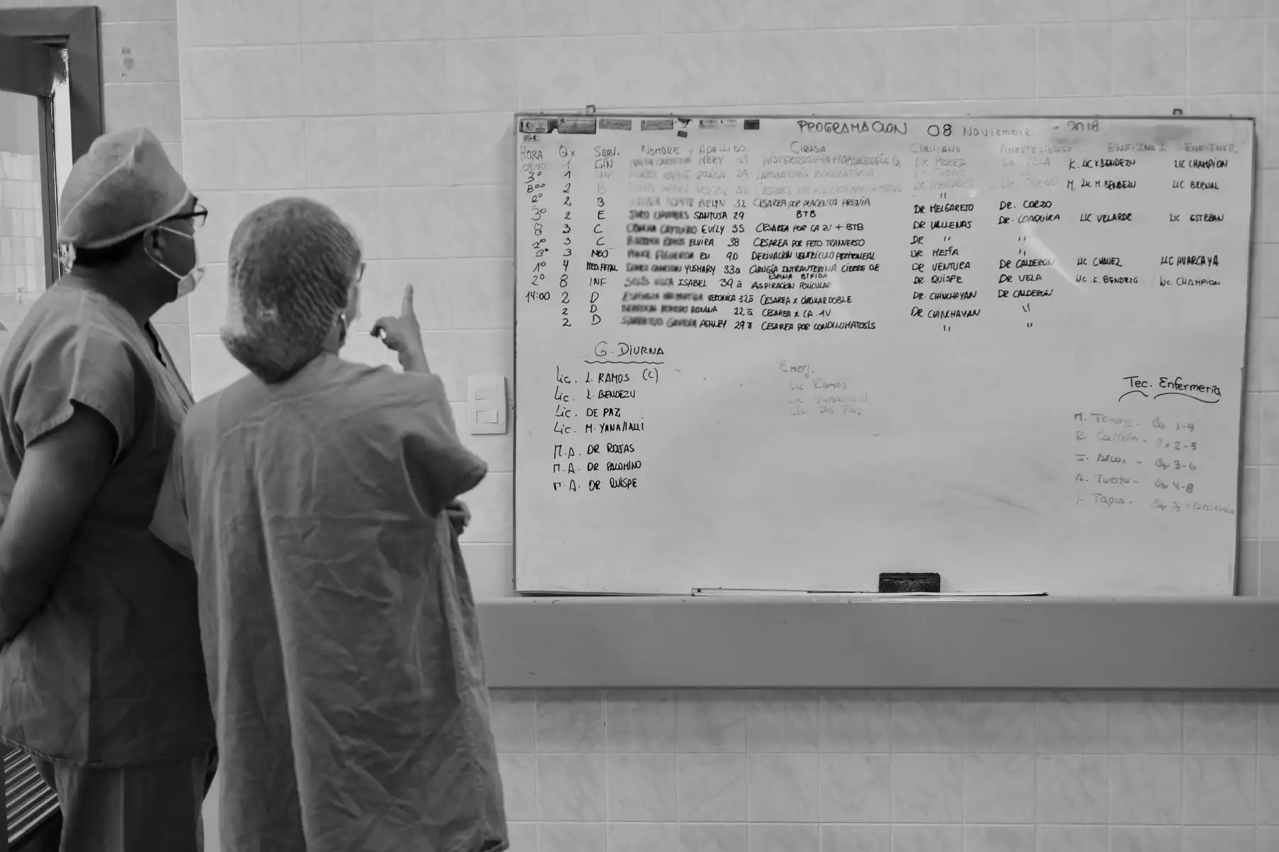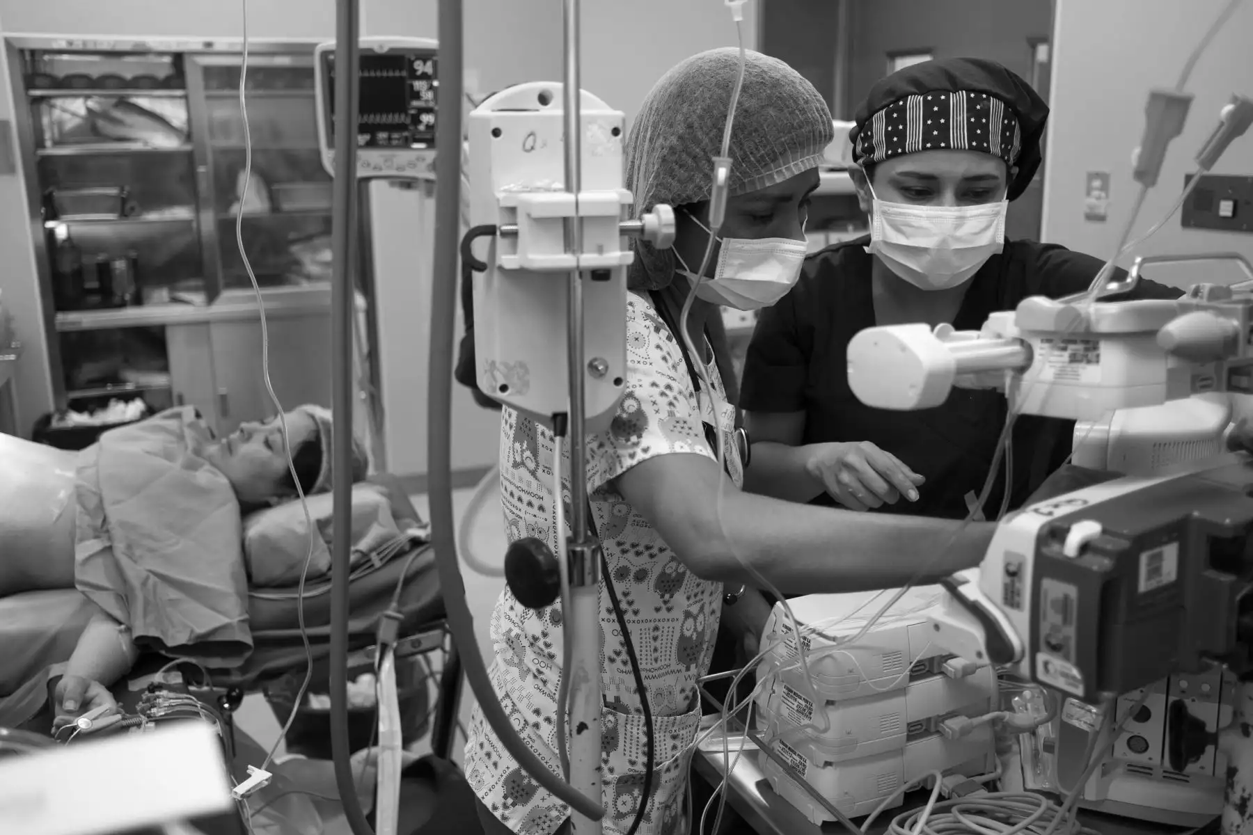 24/01/2021 Las anestesiólogas Marjorie Calderón y Vanessa Gilmalca, dialogan sobre los procedimientos que seguirán en las próximas horas. La anestesia será administrada durante toda la cirugía de manera controlada y monitoreada. La madre y el feto deben mantenerse completamente dormidos.