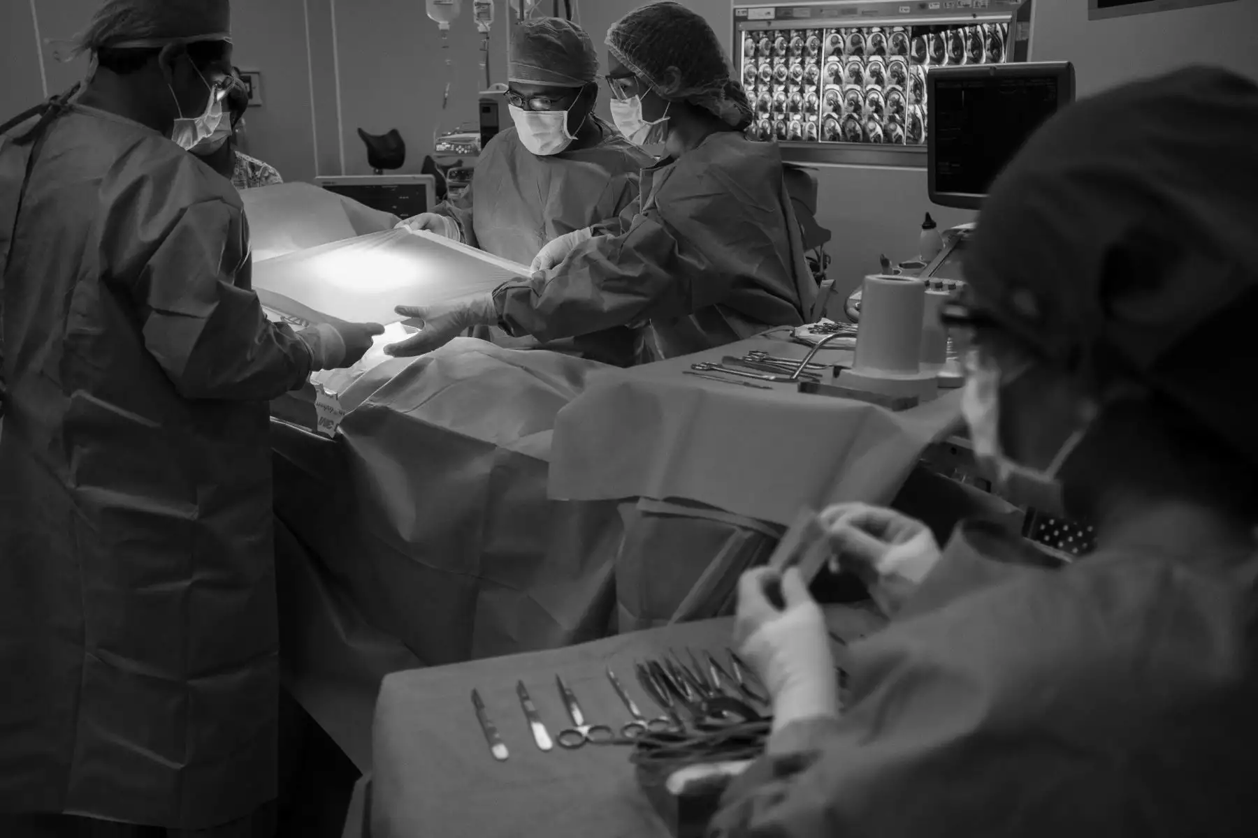 24/01/2021 Los cirujanos preparan a la paciente colocándole un campo adhesivo estéril sobre el vientre. Mientras tanto, una enfermera alista sobre la mesa, algunas de las herramientas que usarán los especialistas: pinzas, tijeras, bisturies, agujas e hilo.