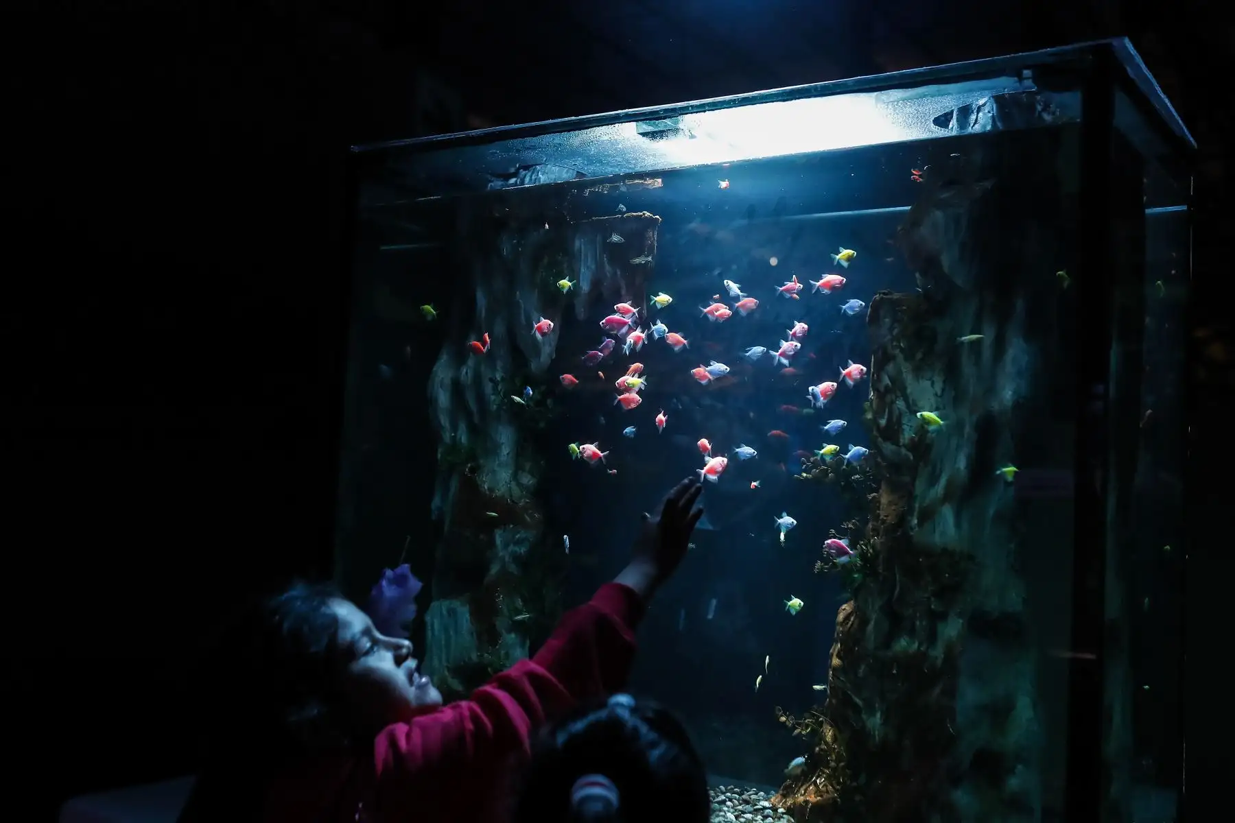 10/09/2022 Niños disfrutan el recorrido y se asombran con los peces multicolor del acuario. Foto: ANDINA/Renato Pajuelo