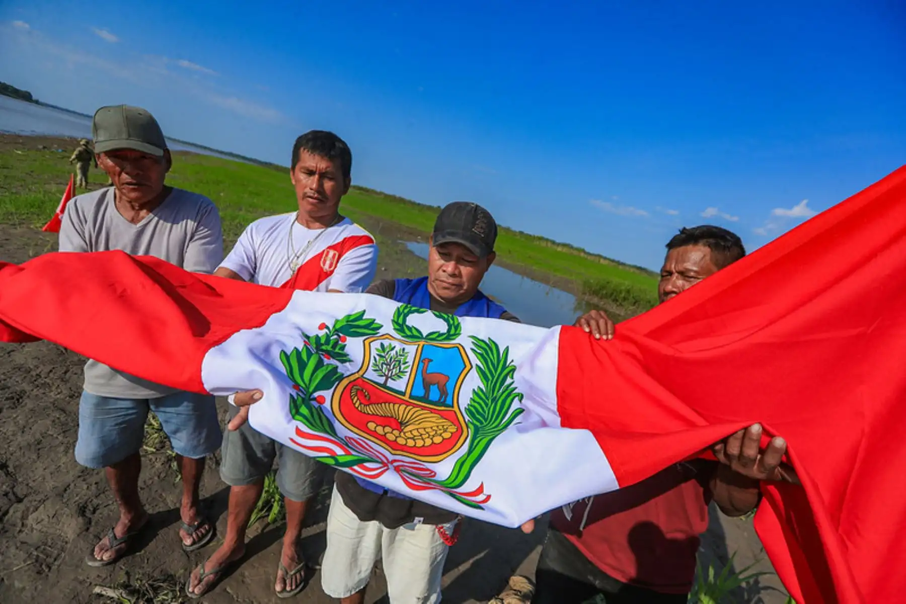 iudadanos de Santa Rosa de Loreto y los miembros de las Fuerzas Armadas, que realizan patrullaje terrestre y fluvial en la frontera, comenzaron su día izando el pabellón y cantando el himno nacional. Foto: ANDINA/ Prensa Presidencia