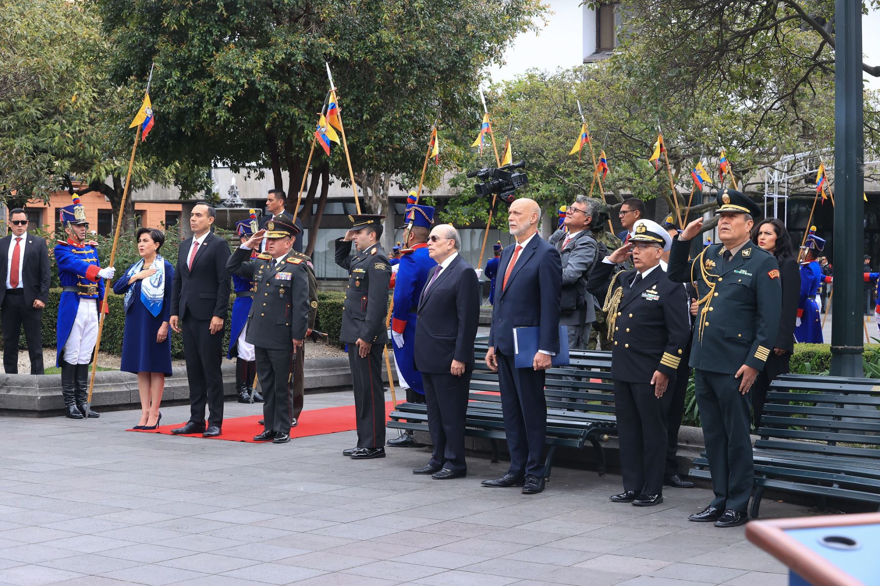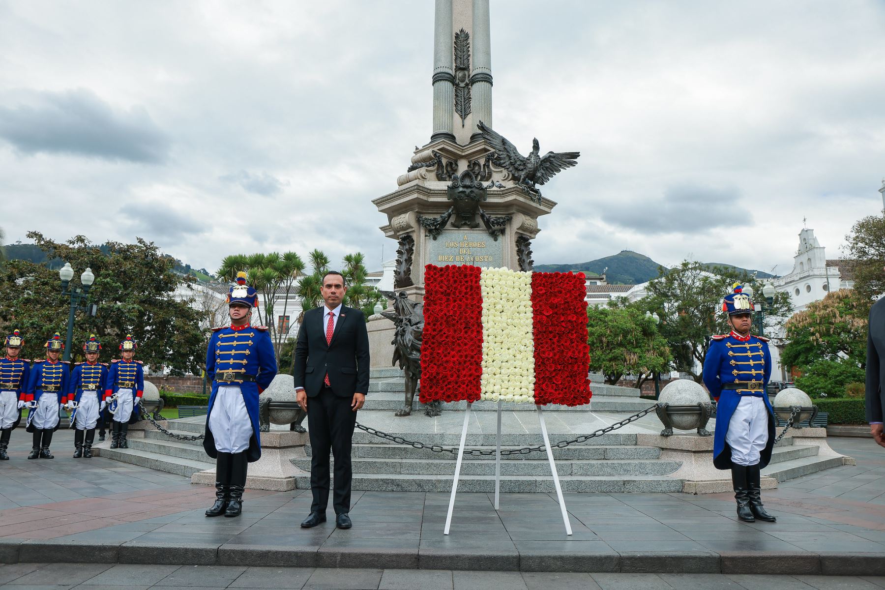 12/12/2025 Colocación de ofrenda floral a cargo del presidente de la República, José Jerí, en la Plaza de la Independencia. Foto: ANDINA/Prensa Presidencia
