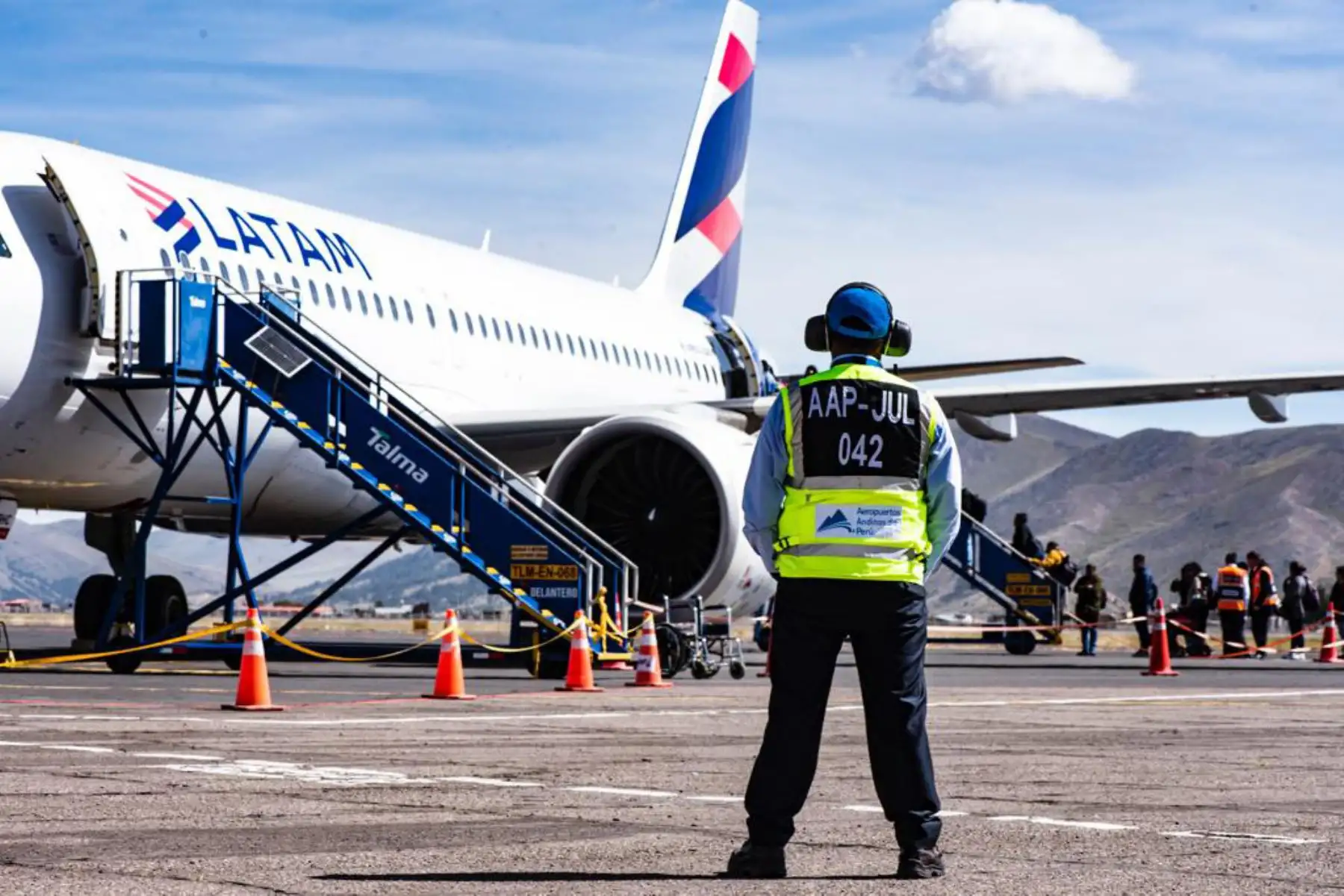 25/04/2023 La aeronave, de la compañía Latam, arribó al promediar las 08:30 horas y fue recibido por las autoridades del aeropuerto de Juliaca en medio de la alegría de los pasajeros y trabajadores quienes celebraron la reanudación de las operaciones en el aeropuerto de Juliaca. Foto: Aeropuertos Andinos del Perú