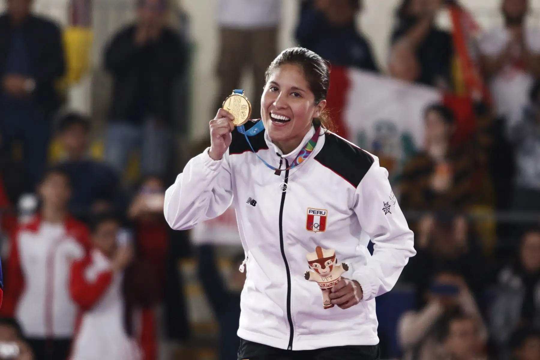 18/07/2021 Alexandra Grande de Perú (oro) durante la ceremonia de medallas para la competencia de Karate Femenino por debajo de 61 kg en el Polideportivo Villa El Salvador en los Juegos Panamericanos Lima 2019.