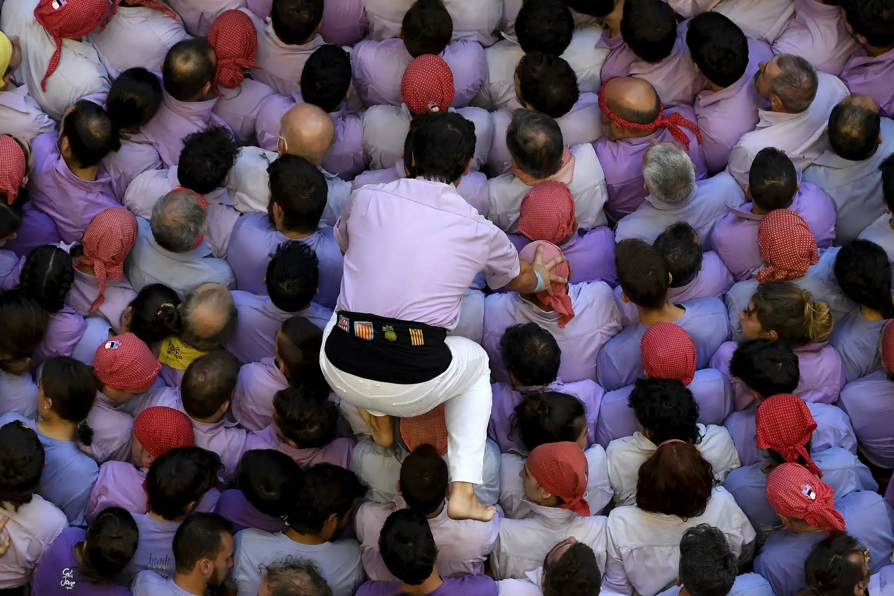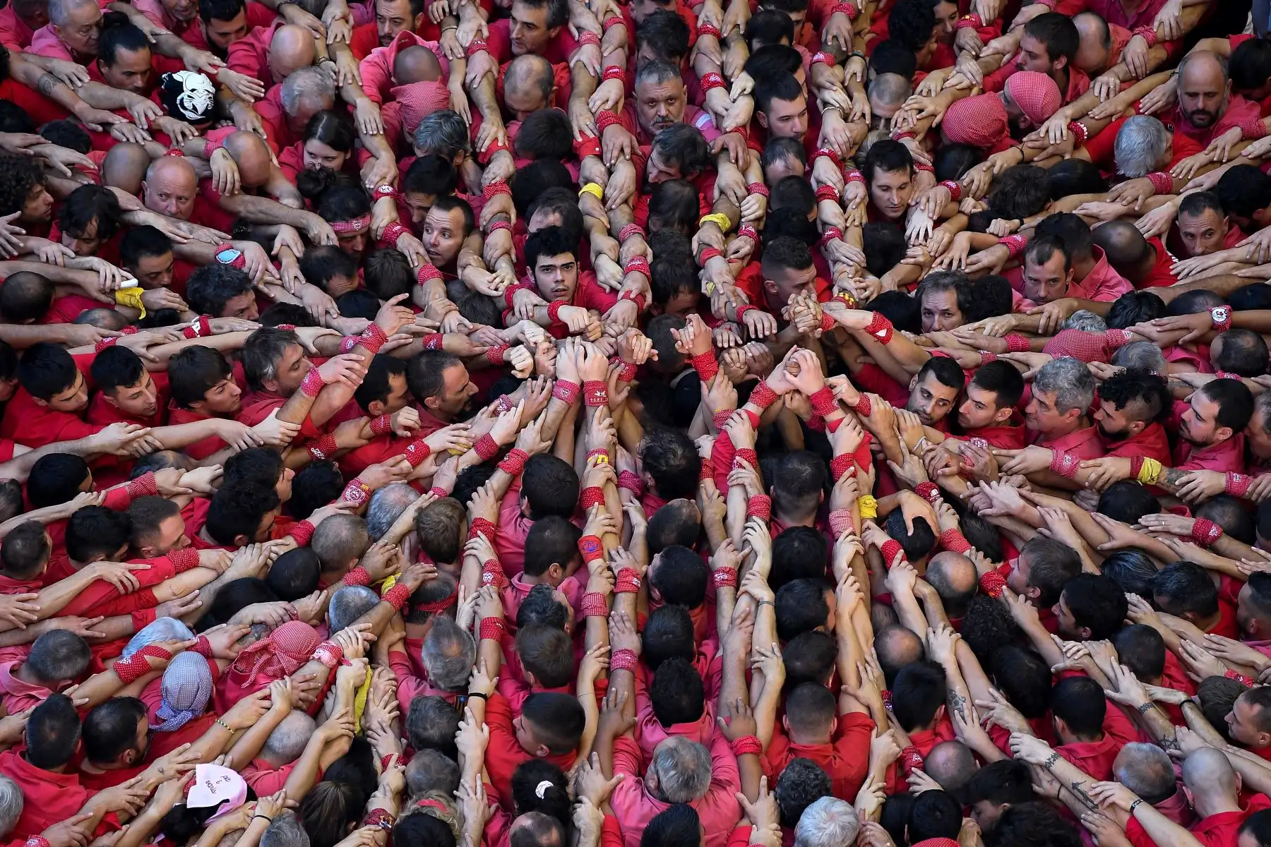 08/10/2024 Alrededor del castillo, los que forman la "pinya" sujetan las piernas de los dos primeros niveles para asegurar la solidez de la formación y amortiguar posibles caídas. Foto: AFP