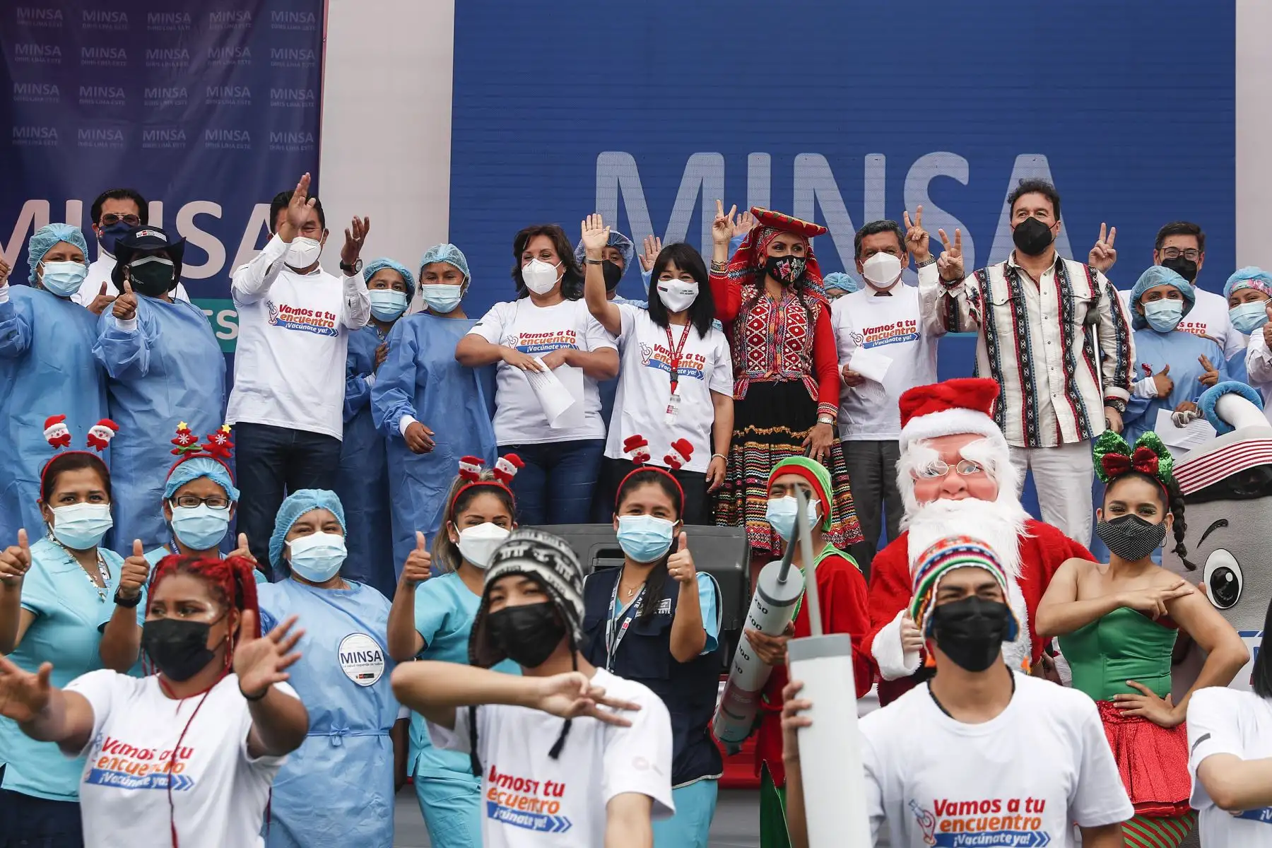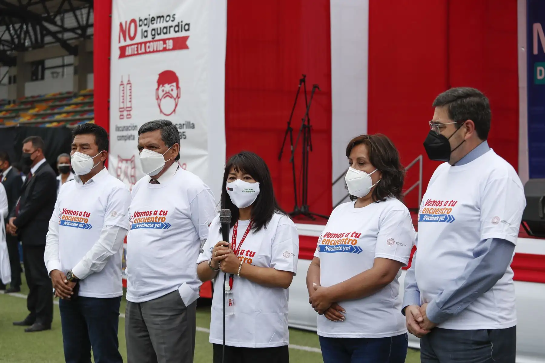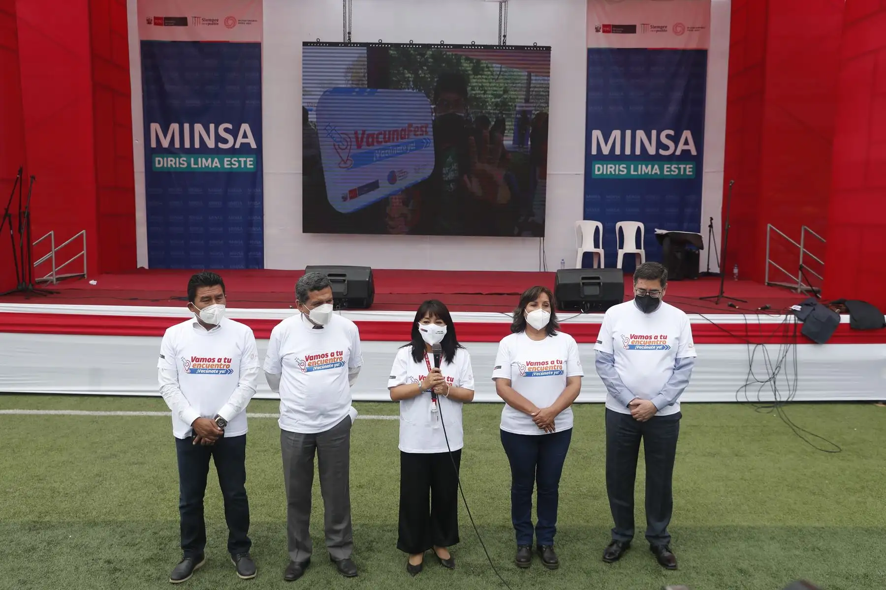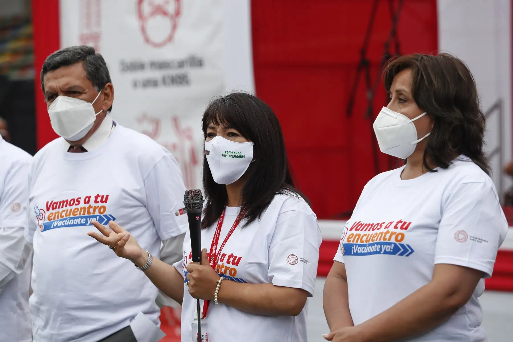 17/12/2021 La titular del PCM, Mirtha Vásquez, junto al ministro de Salud, Hernando Cevallos y la ministra de Inclusión Social, Dina Boluarte; participaron en el lanzamiento de la canción "El futuro está en nuestras manos” que sensibiliza a la población sobre la importancia de recibir las dos dosis de la vacuna contra la covid-19. El evento se desarrolló Complejo Deportivo Ollantaytambo, en Ate. Foto: ANDINA/Renato Pajuelo