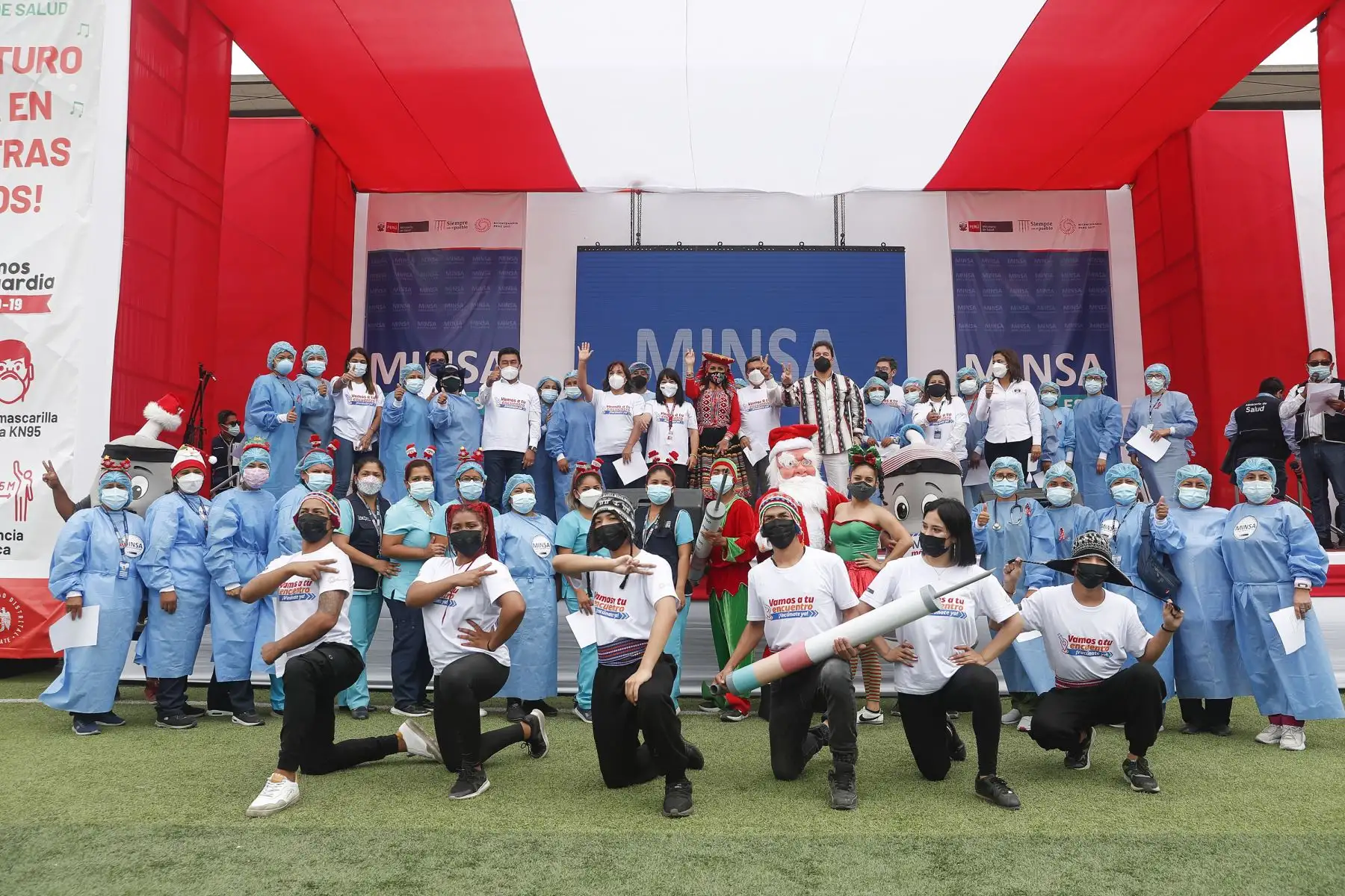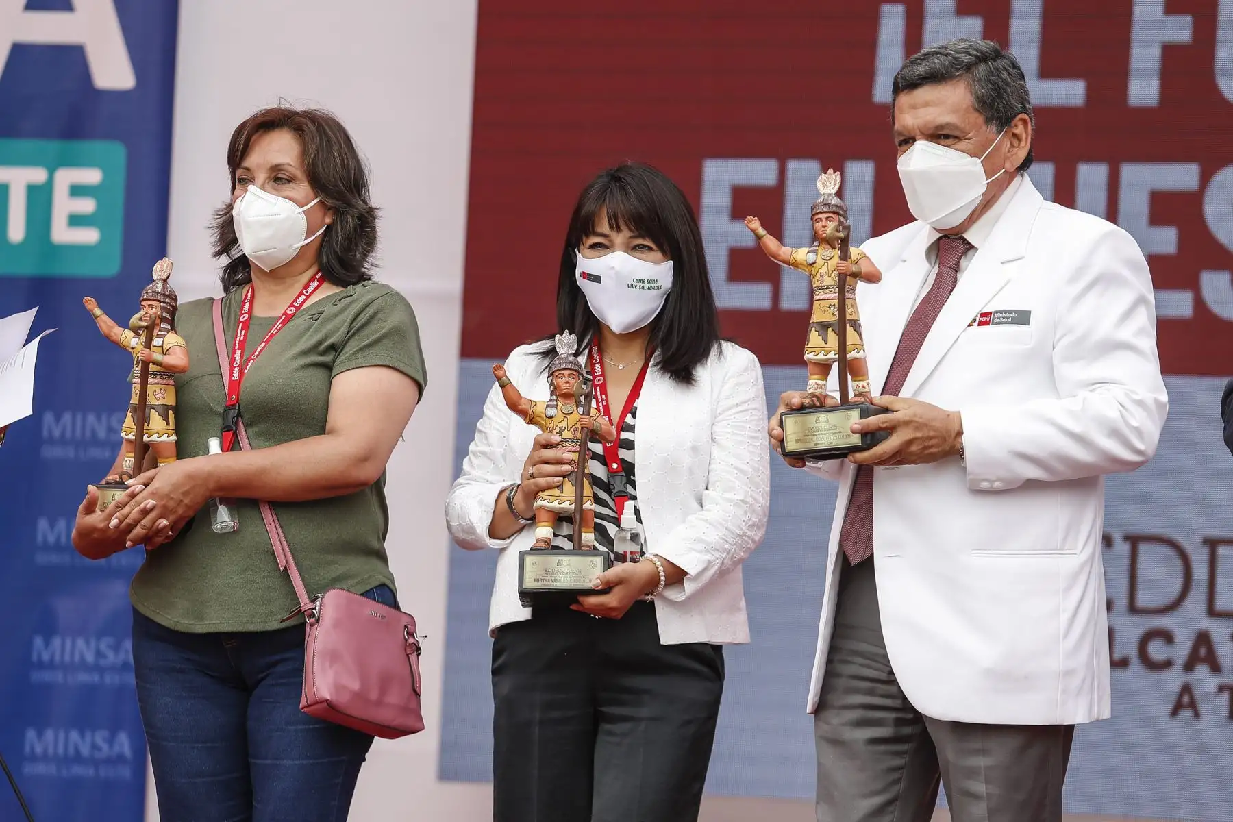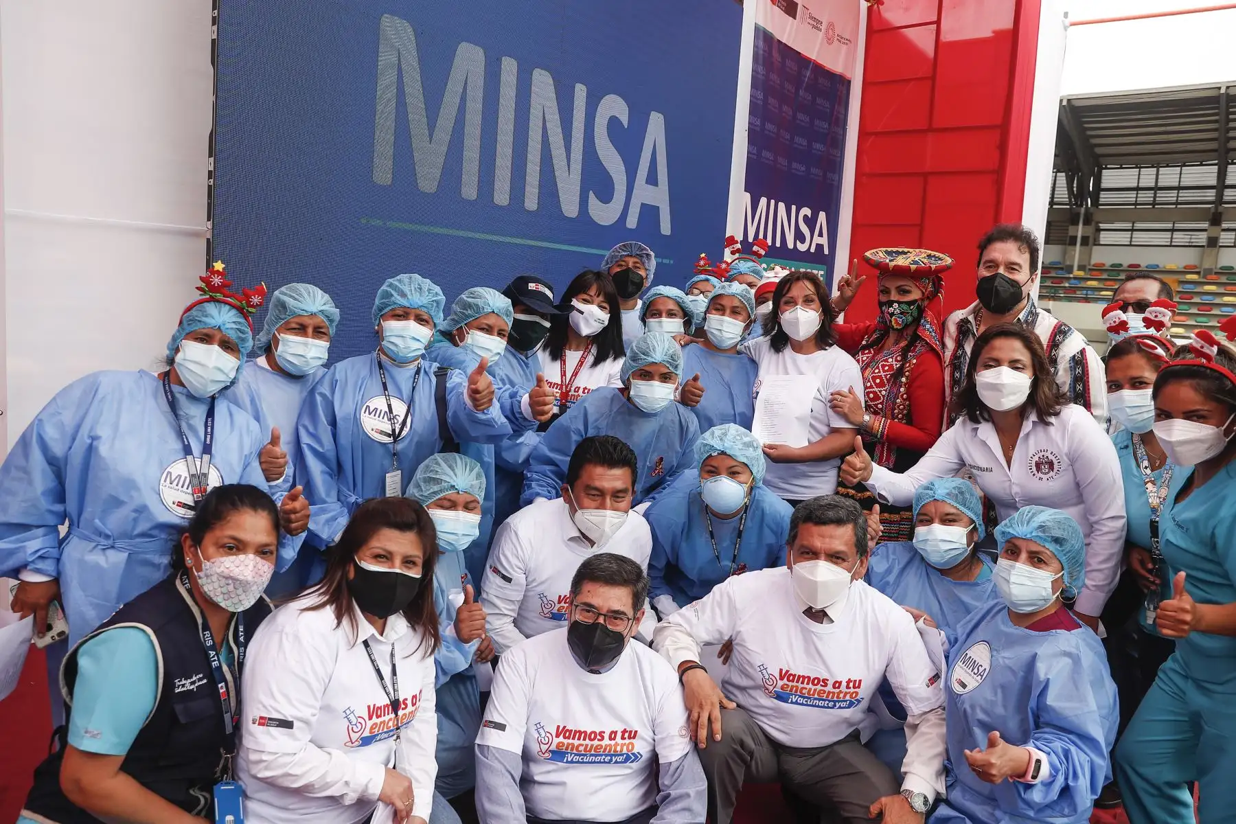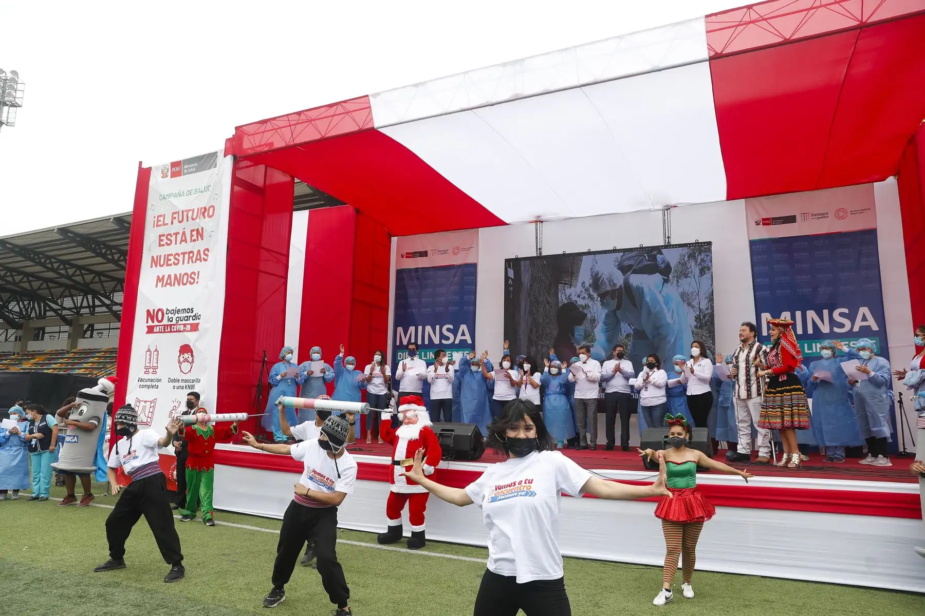 17/12/2021 La titular del PCM, Mirtha Vásquez, junto al ministro de Salud, Hernando Cevallos y la ministra de Inclusión Social, Dina Boluarte; participaron en el lanzamiento de la canción "El futuro está en nuestras manos” que sensibiliza a la población sobre la importancia de recibir las dos dosis de la vacuna contra la covid-19. El evento se desarrolló Complejo Deportivo Ollantaytambo, en Ate. Foto: ANDINA/Renato Pajuelo