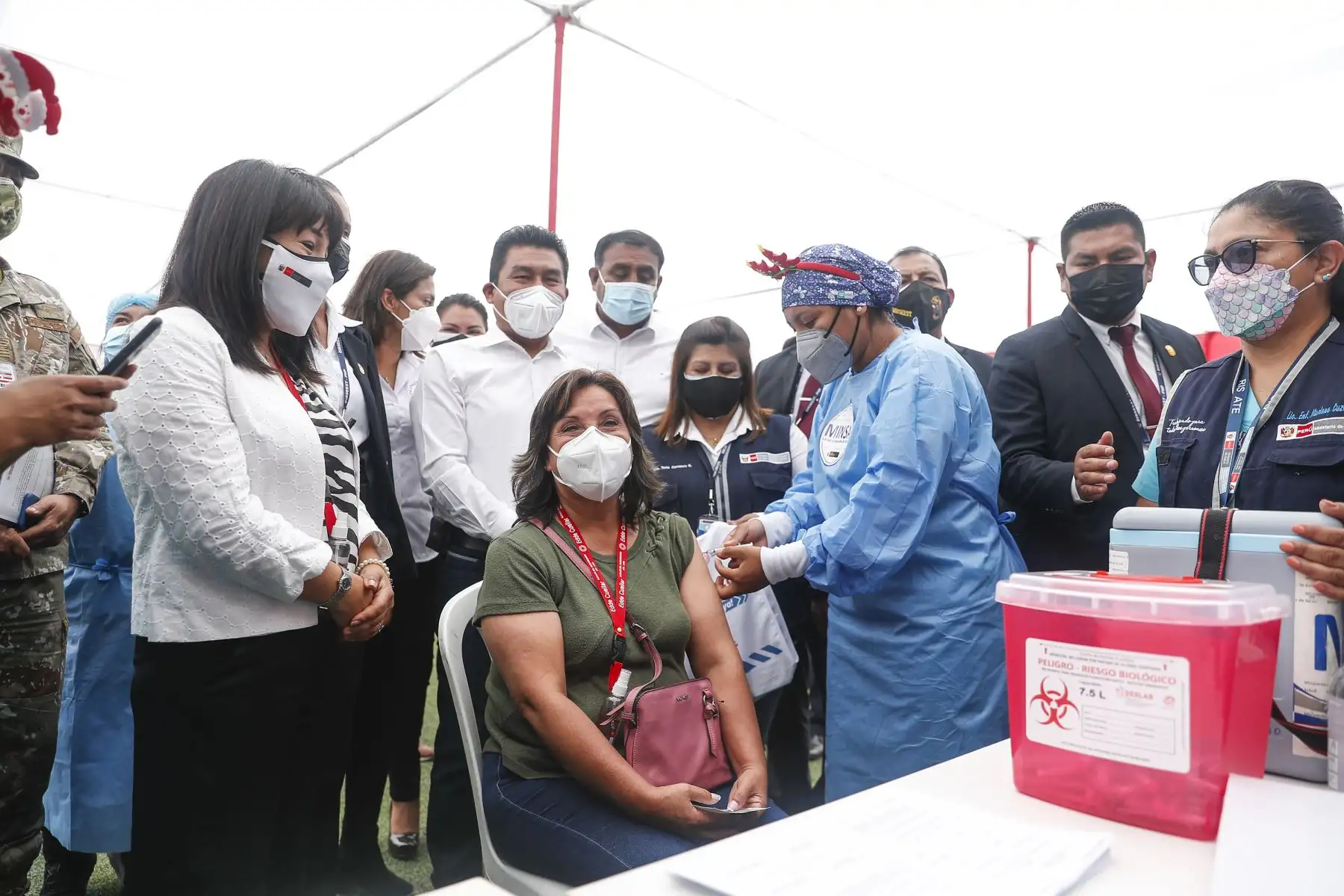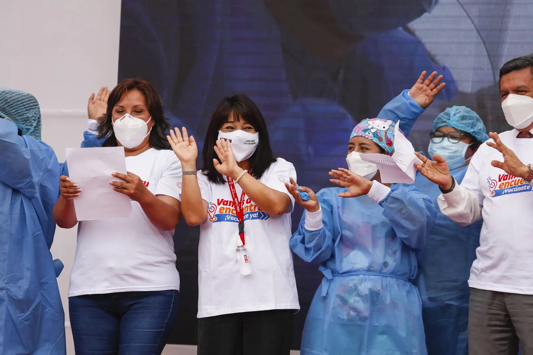 17/12/2021 La titular del PCM, Mirtha Vásquez, junto al ministro de Salud, Hernando Cevallos y la ministra de Inclusión Social, Dina Boluarte; participaron en el lanzamiento de la canción "El futuro está en nuestras manos” que sensibiliza a la población sobre la importancia de recibir las dos dosis de la vacuna contra la covid-19. Foto: ANDINA/Renato Pajuelo