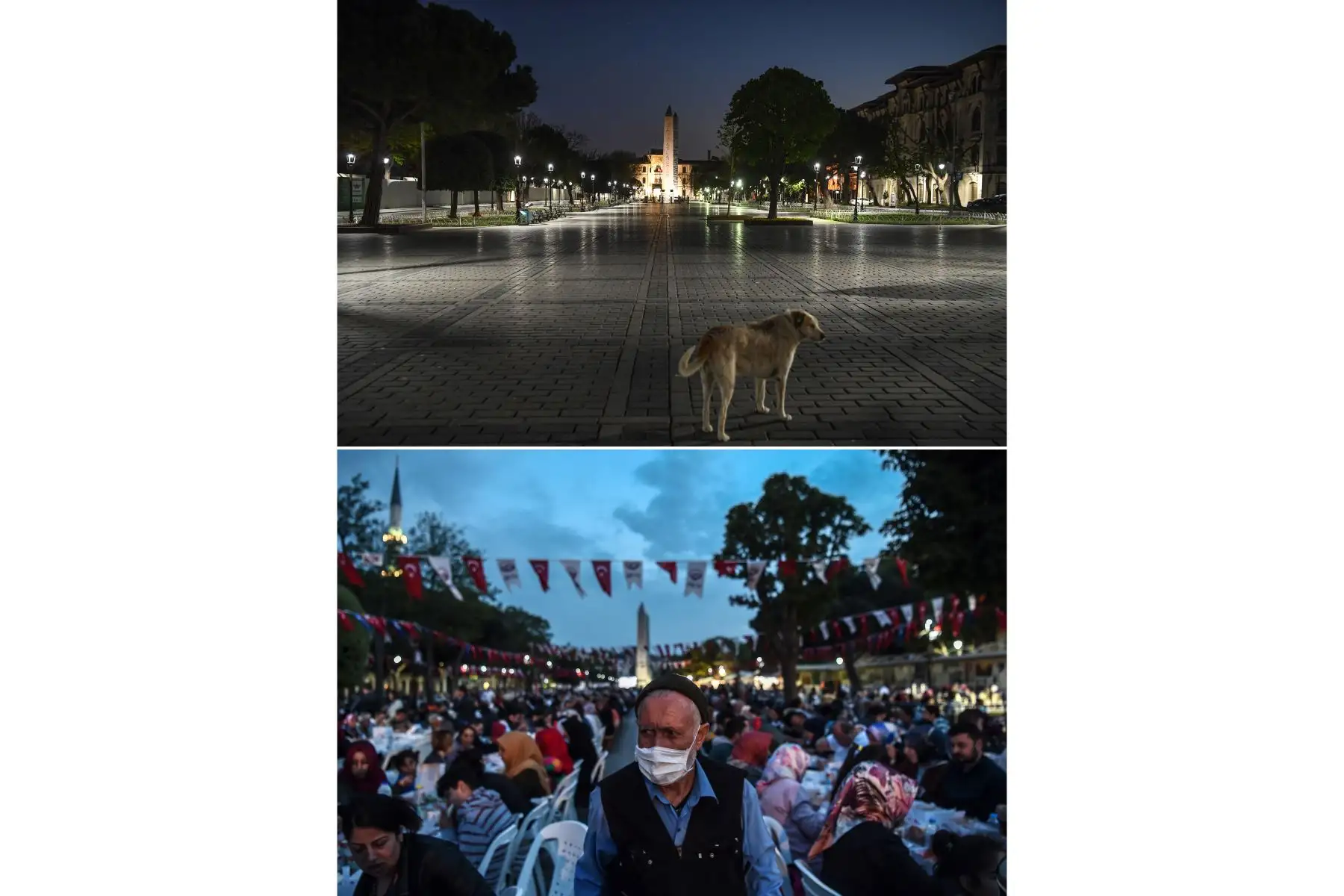 25/04/2020 Una combinación de dos imágenes tomadas el 24 de abril de 2019 muestra (arriba) un perro en la plaza desierta de Sultanahmet el 24 de abril de 2020 (abajo) por las medidas que se toman para frenar el Covid-19. Foto: AFP