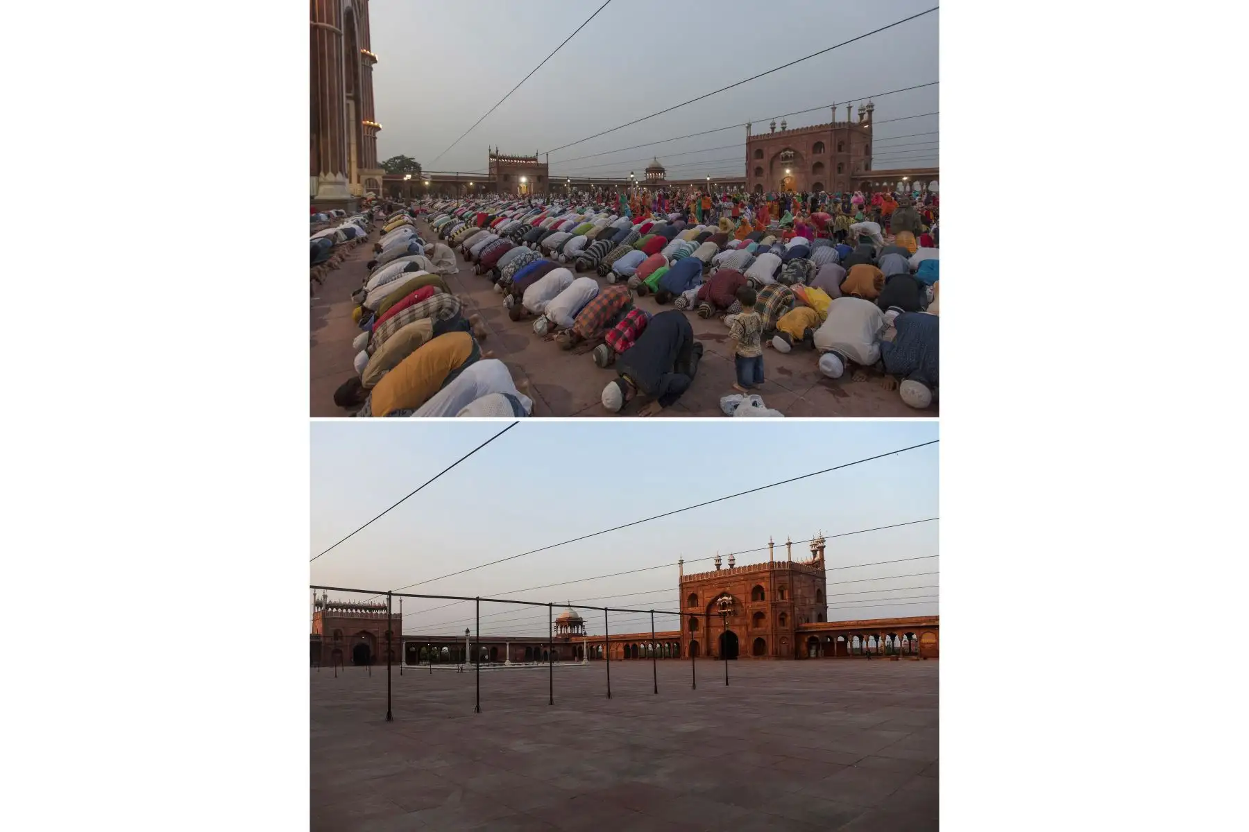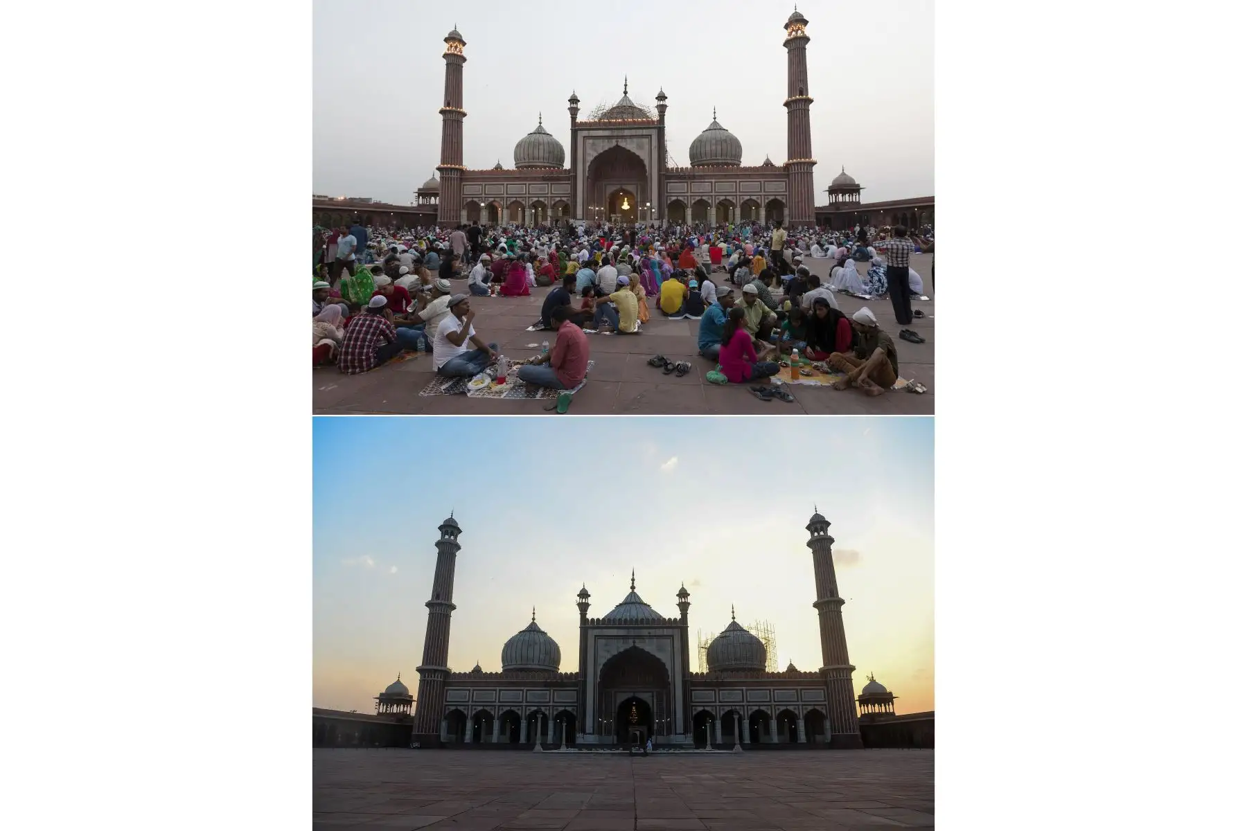 25/04/2020 (arriba) devotos musulmanes ofrecen oraciones después de un ayuno durante su mes sagrado del Ramadán en la mezquita Jama Masjid en Nueva Delhi el 5 de junio de 2018, y (abajo) luce así una mezquita vacía el 25 abril 2020 debido a acciones del gobierno para evitar propagación del coronavirus. Foto: AFP