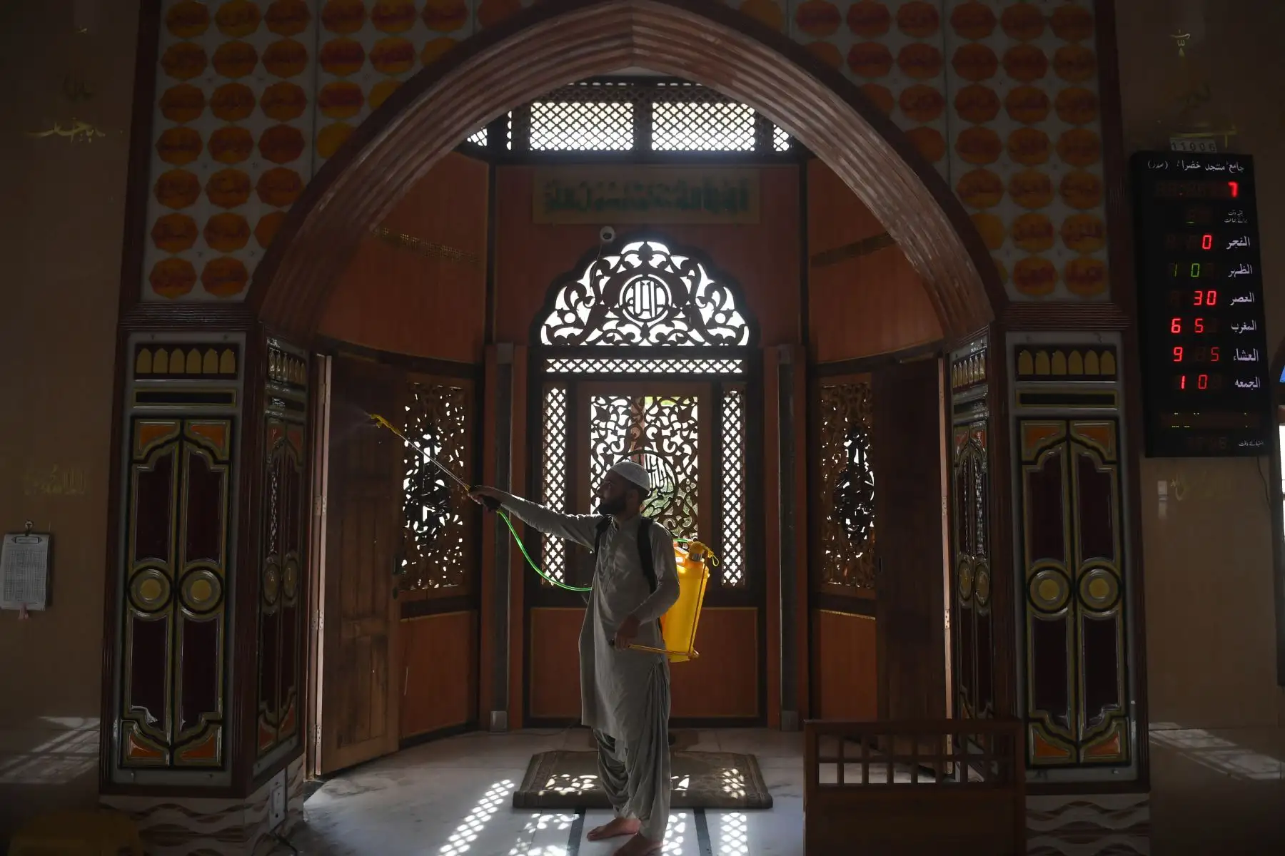 25/04/2020 Un devoto musulmán rocía desinfectante en una mezquita antes del mes sagrado musulmán del Ramadán durante un bloqueo nacional impuesto por el gobierno como medida preventiva contra el coronavirus. Foto: AFP