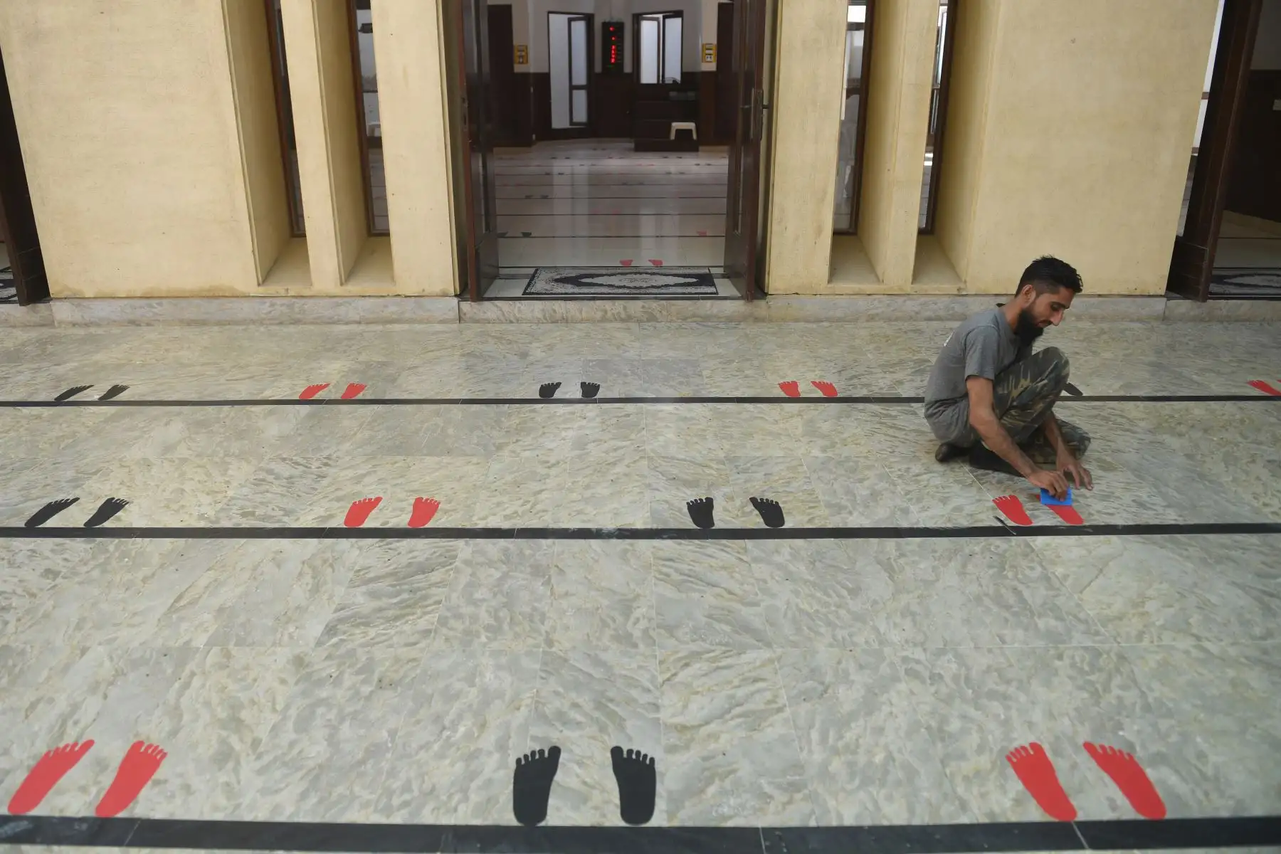 25/04/2020 Un devoto musulmán coloca calcomanías de siluetas de pies en el suelo de una mezquita para mantener la distancia social. Foto: AFP