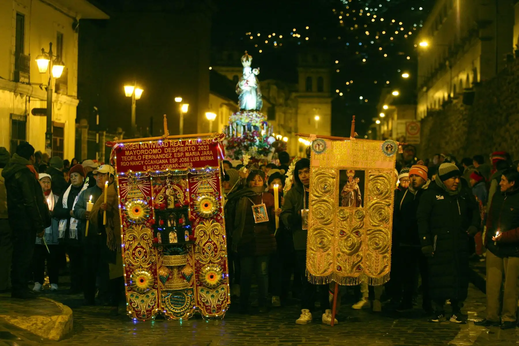 29/08/2023 La sagrada imagen de la Virgen de la Natividad recorre las calles de la ciudad de Cusco en procesión.Pasada las 02:00 horas se abrieron las puertas del templo colonial de La Almudena.