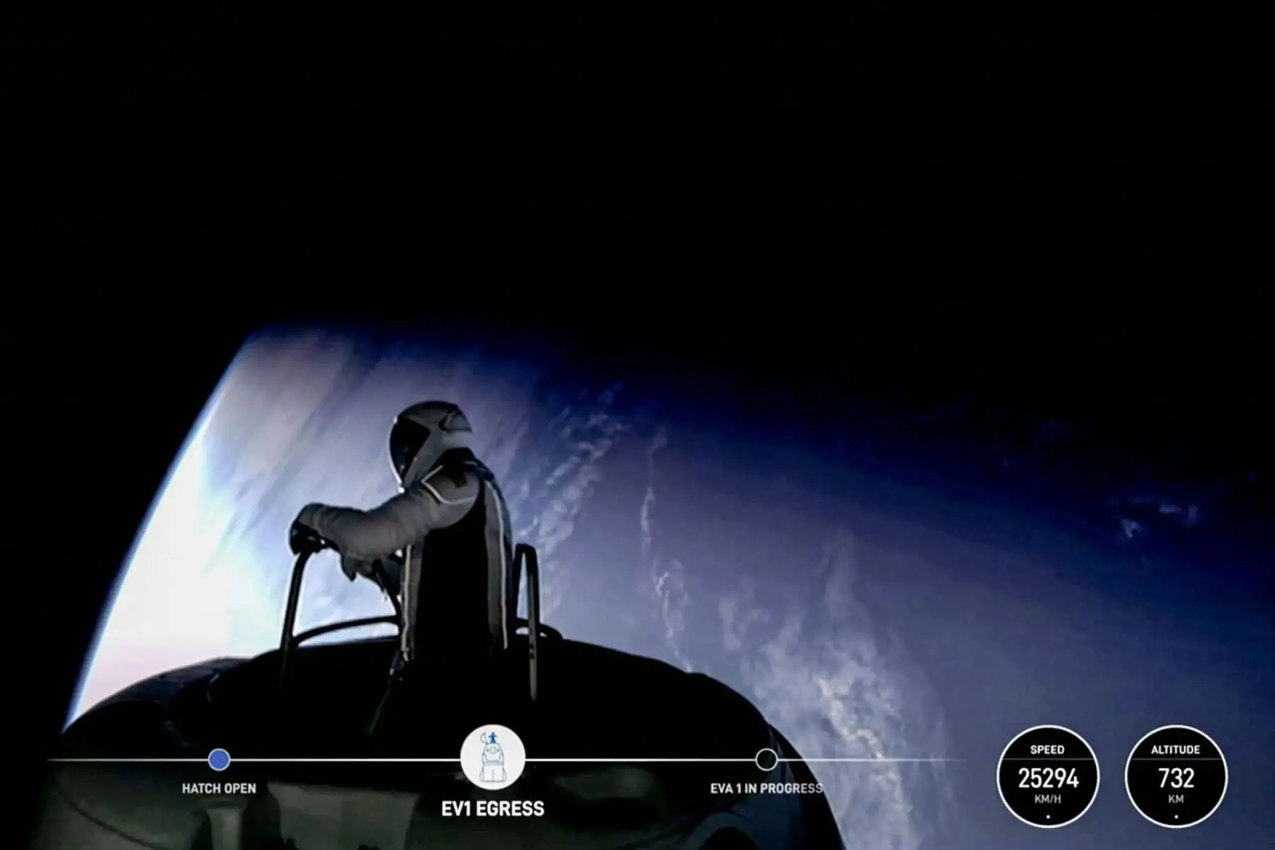 12/09/2024 El multimillonario estadounidense Jared Isaacman, comandante de la misión, fue el primero en salir de la cápsula, agarrándose a una estructura metálica instalada en la parte delantera de la cápsula para la ocasión, según se vio en un video emitido en directo desde la empresa. Foto: EFE