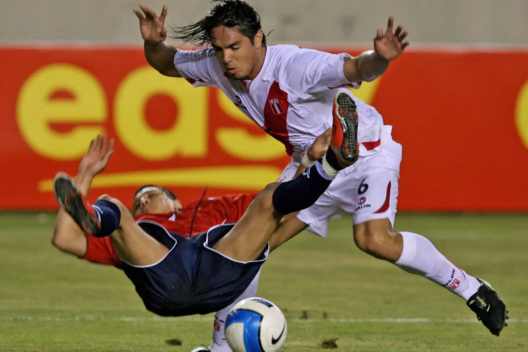 13/08/2024 Alexis Sánchez de Chile recibe una falta por penalti de Juan Manuel Vargas de Perú durante el partido de fútbol clasificatorio para la Copa Mundial de la FIFA Sudáfrica 2010 en el estadio Monumental de Lima.