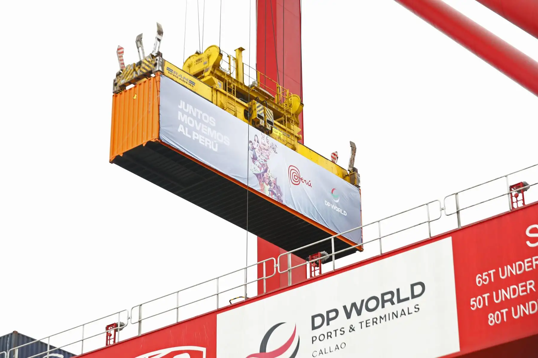 08/11/2024 Durante la ceremonia de entrega del Certificado de Licencia de la Marca Perú al terminal de contenedores DP World Callao, se cargó con una de las grúas un contenedor envuelto con un banner de la Marca Perú, de manera simbólica. Foto: ANDINA/Daniel Bracamonte