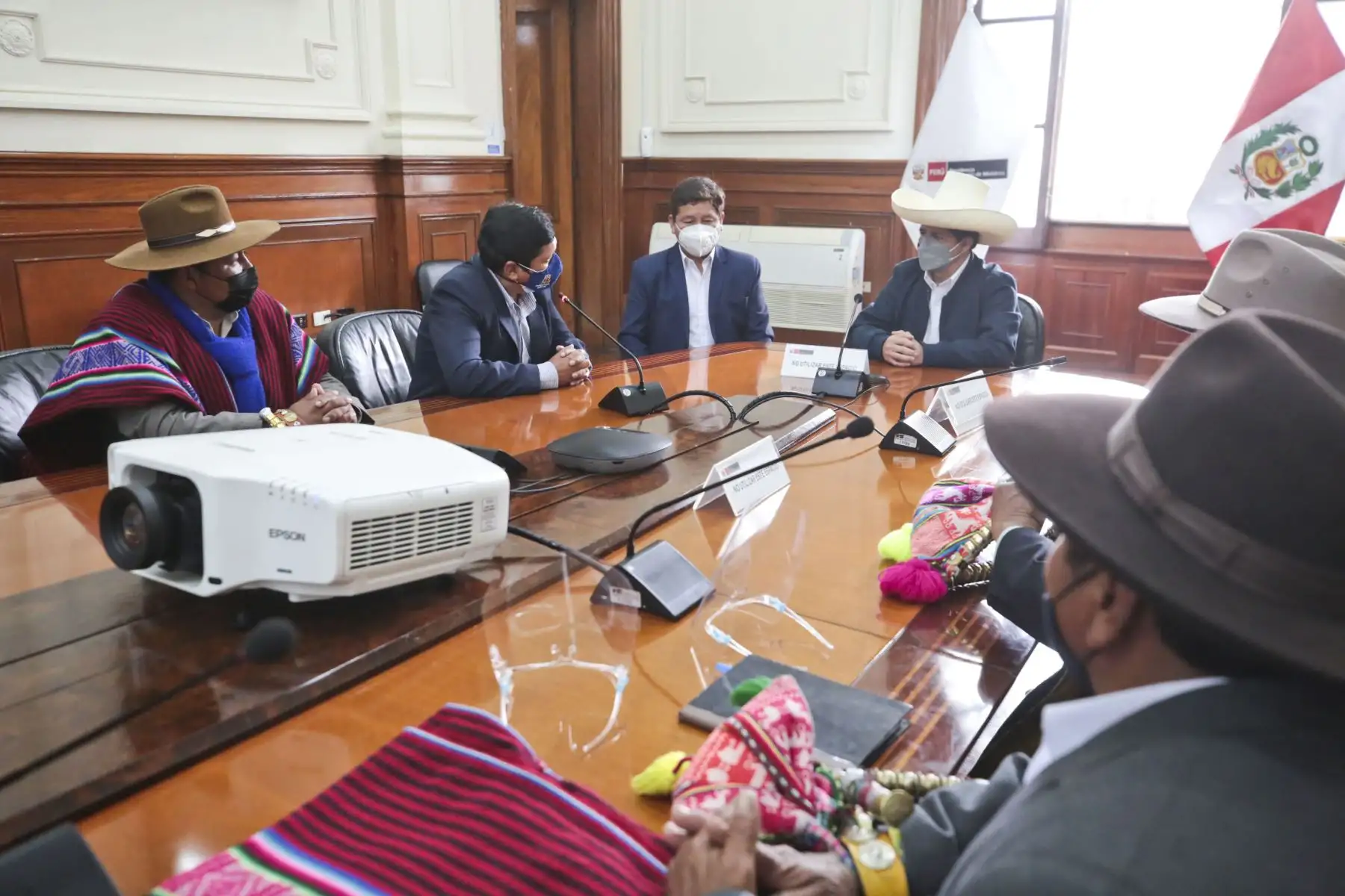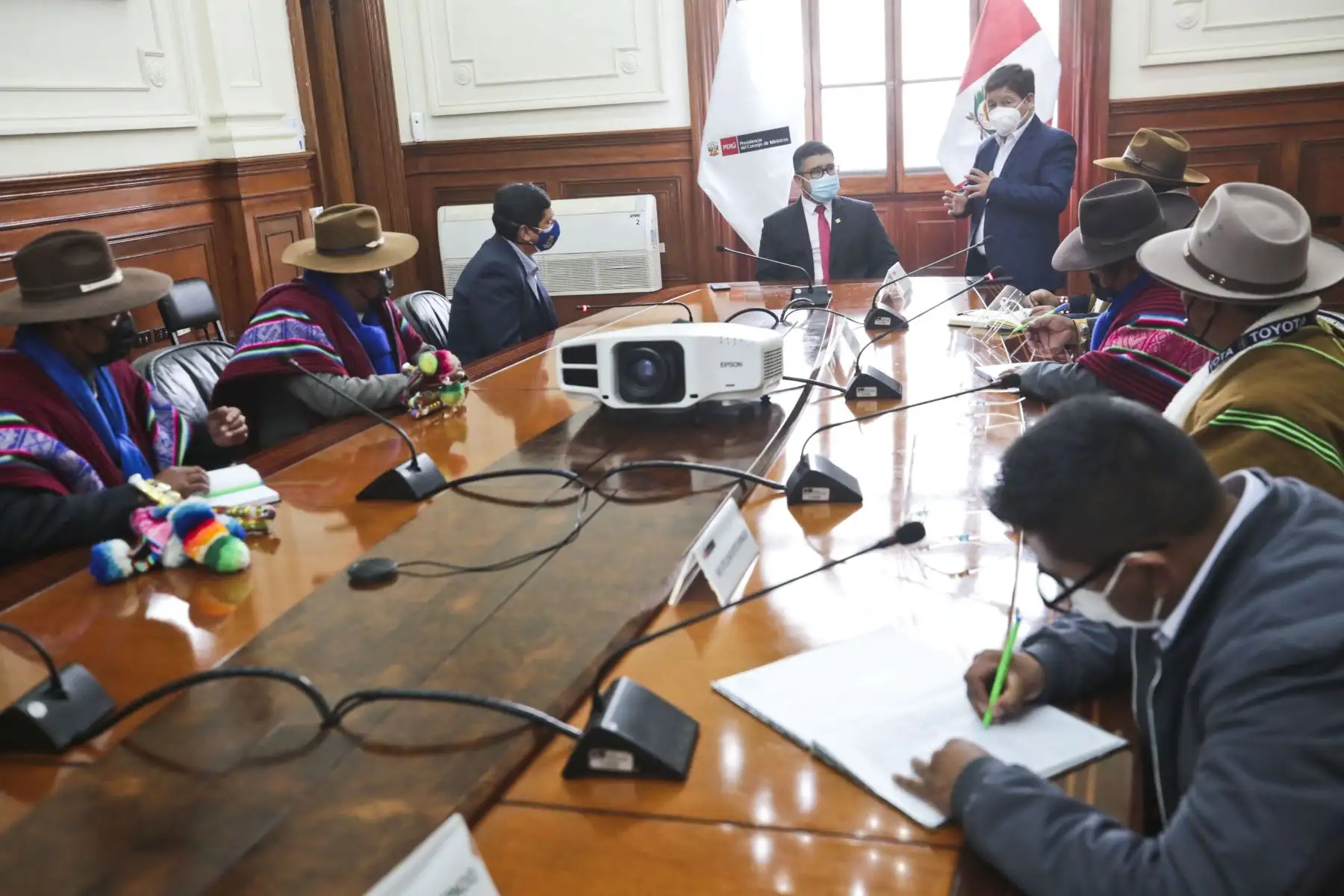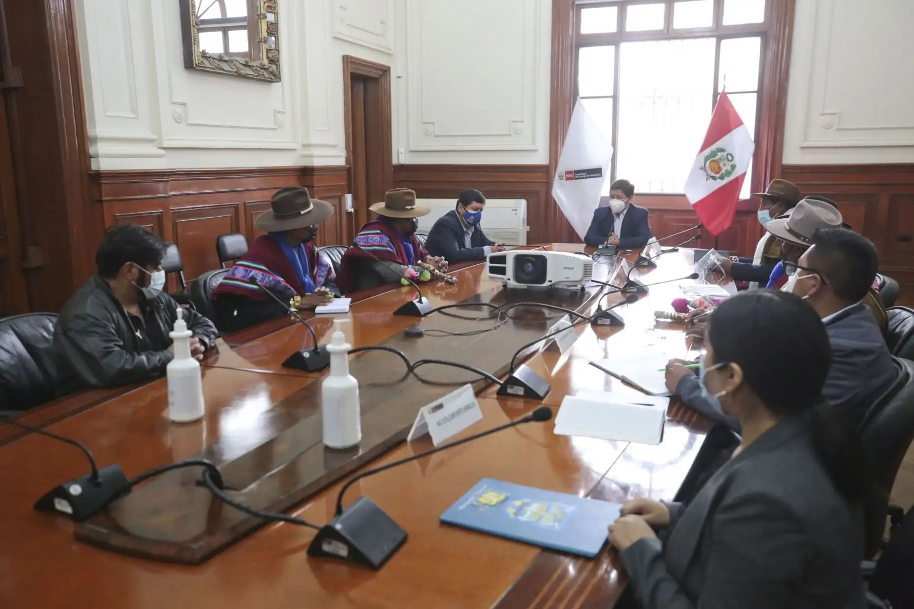 03/08/2021 El Presidente Pedro Castillo, el Premier Guido Bellido y el ministro de Vivienda, Construcción y Saneamiento, Geiner Alvarado, recibió hoy en la Presidencia del Consejo de Ministros, en Palacio de Gobierno, a una delegación de la provincia de Huancané, Puno, que solicitó la incorporación de su proyecto de mejoramiento del servicio de agua potable y alcantarillado en el programa de inversiones del Gobierno.
