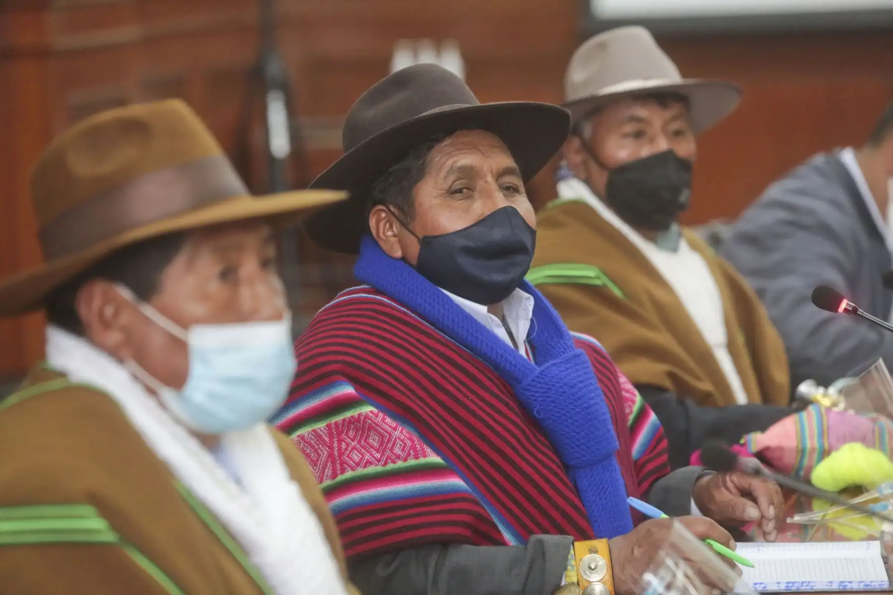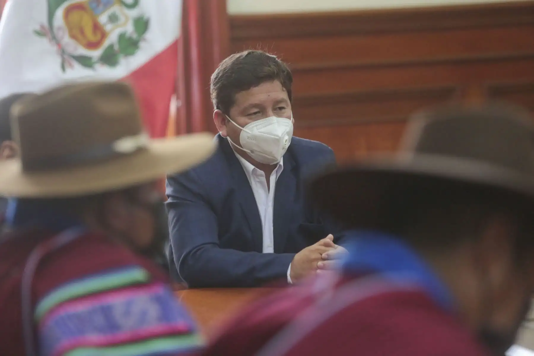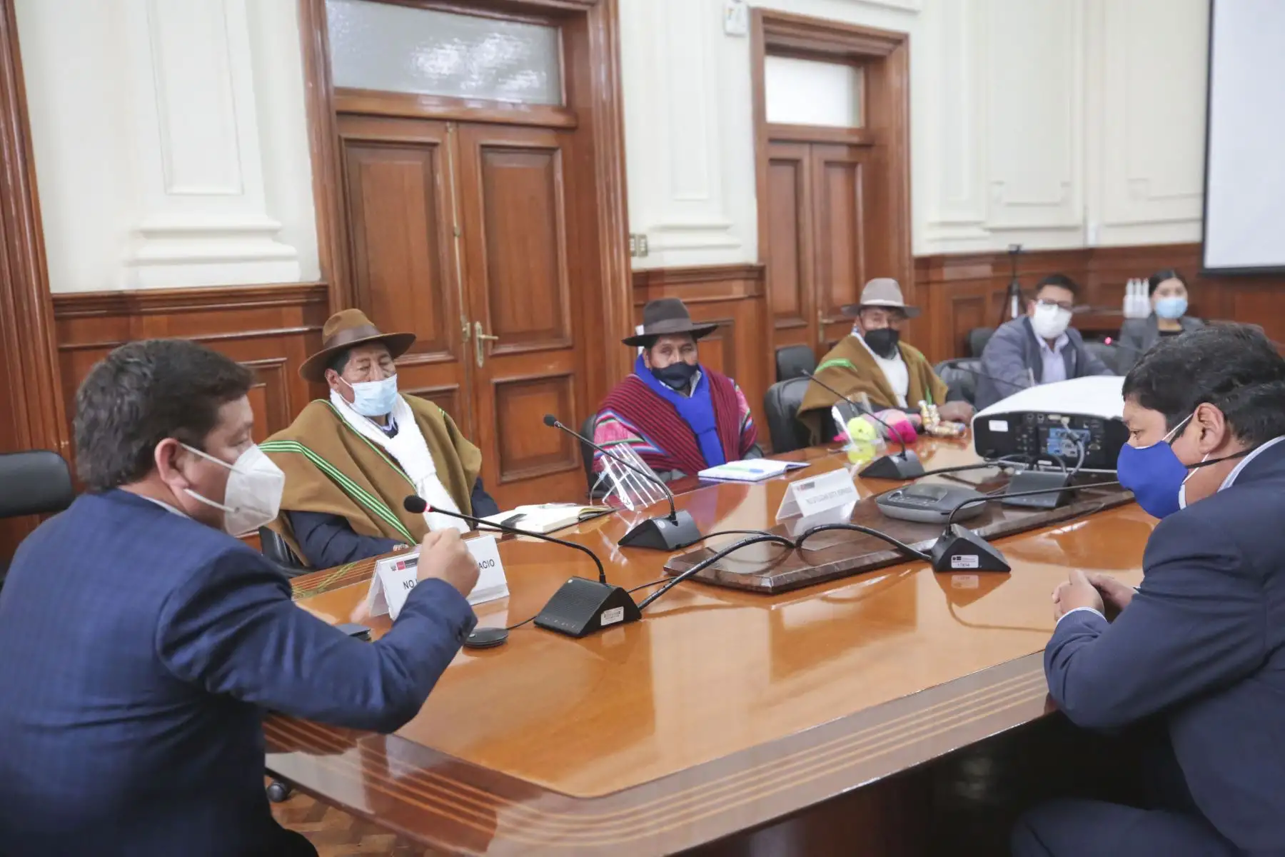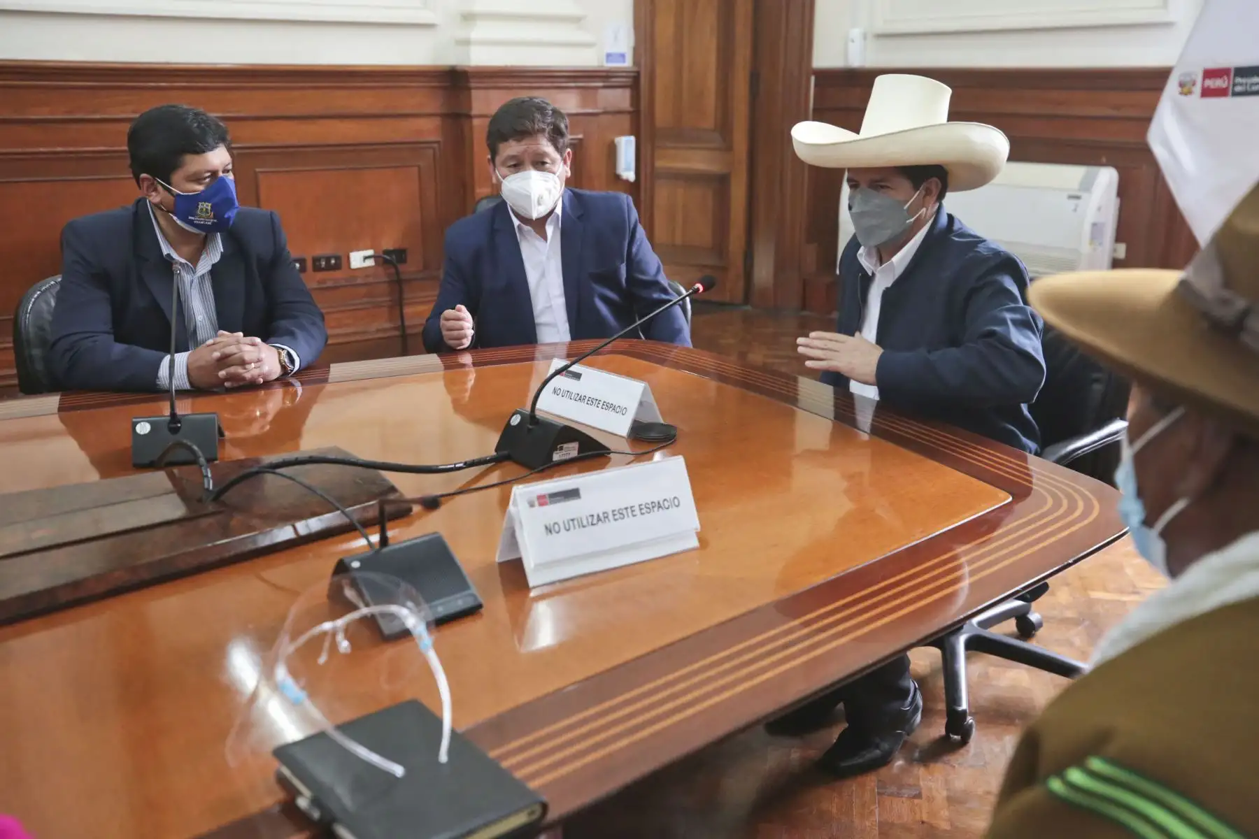 03/08/2021 El Presidente Pedro Castillo, el Premier Guido Bellido y el ministro de Vivienda, Construcción y Saneamiento, Geiner Alvarado, recibió hoy en la Presidencia del Consejo de Ministros, en Palacio de Gobierno, a una delegación de la provincia de Huancané, Puno, que solicitó la incorporación de su proyecto de mejoramiento del servicio de agua potable y alcantarillado en el programa de inversiones del Gobierno.
