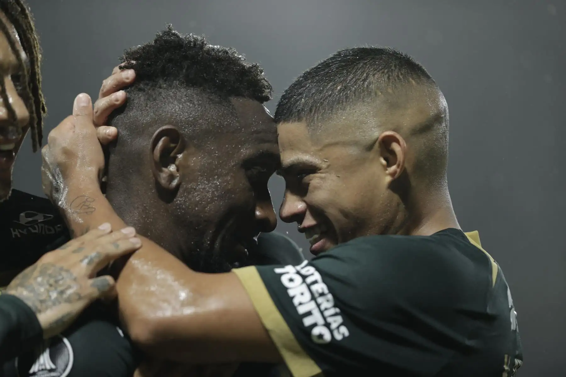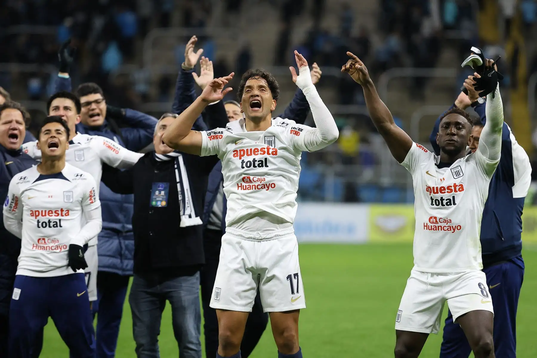 12/08/2025 El mediocampista de Alianza Lima, Jean Archimbaud, y el mediocampista ecuatoriano, Eryc Castillo, celebran tras clasificar a los octavos de final durante el partido de eliminatoria de la Copa Sudamericana entre Gremio de Brasil y Alianza Lima de Perú en el estadio Arena do Gremio en Porto Alegre. Foto: ANDINA/ AFP
