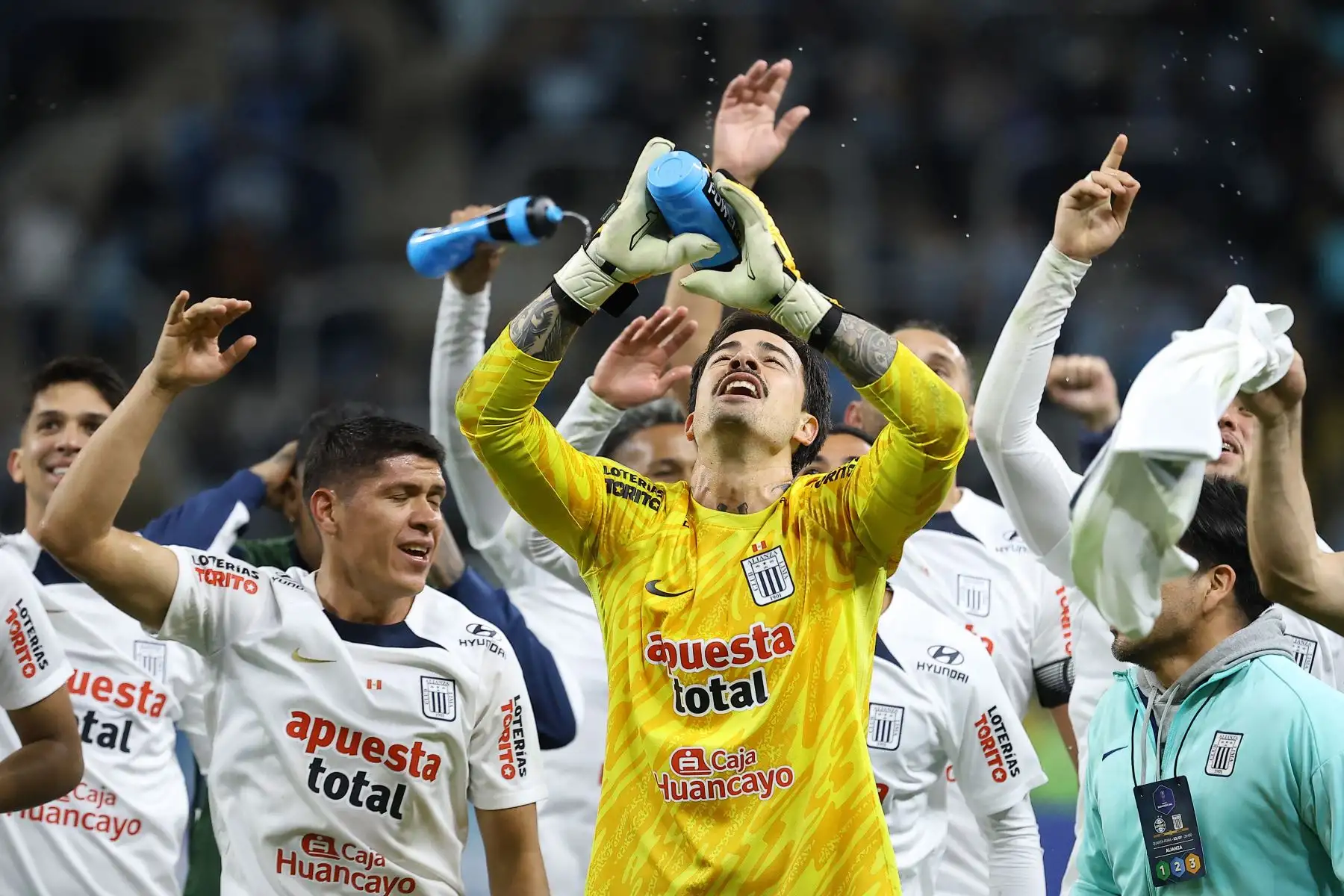 12/08/2025 El portero boliviano de Alianza Lima, Guillermo Viscarra , celebra con sus compañeros tras clasificar a los octavos de final durante el partido de eliminatoria de la Copa Sudamericana entre Gremio de Brasil y Alianza Lima de Perú en el estadio Arena do Gremio en Porto Alegre. Foto. ANDINA/AFP