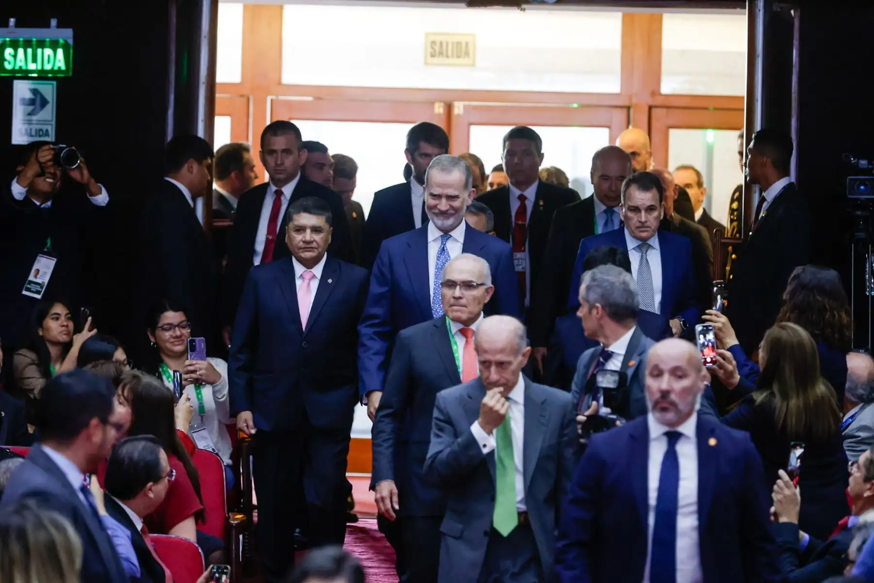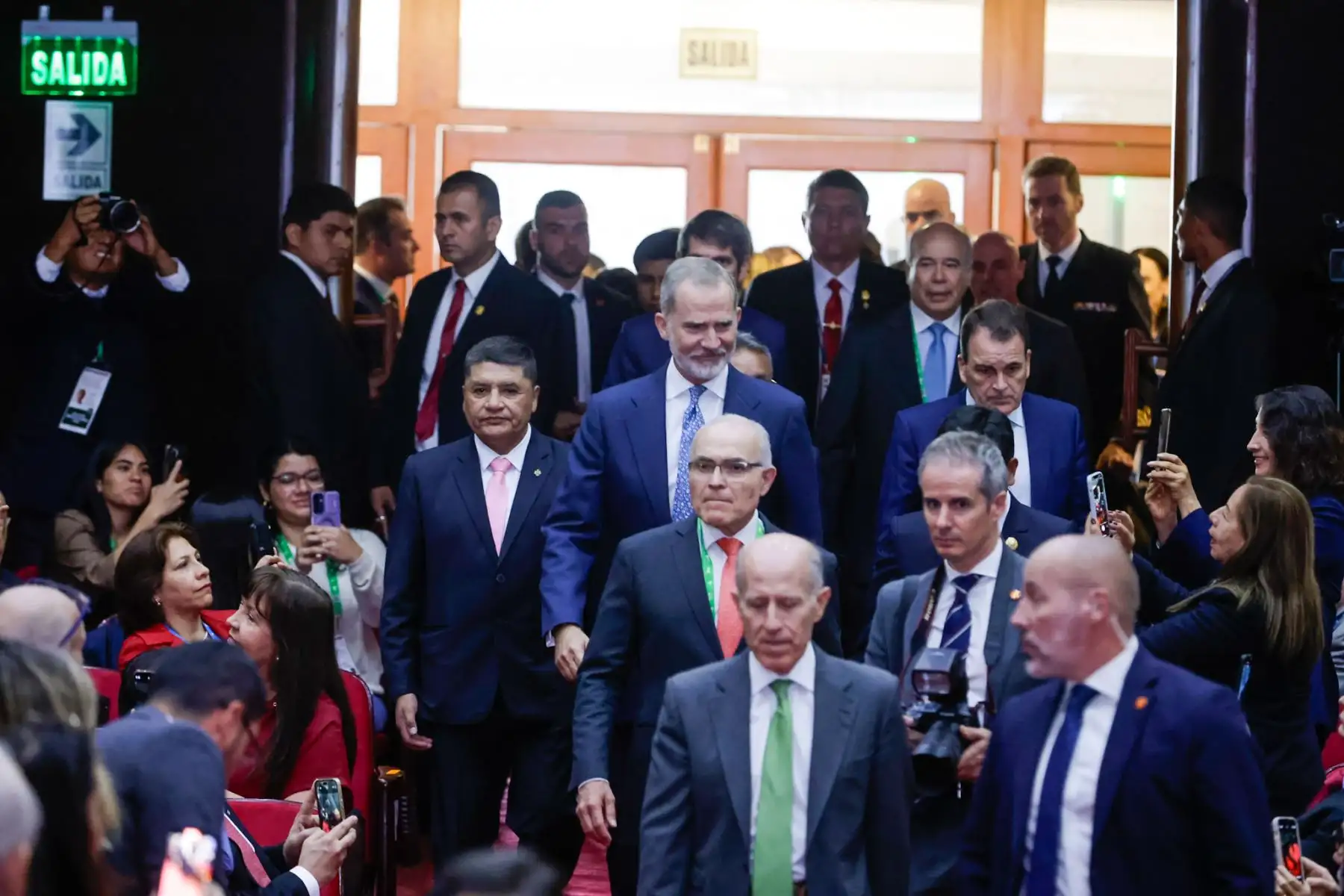 15/10/2025 El rey Felipe VI de España ingresó al majestuoso Teatro Municipal de Arequipa para participar en la inauguración del X Congreso Internacional de la Lengua Española (CILE). Su entrada fue recibida con aplausos y honores, mientras las autoridades locales lo acompañaban por el escenario principal, marcando un momento simbólico de unión cultural entre España y el Perú, en el corazón de la “ciudad blanca”. Foto: ANDINA/Luis Iparraguirre