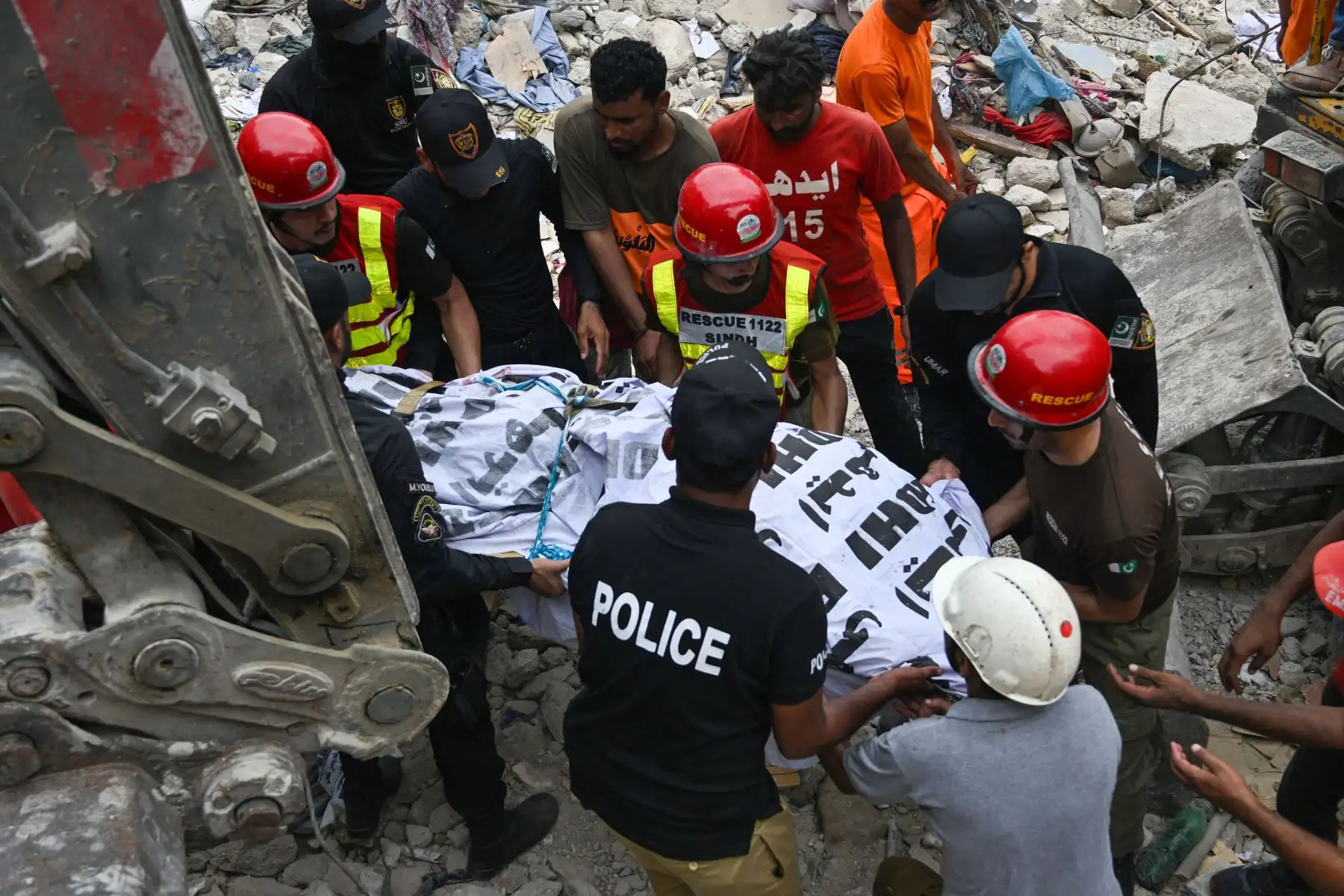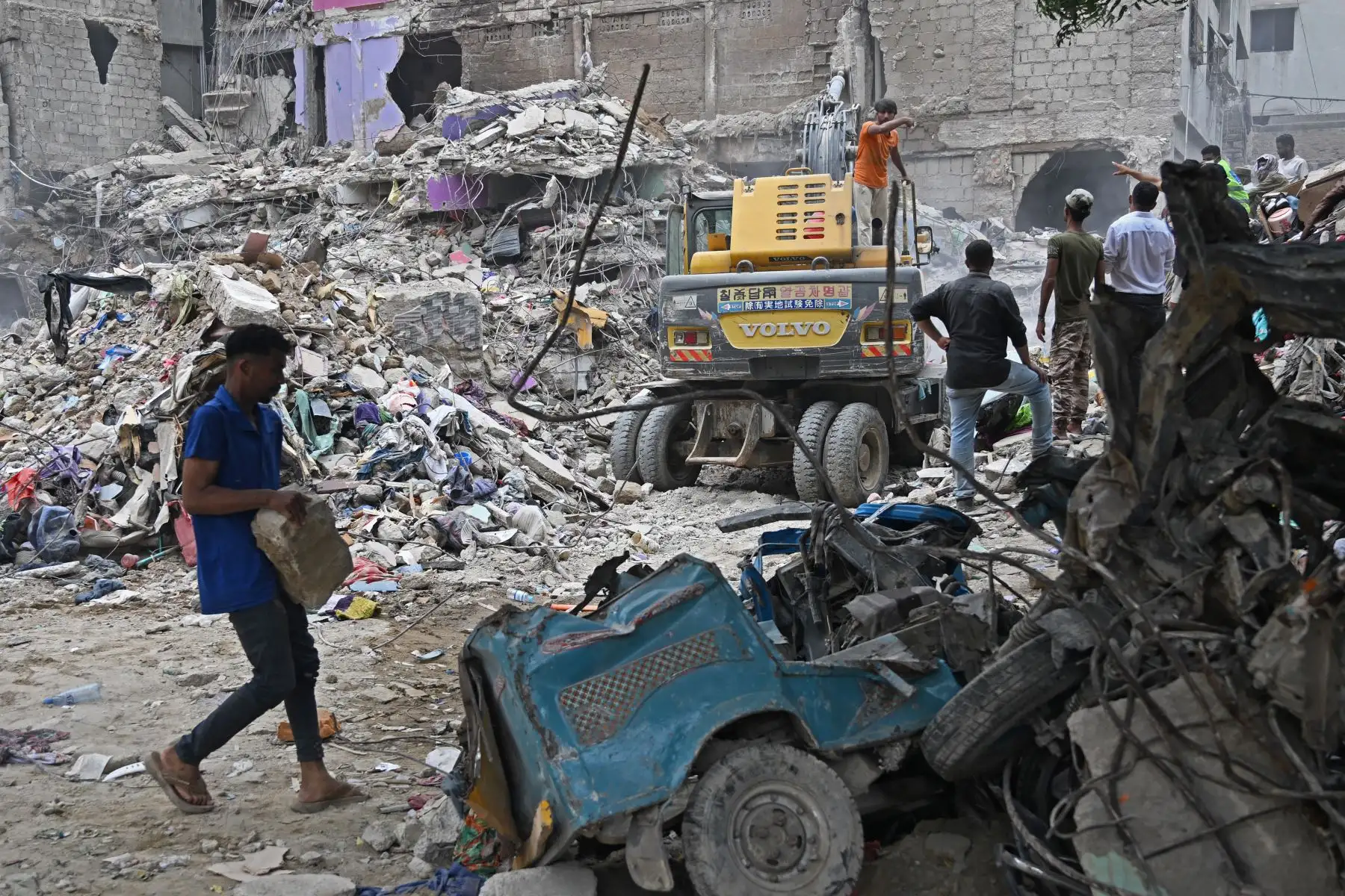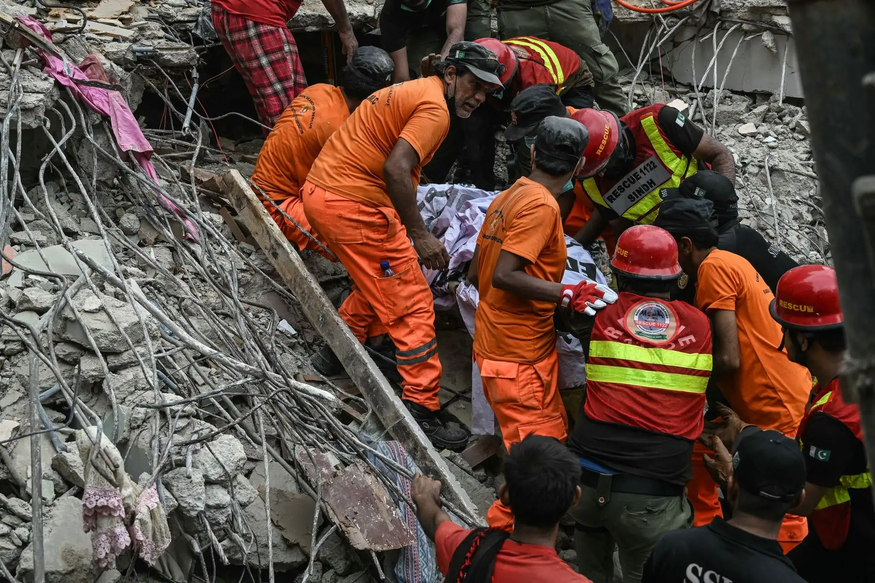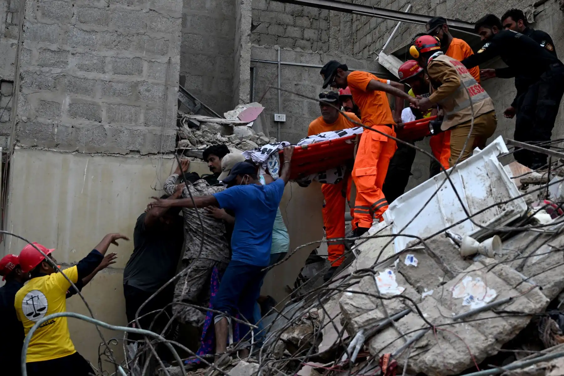 06/07/2025 Los equipos de rescate recuperan el cuerpo de una víctima tras el derrumbe de un edificio residencial en Karachi. Un edificio de cinco plantas se derrumbó en Pakistán, mientras los rescatistas buscan entre los escombros a las víctimas atrapadas. Foto. ANDINA/AFP