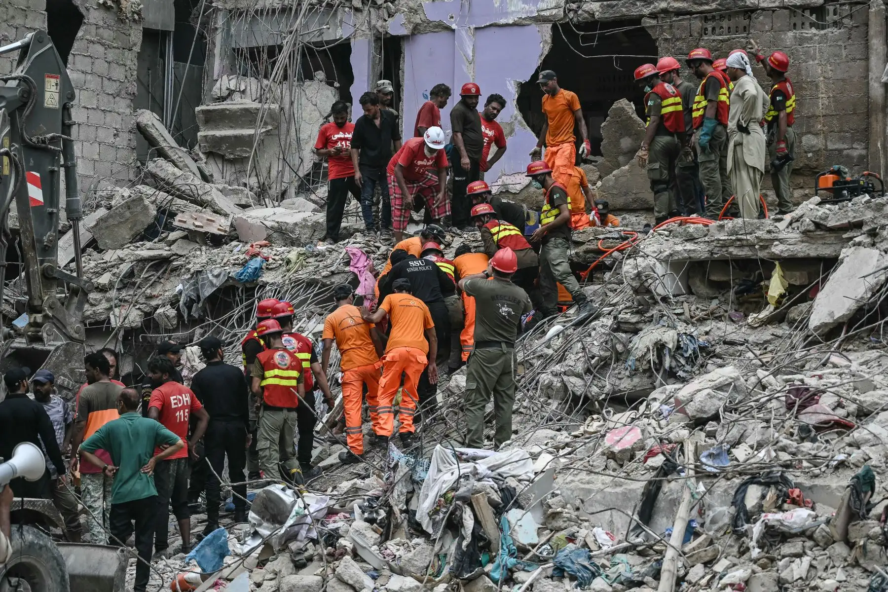 06/07/2025 Los equipos de rescate realizan una operación de búsqueda entre los escombros de un edificio residencial derrumbado en Karachi. Los equipos de rescate extrajeron más cuerpos de entre los escombros del derrumbe de un edificio de cinco plantas en Pakistán durante la noche, mientras la operación de recuperación continuaba por segundo día. Foto: ANDINA/AFP