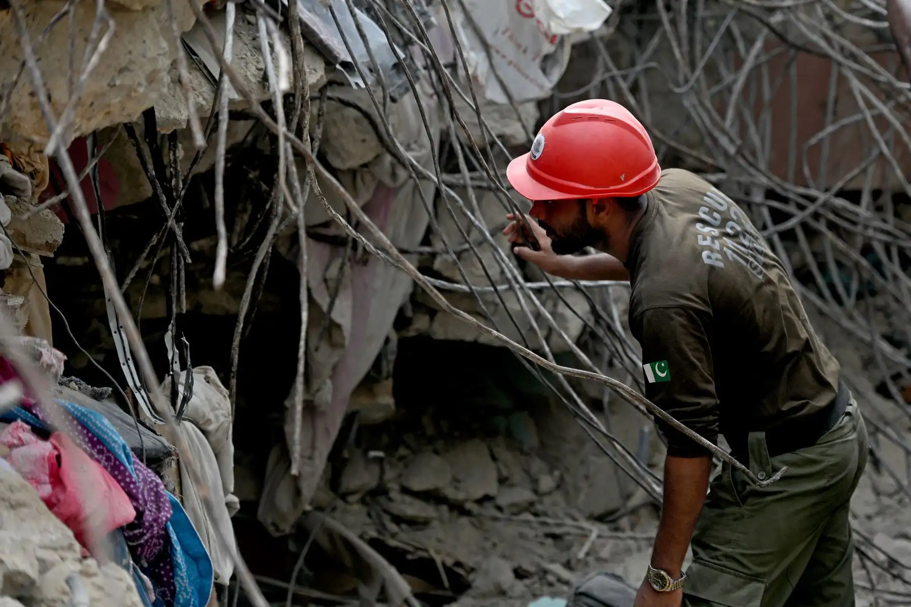 06/07/2025 Un rescatista durante una operación de búsqueda entre los escombros de un edificio derrumbado en Karachi. Los equipos de rescate recuperaron más cuerpos de entre los escombros del derrumbe de un edificio de cinco plantas en Pakistán durante la noche, mientras la operación de recuperación continuaba por segundo día. Foto: ANDINA/ AFP