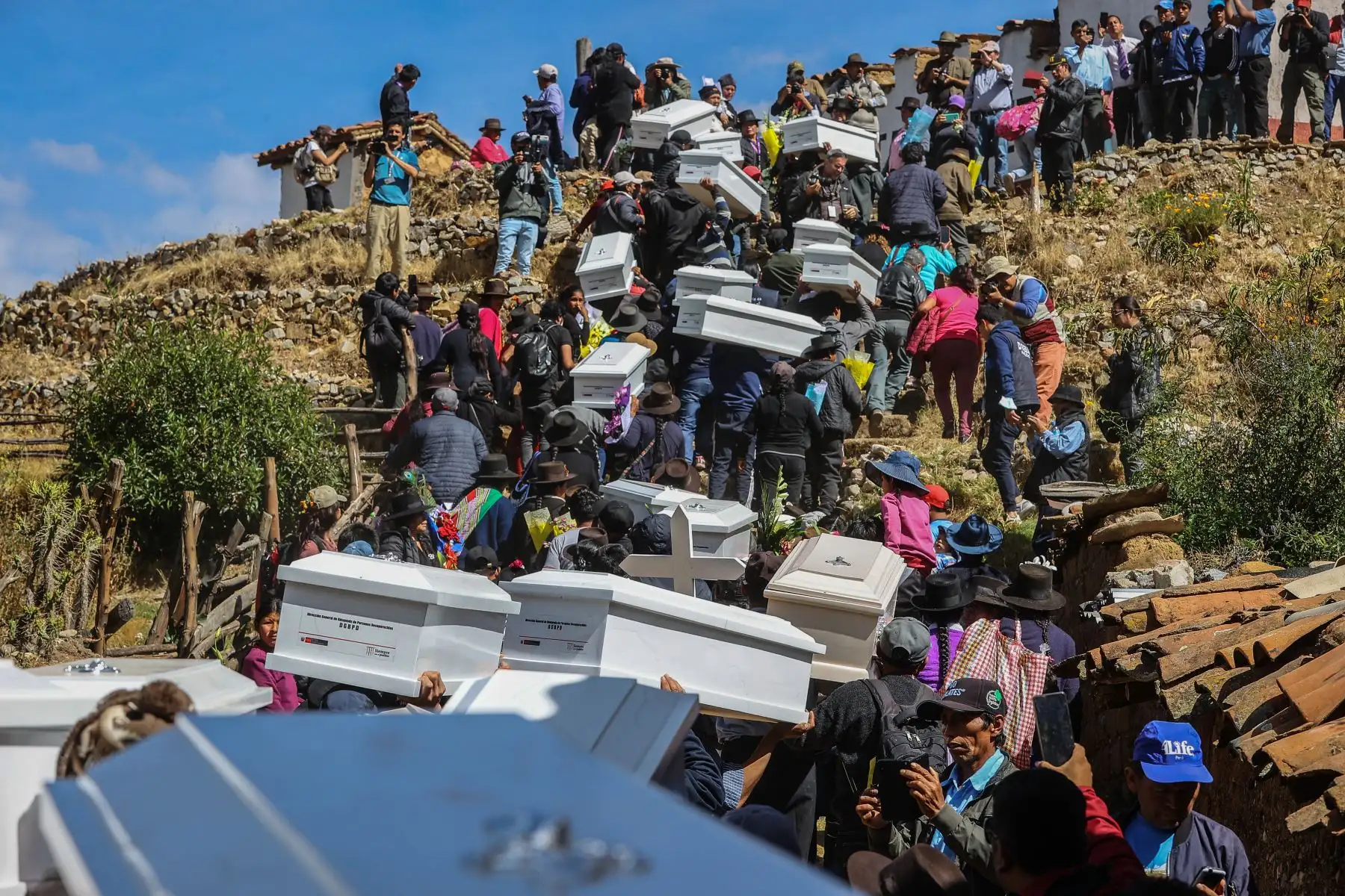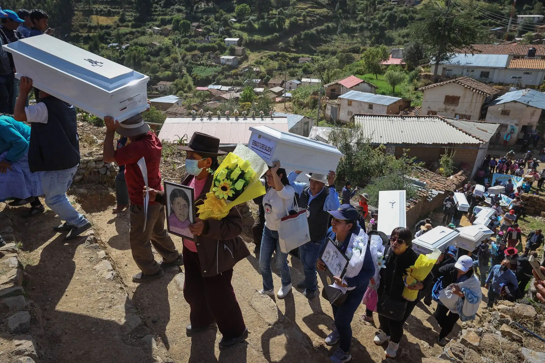 Familiares de las víctimas y las autoridades  inician el cortejo fúnebre hacía el santuario ubicado en la ex base militar de Accomarca, para darles una sepultura digna.