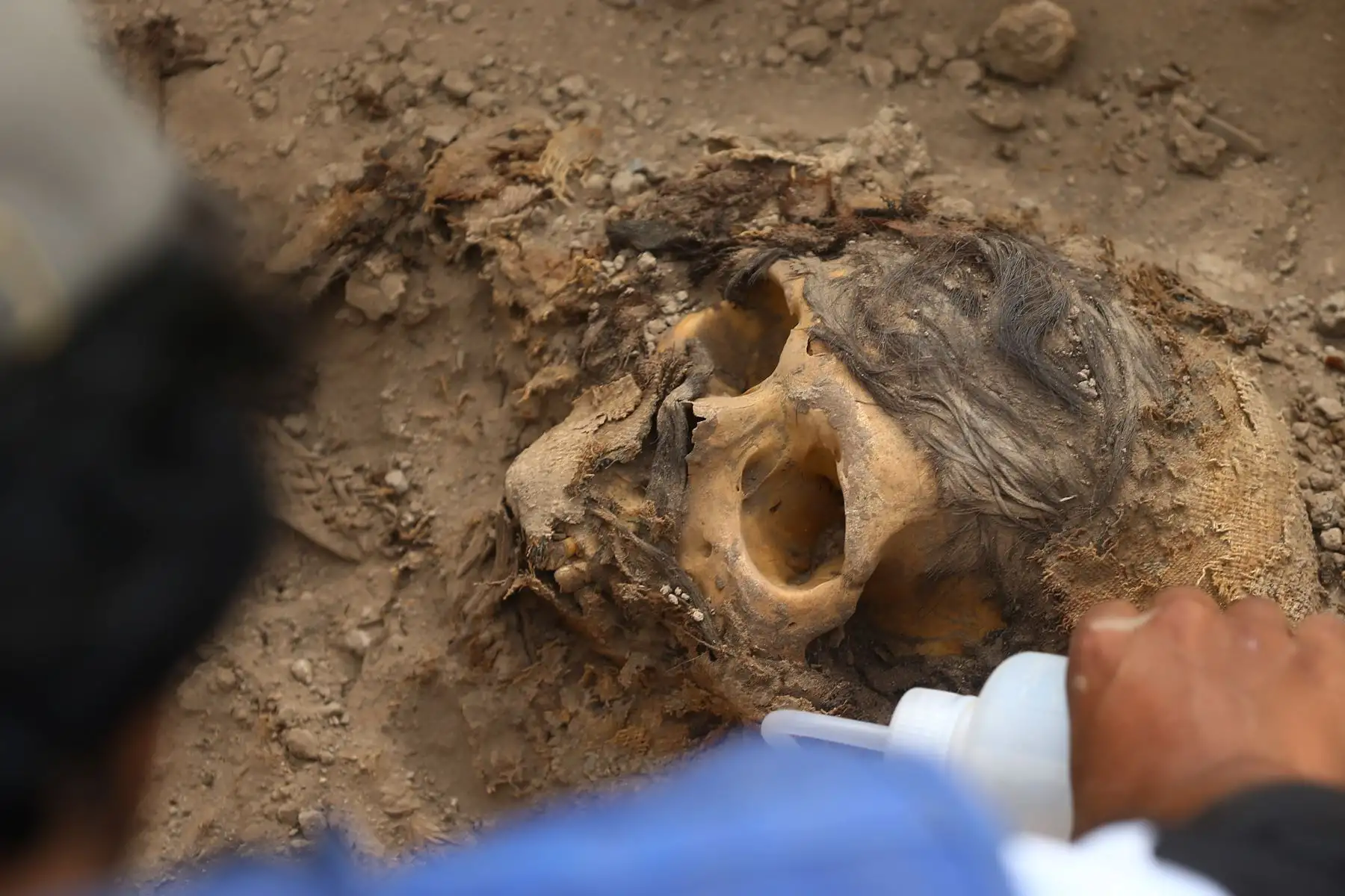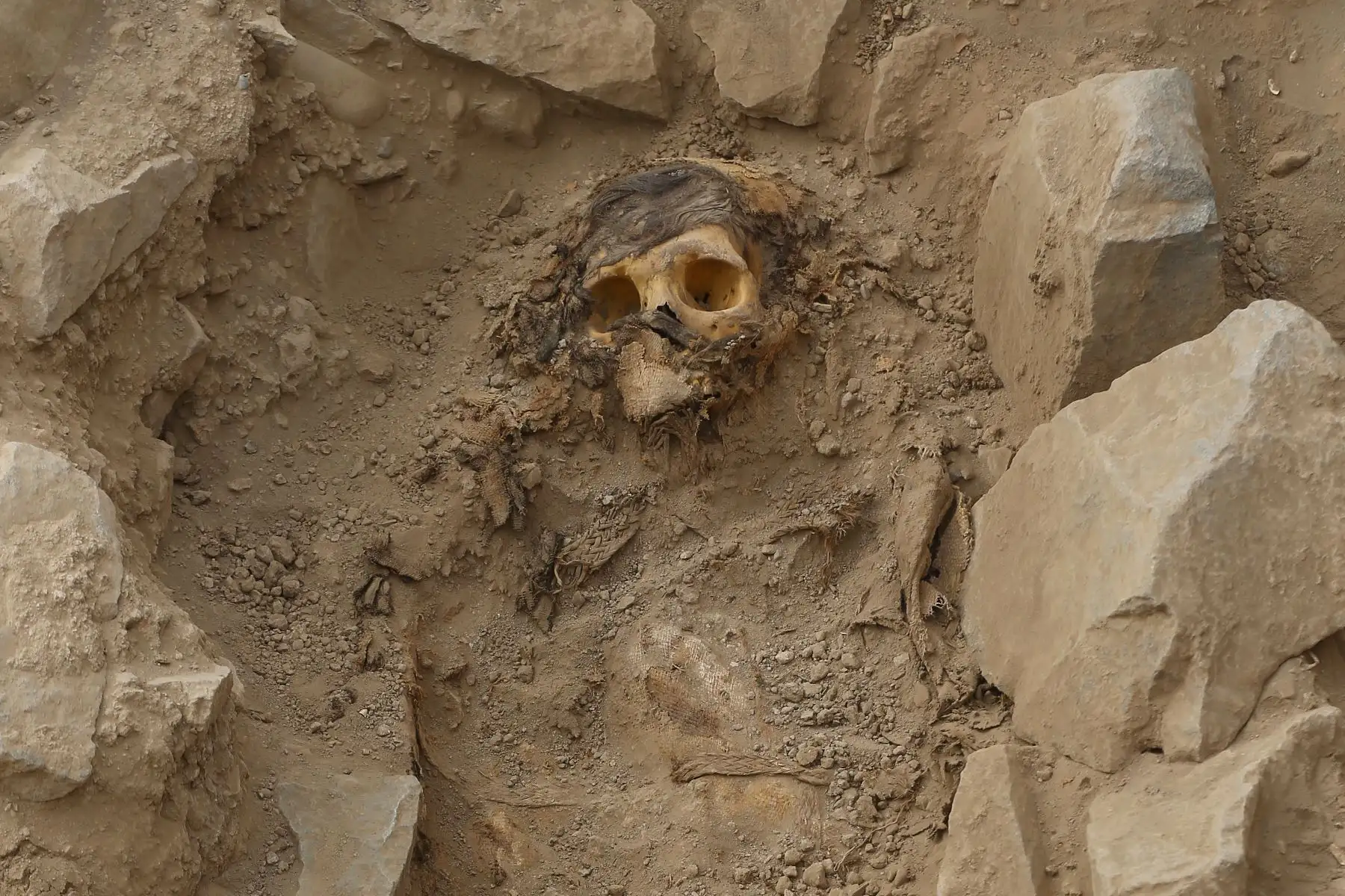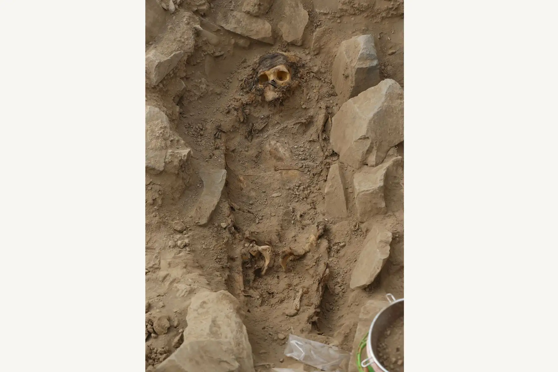 13/06/2023 Inicialmente los investigadores encontraron indicios de pedazos de cabellos, y posteriormente el cráneo y la tumba de piedra, envuelta en un fardo funerario elaborado en algodón nativo, amarrado entre cañas entrelazadas, con restos como cuellos de botellas, cuencas de collar, maíz, conchas, mariscos, hojas de coca, y semillas, que evidencian que fueron depositadas como ofrendas post muerte; que se presume provengan del 1100 a.c. al 1400 a.c.).
