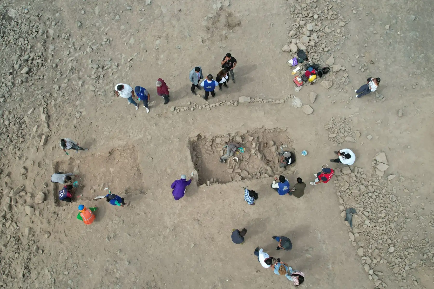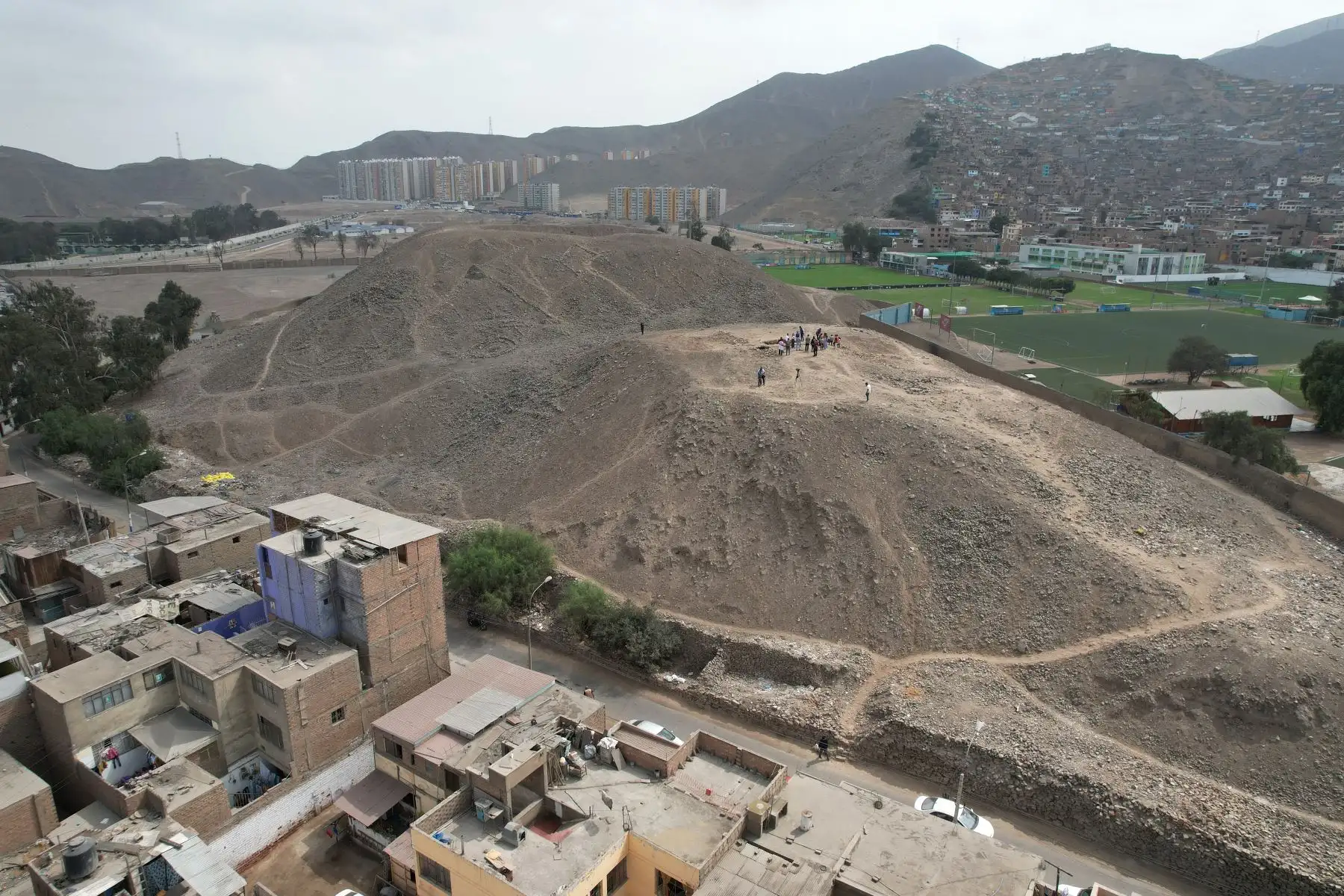 13/06/2023 Una momia que aparenta ser un varón de más de 3 mil años, envuelto en un fardo funerario, fue hallada en la huaca La Florida, durante los trabajos de excavación que realizan investigadores de la Municipalidad del Rímac y estudiantes de arqueología de la Universidad Nacional Mayor de San Marcos (UNMSM). Imagen con dron.