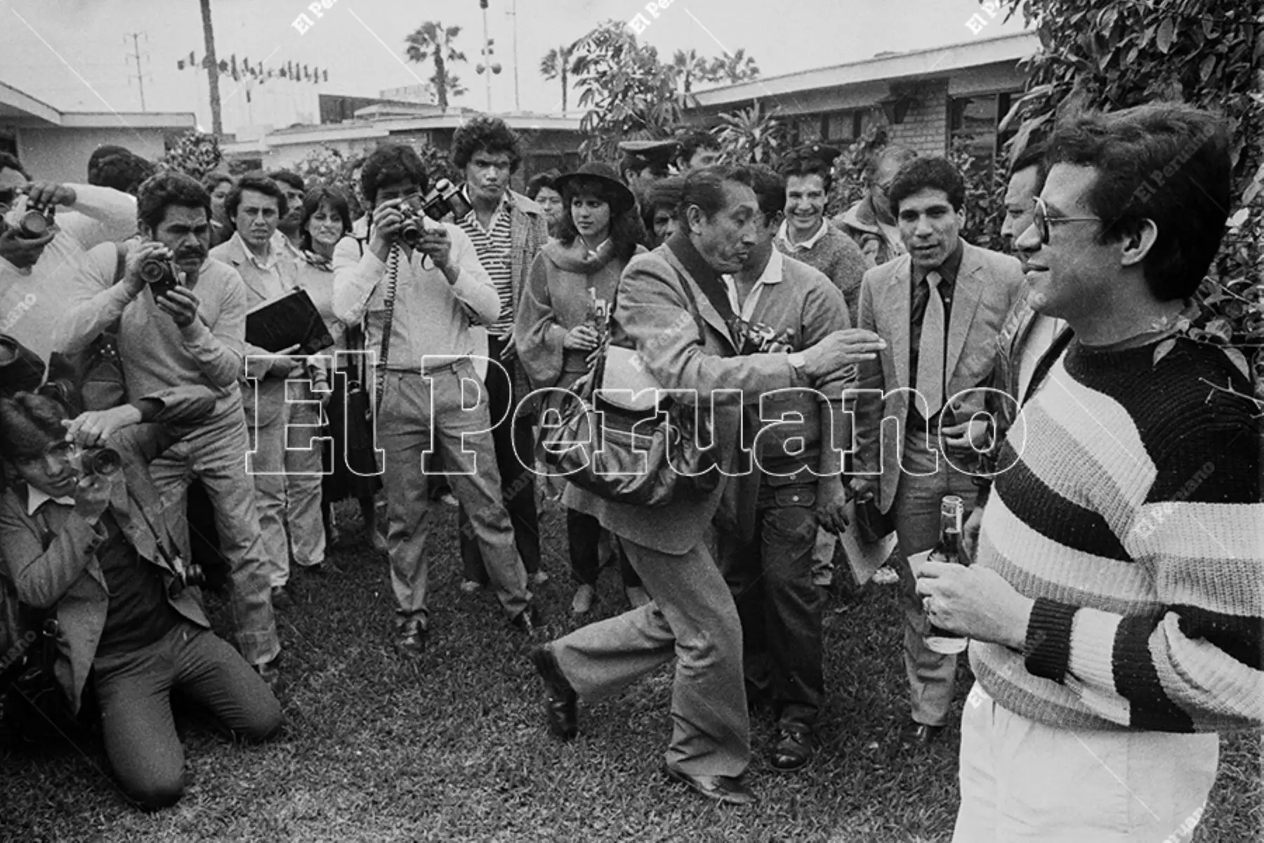 30/09/2025 Lima - 5 agosto 1986 / El cantante Héctor Lavoe con un grupo de admiradores y periodistas luego de la conferencia de prensa donde alcanzó detalles de sus próximas presentaciones en el super estelar de la Feria del Hogar.