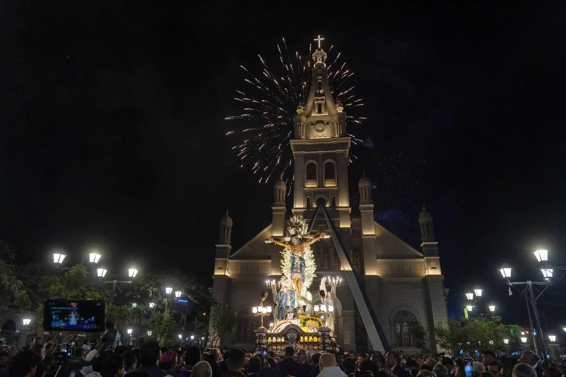 22/10/2024 En su primer recorrido procesional, el Señor de Luren, viste un sudario de color verde con detalles de mostacillas y piedras preciosas y la tela fue traída desde Marruecos. Foto: Genry Bautista